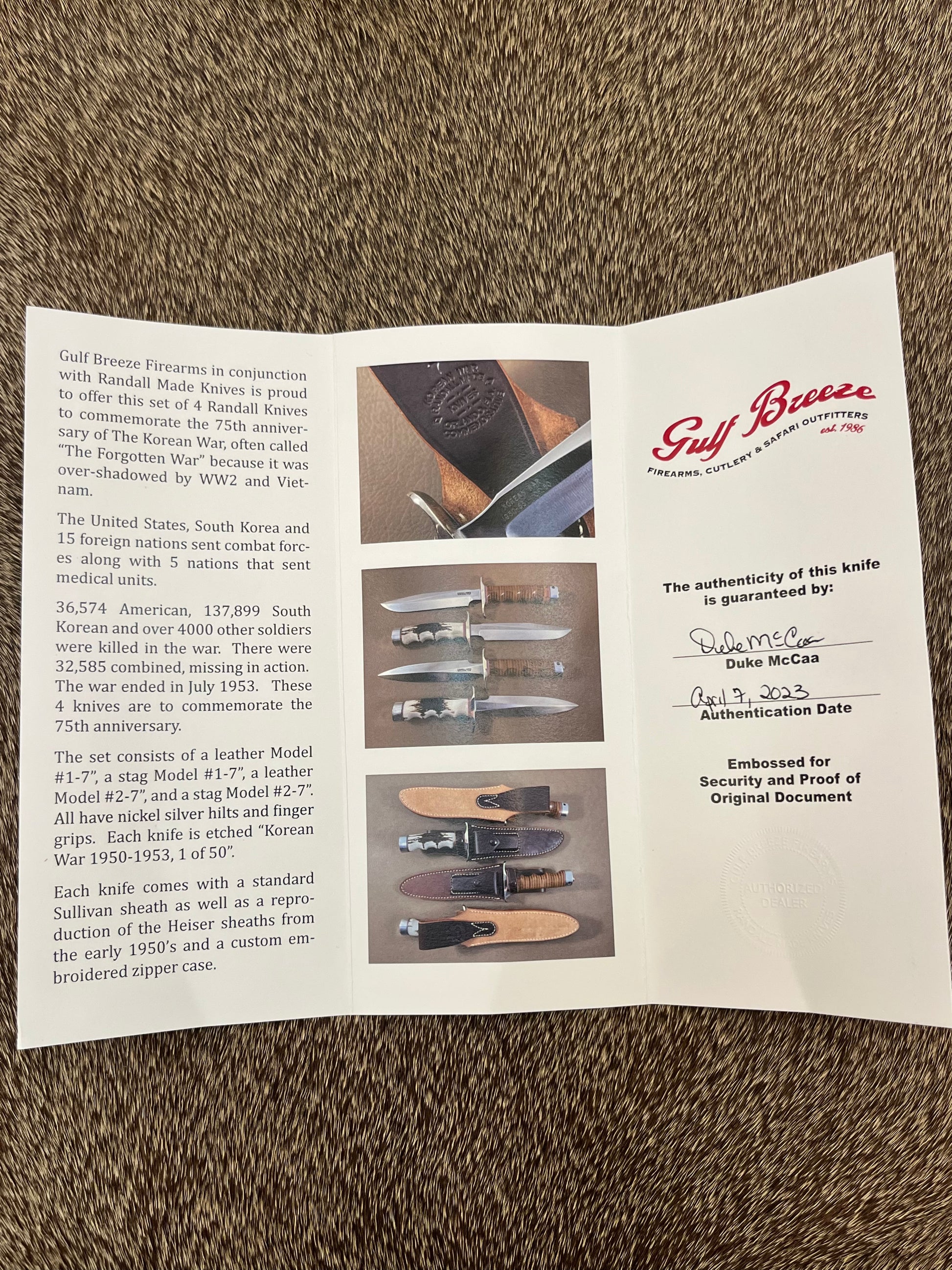 New in paper Randall Model 1-7 75th Anniversary Korean War Commemorative. This is a special set made by Randall with only 50 four knife sets made. I am breaking up the set so as to provide interest in specific models.