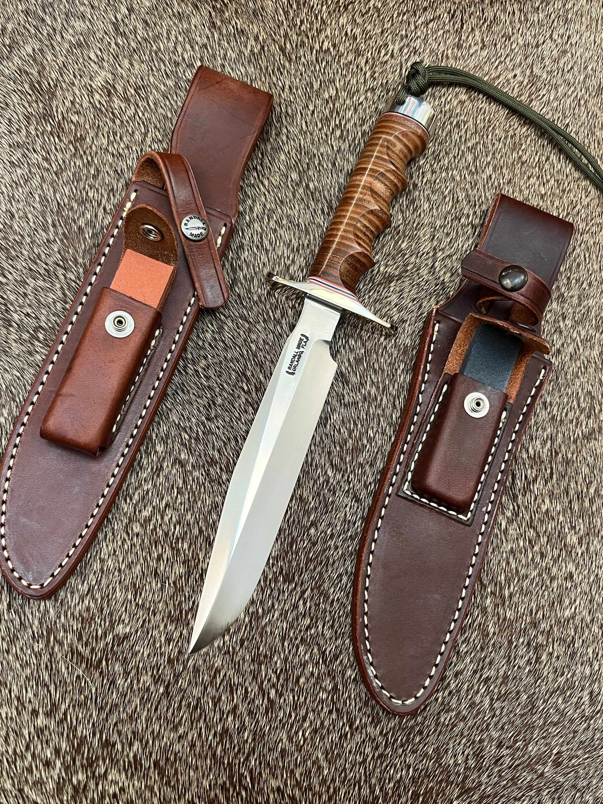 • new brown leather rough back commemorative sheath with grey sharpening stone and original Sullivan’s leather with salmon sharpening stone