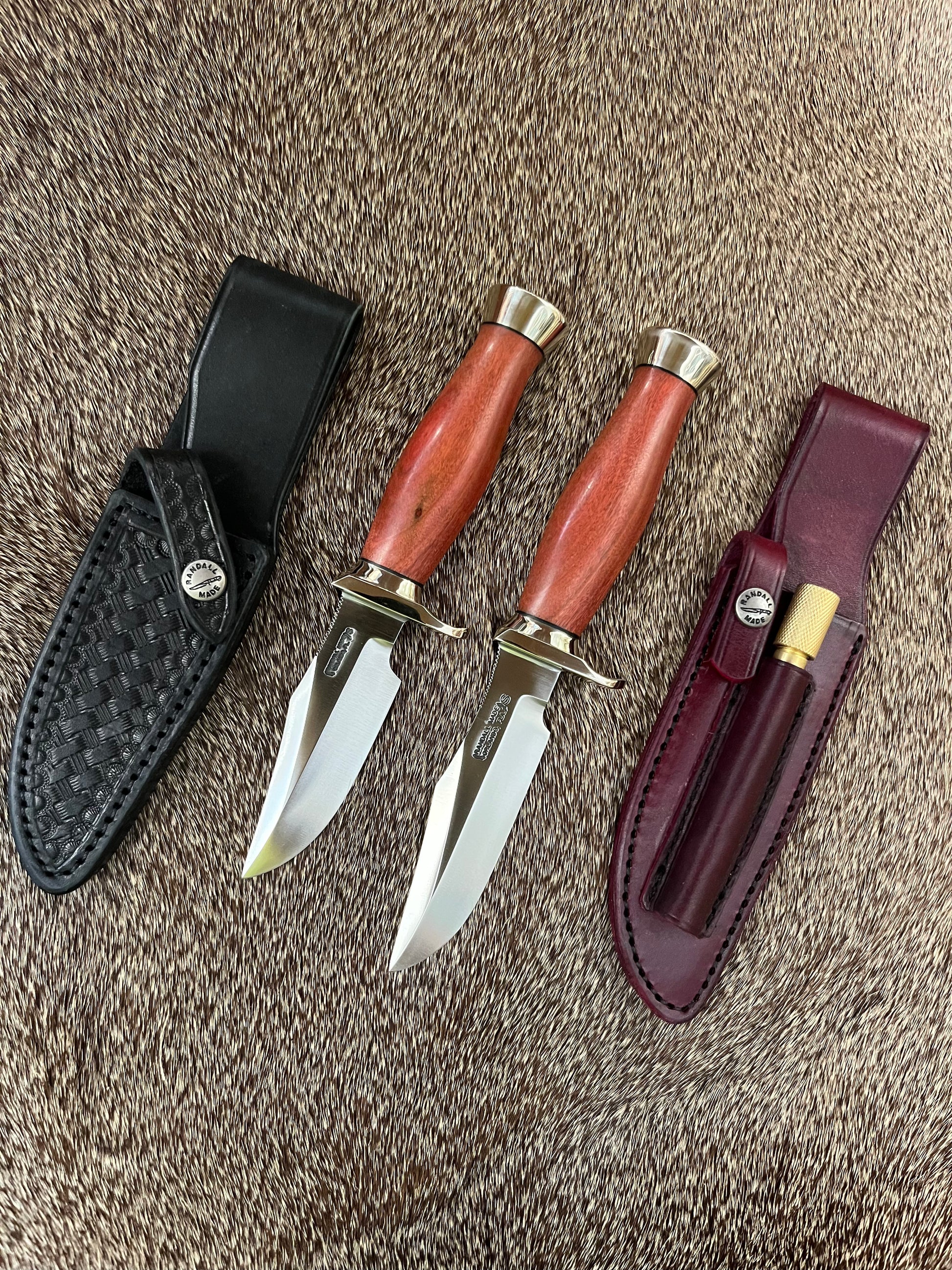 Large knife has a Ox Blood sheath with a E-Z lap Sharper, Small knife has a Black Basket Weave Sheath with a Salmon Sharpening Stone, both are original from Sullivan’s Custom Leather Shop