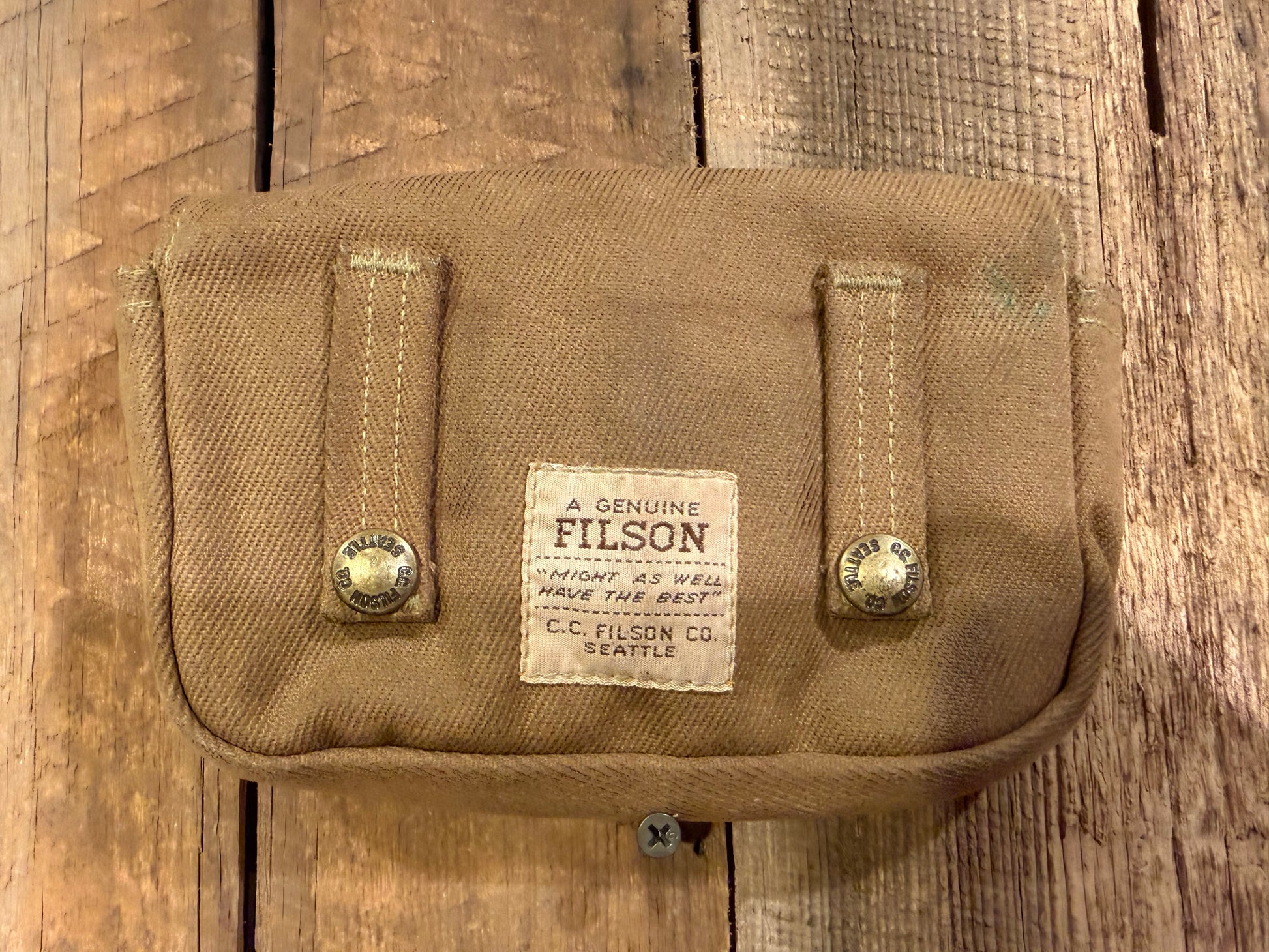 Rare item. Long since discontinued Filson shotgun choke tube bag in twill cloth. Nearly indestructible. Meant to hold 4 -6 shells or barrel chokes, exceedingly rare to find.