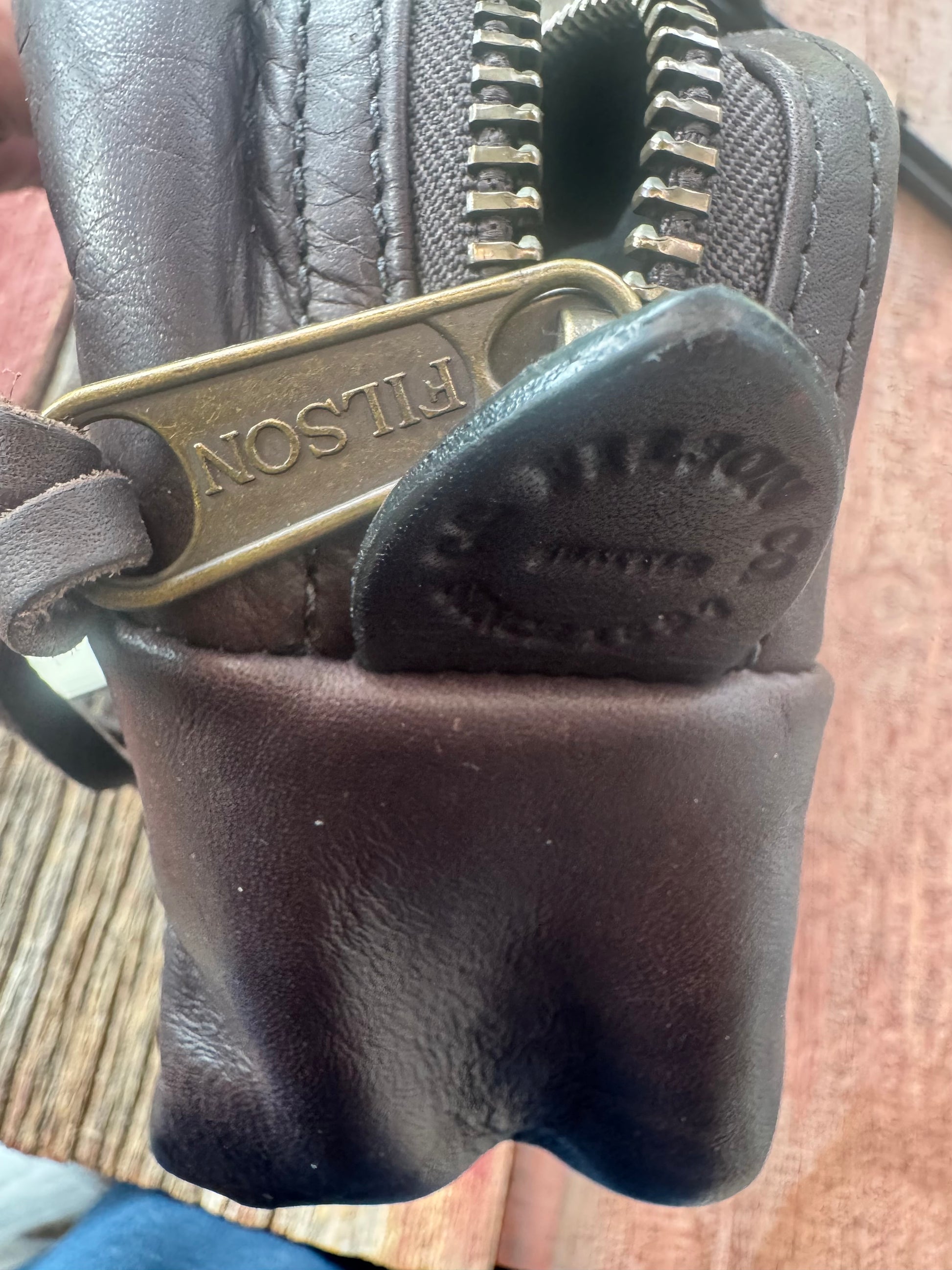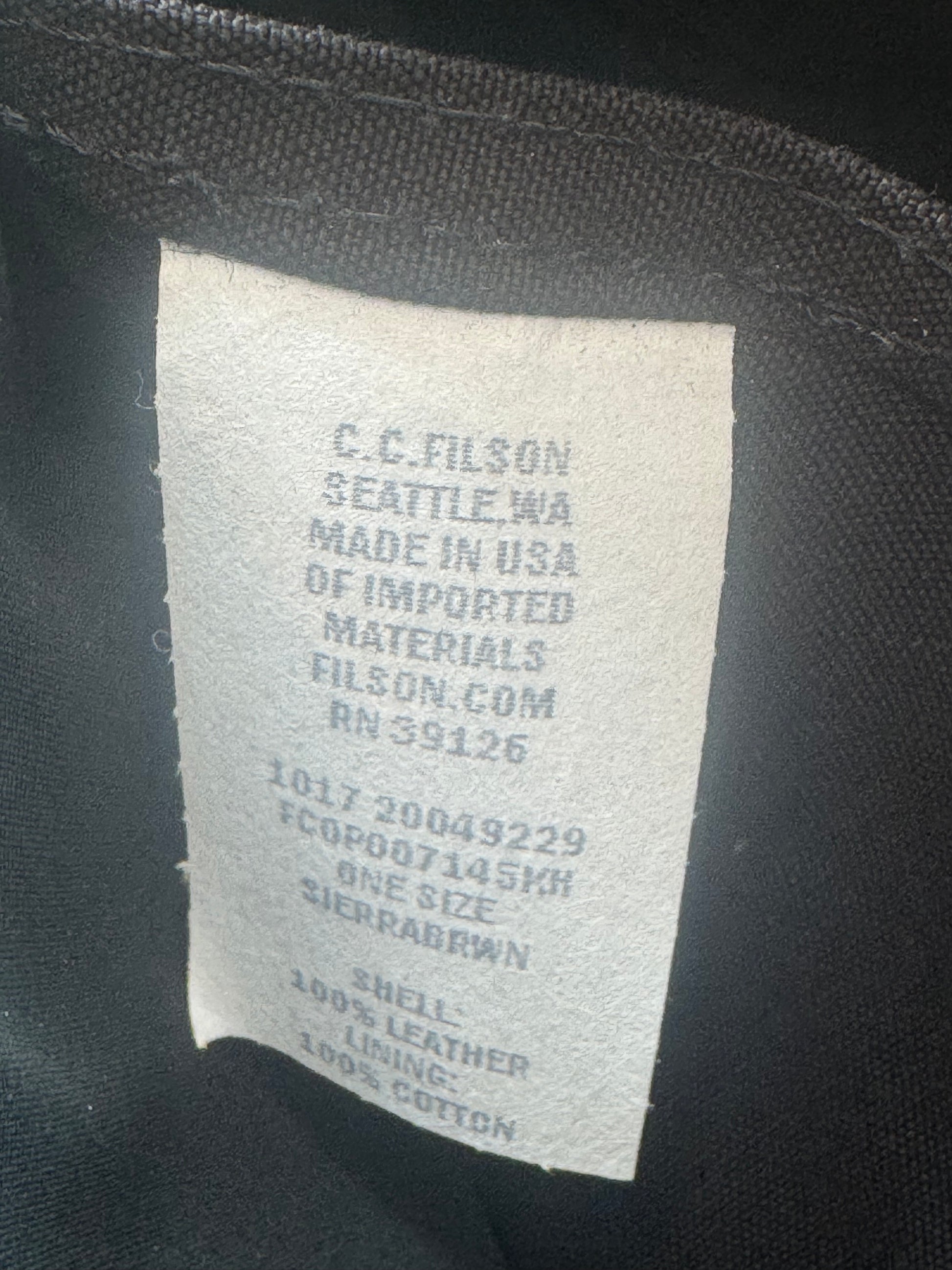 - Branded, solid brass hardware and iconic Filson Bridle Leather body tabs
