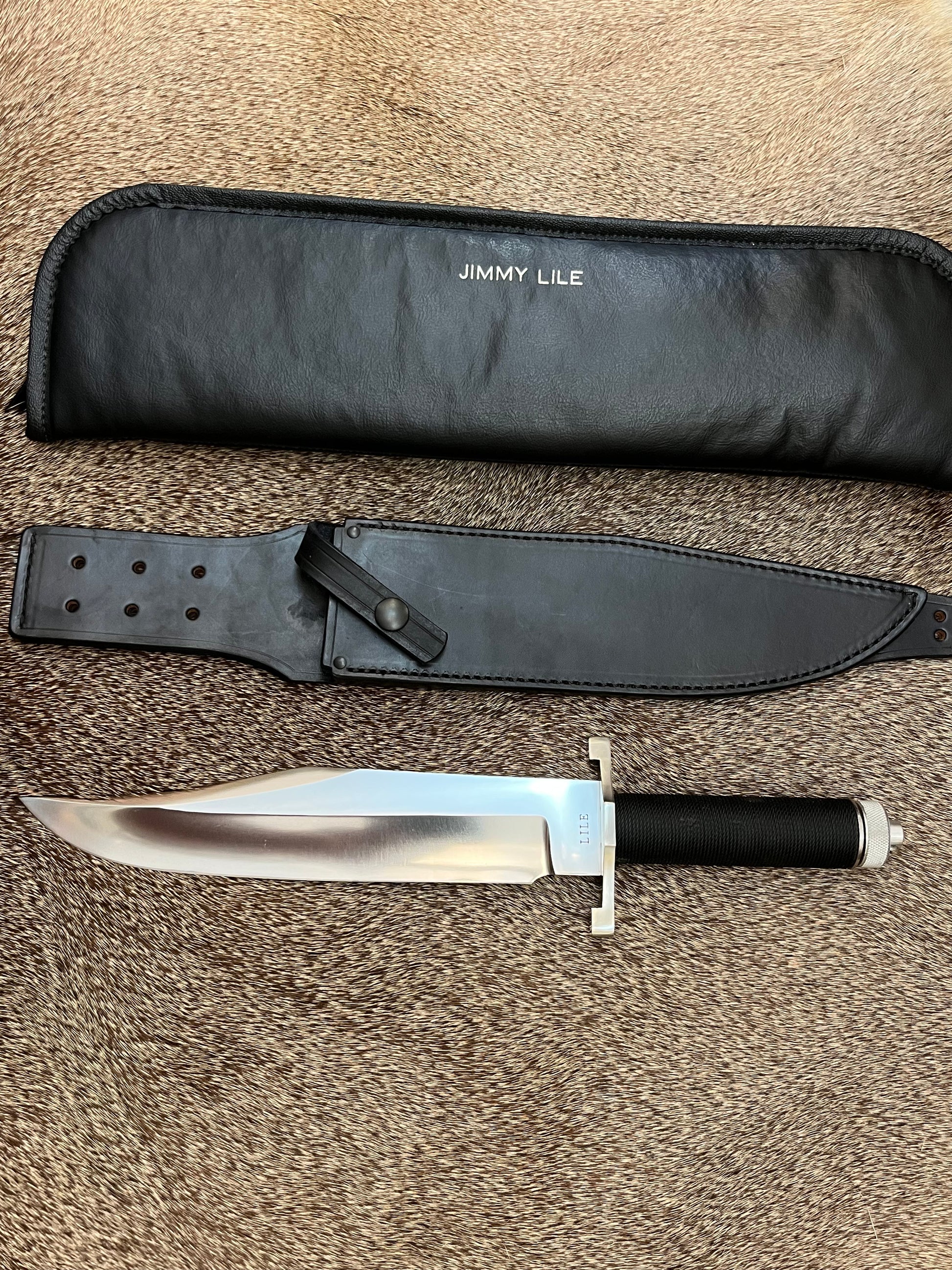 The knife and Sheath are in near mint to mint condition, it also comes with a early Vinyl Jimmy Lile Zipper Pouch