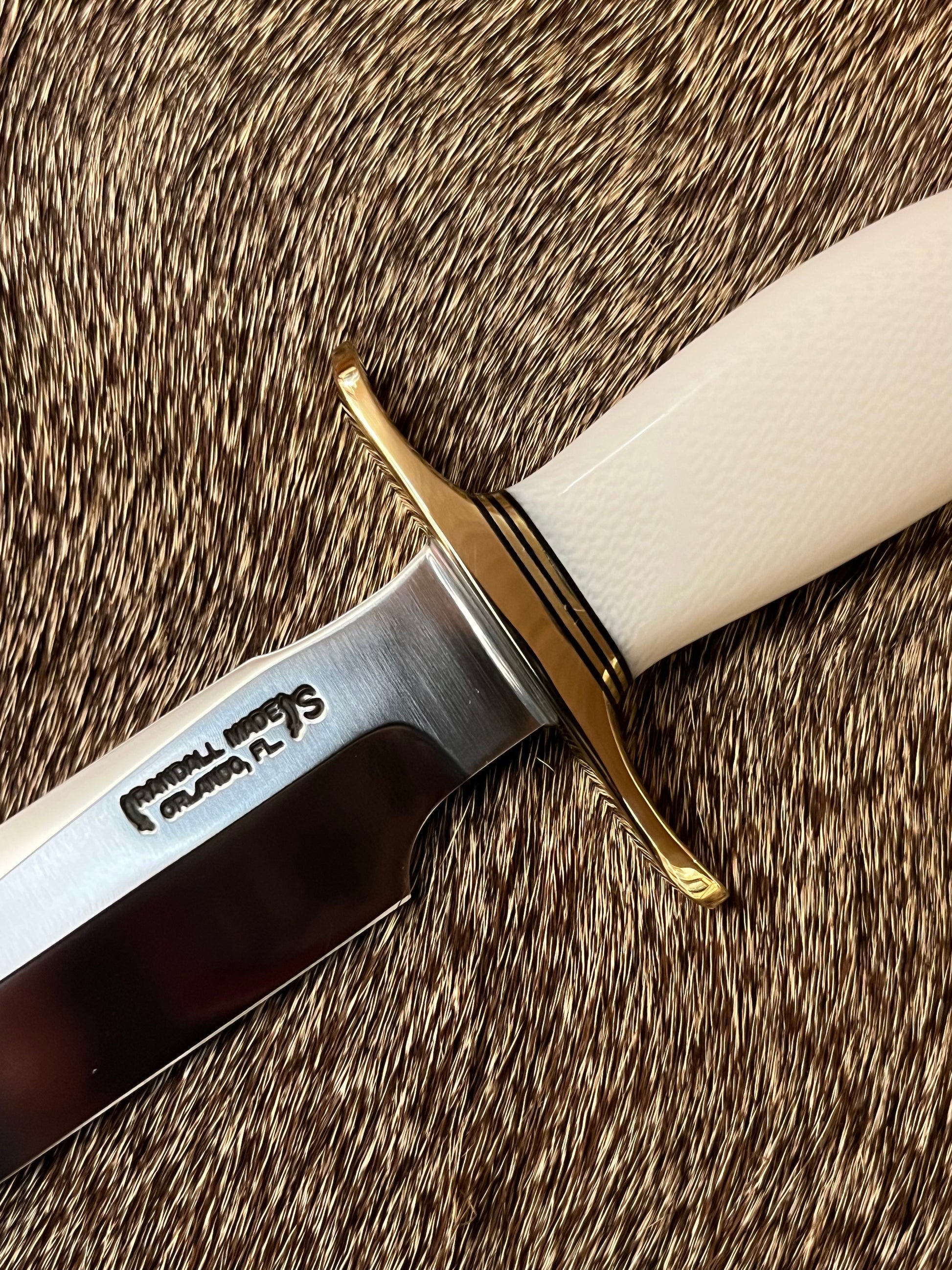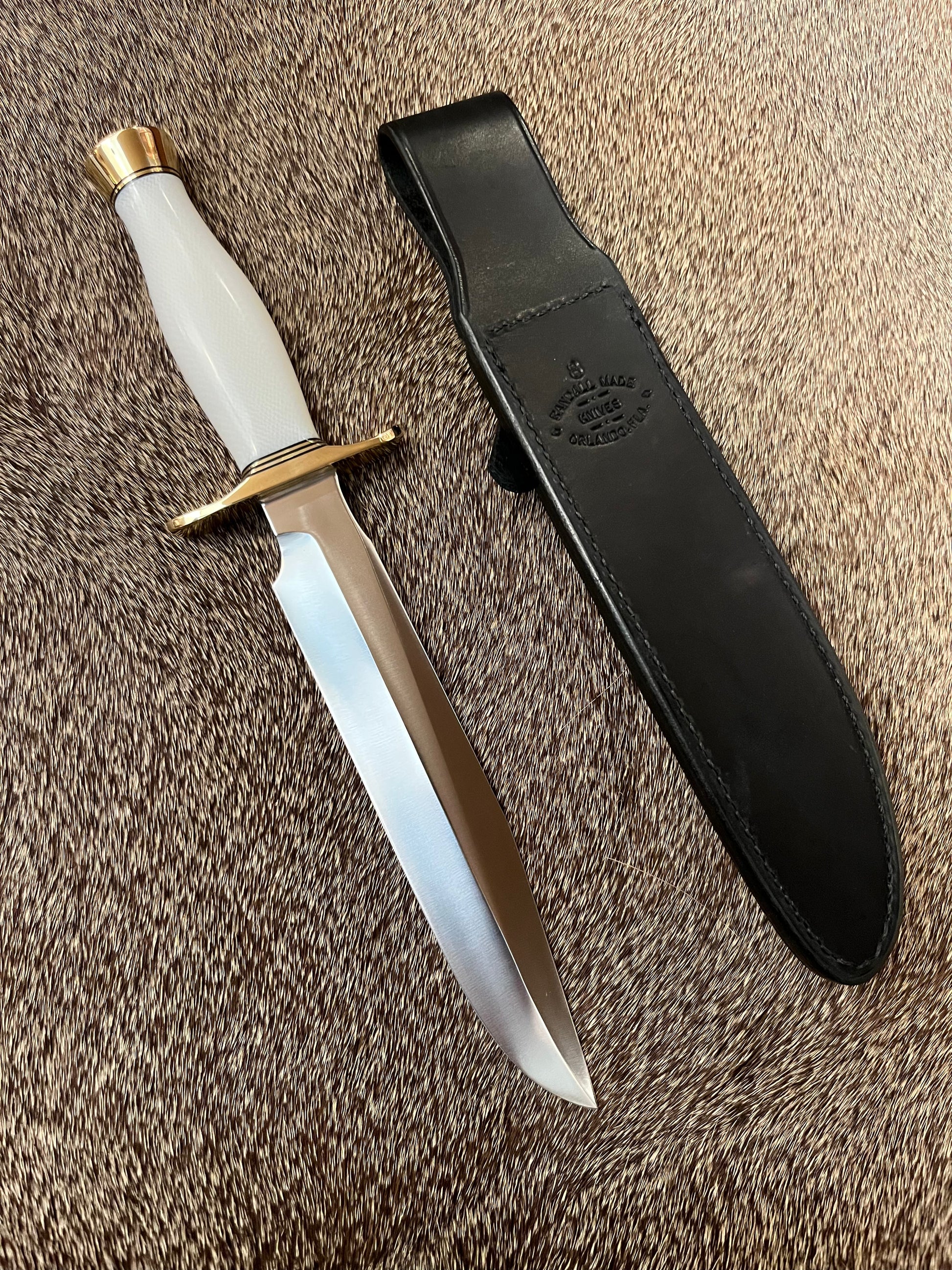 Comes with Original Black Leather Sheath made by Sullivan’s Custom Leather Shop, and has a Salmon Sharpening Stone