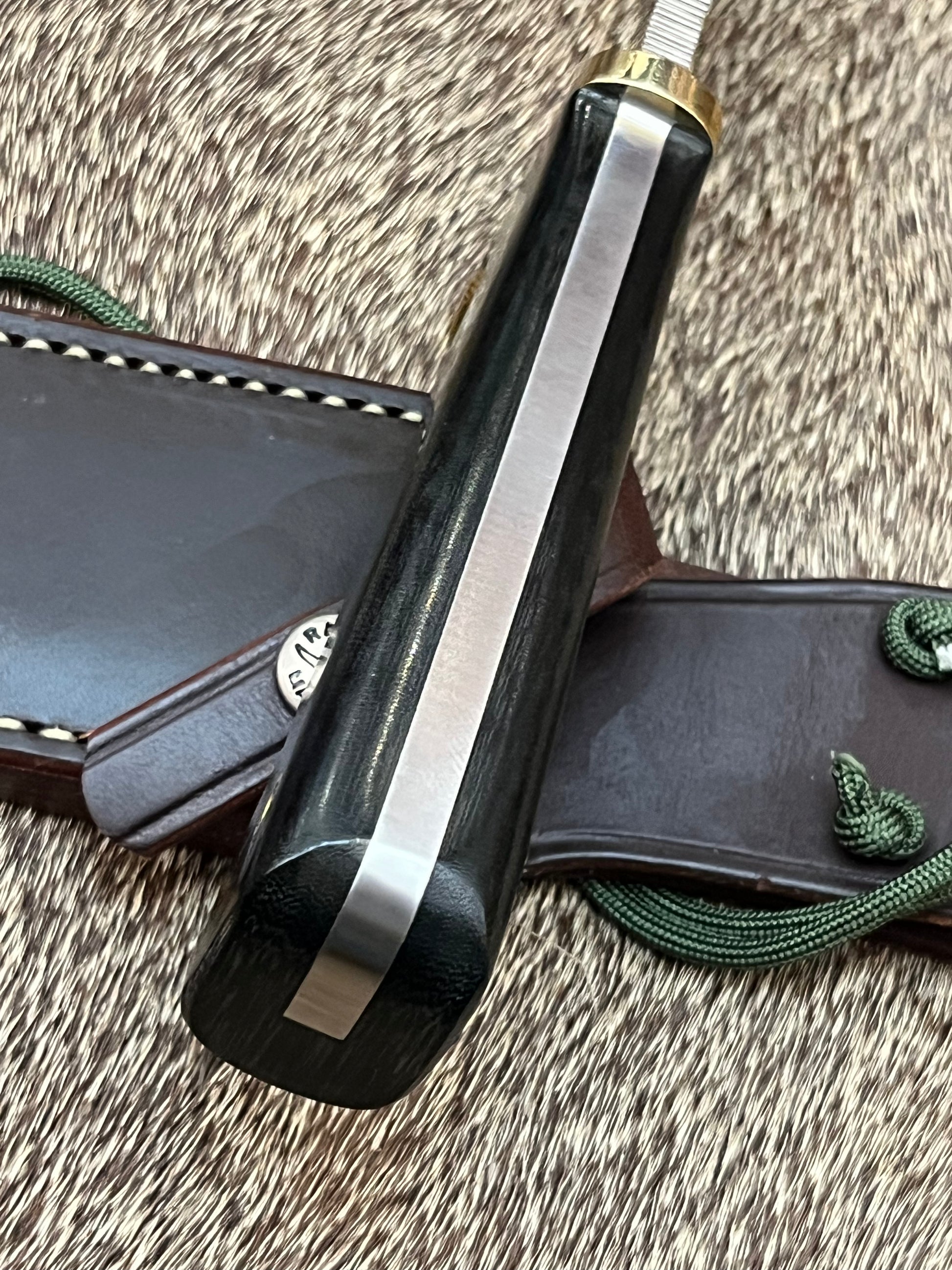 1/4” x 7” full tang stainless blade with thumb notches and thong hole