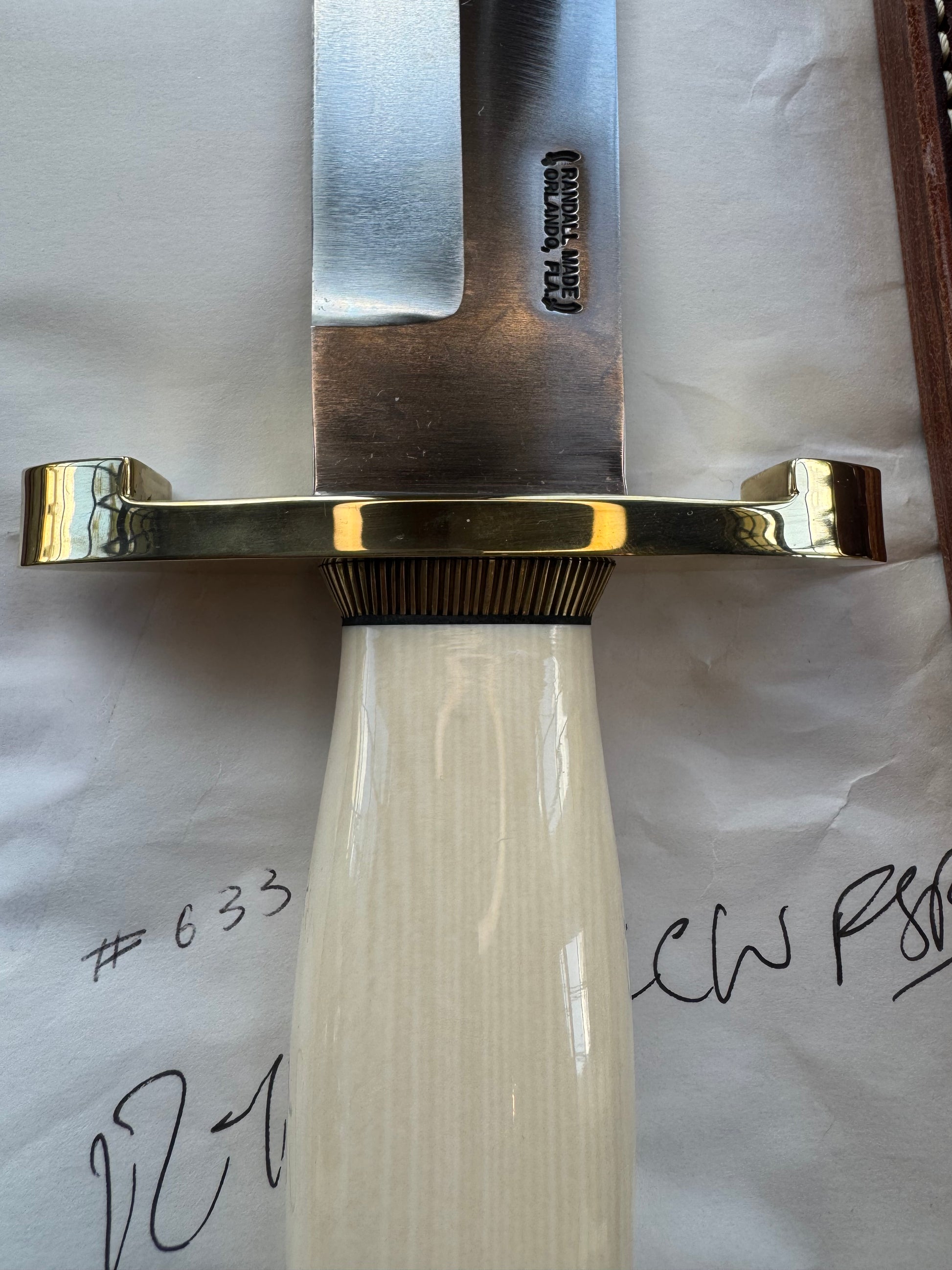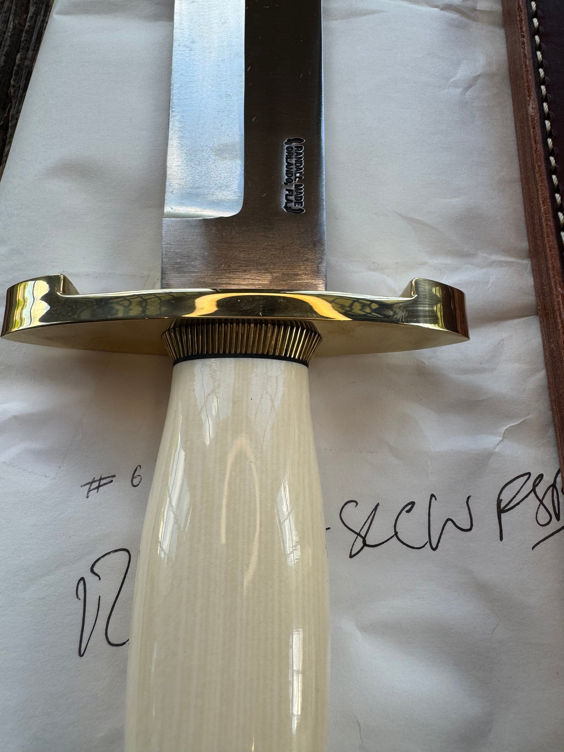 New in paper Randall Model 12-11 Confederate in a nice piece of customer supplied Dave Warthers Resin. Tactile feel and closely resembles E. Ivory. Comes with a Randall Leather sheath. There is currently a 5-6 year wait on Randall’s but good luck finding this one. This is a stunning knife !!