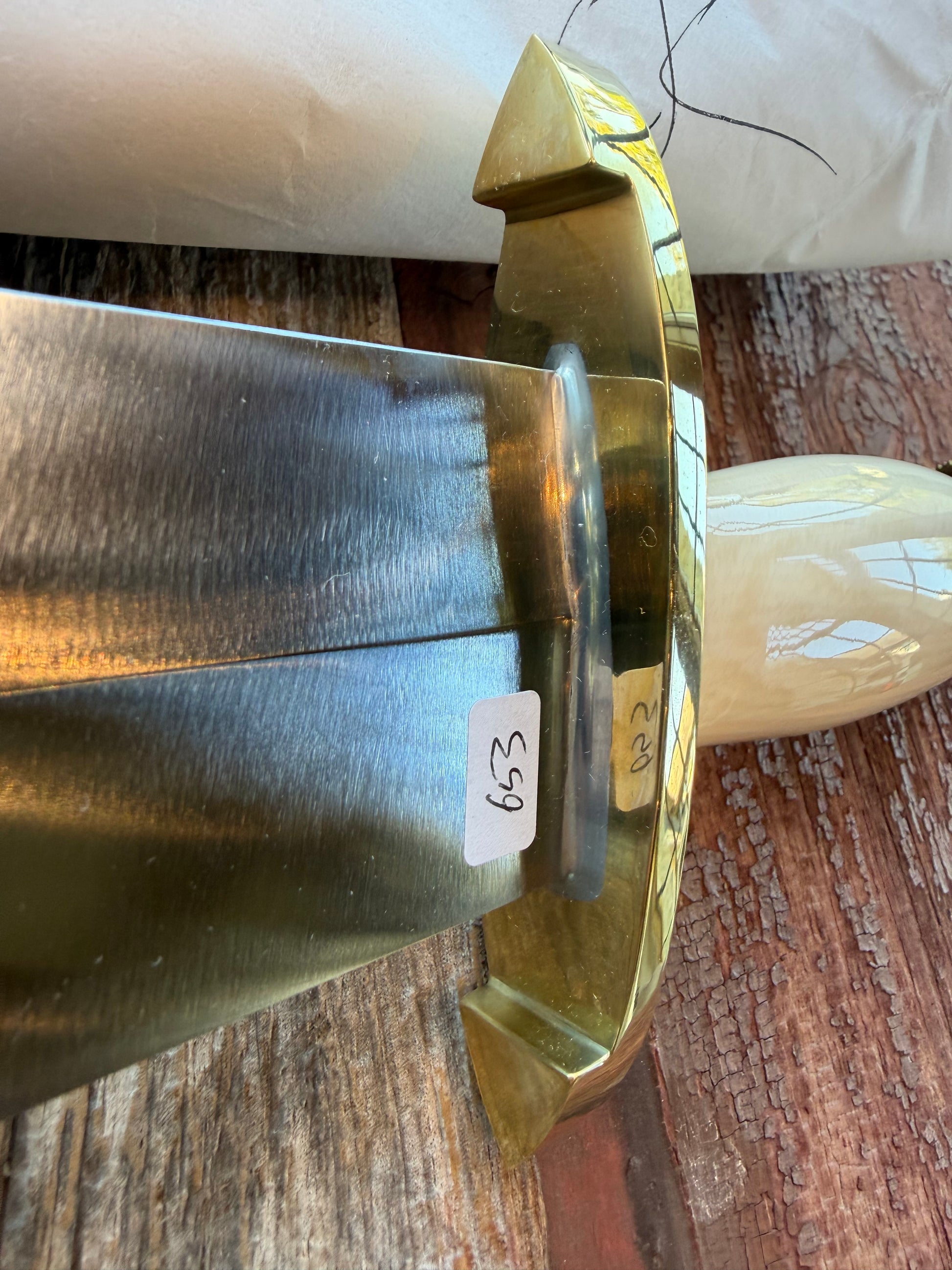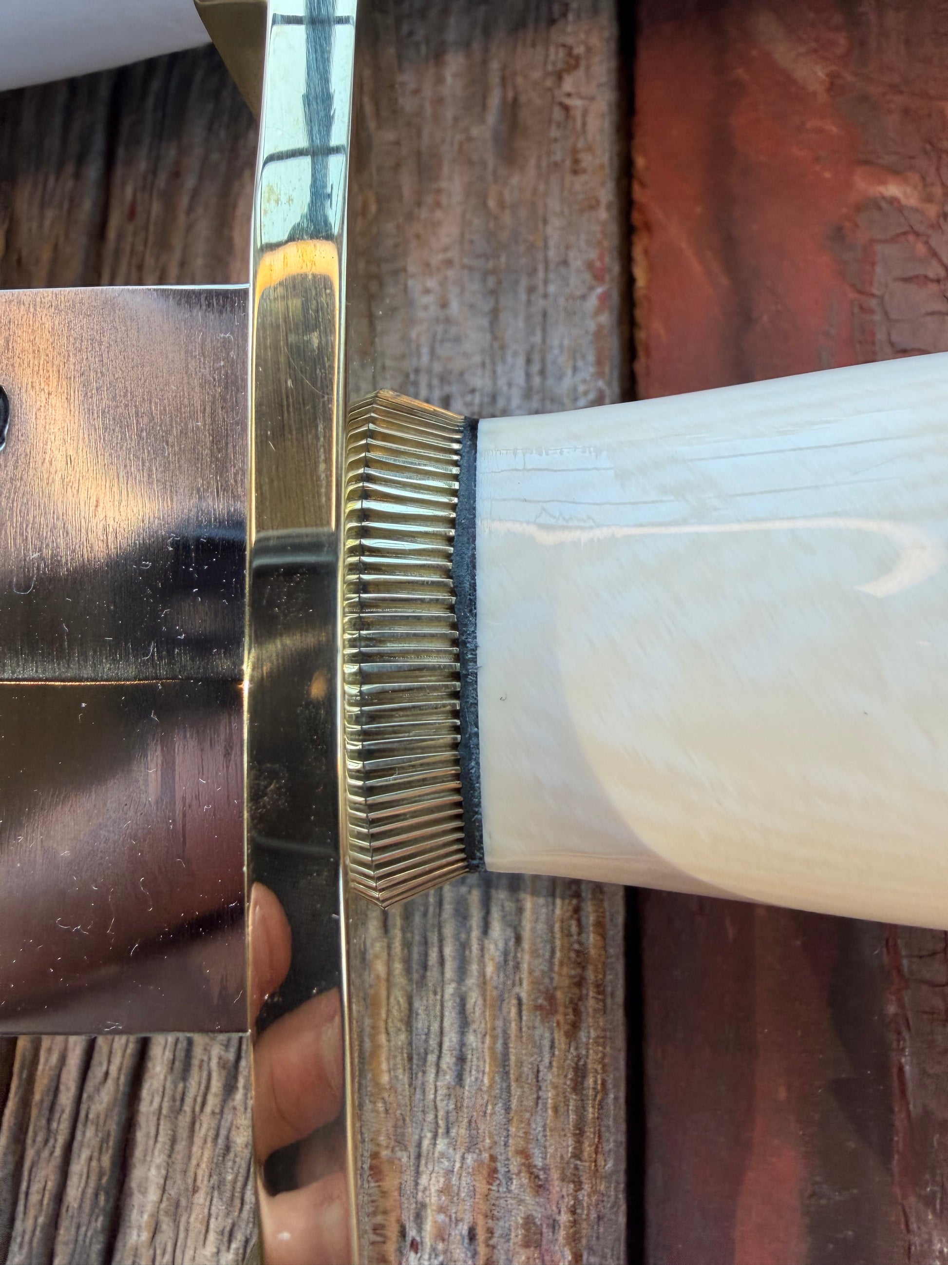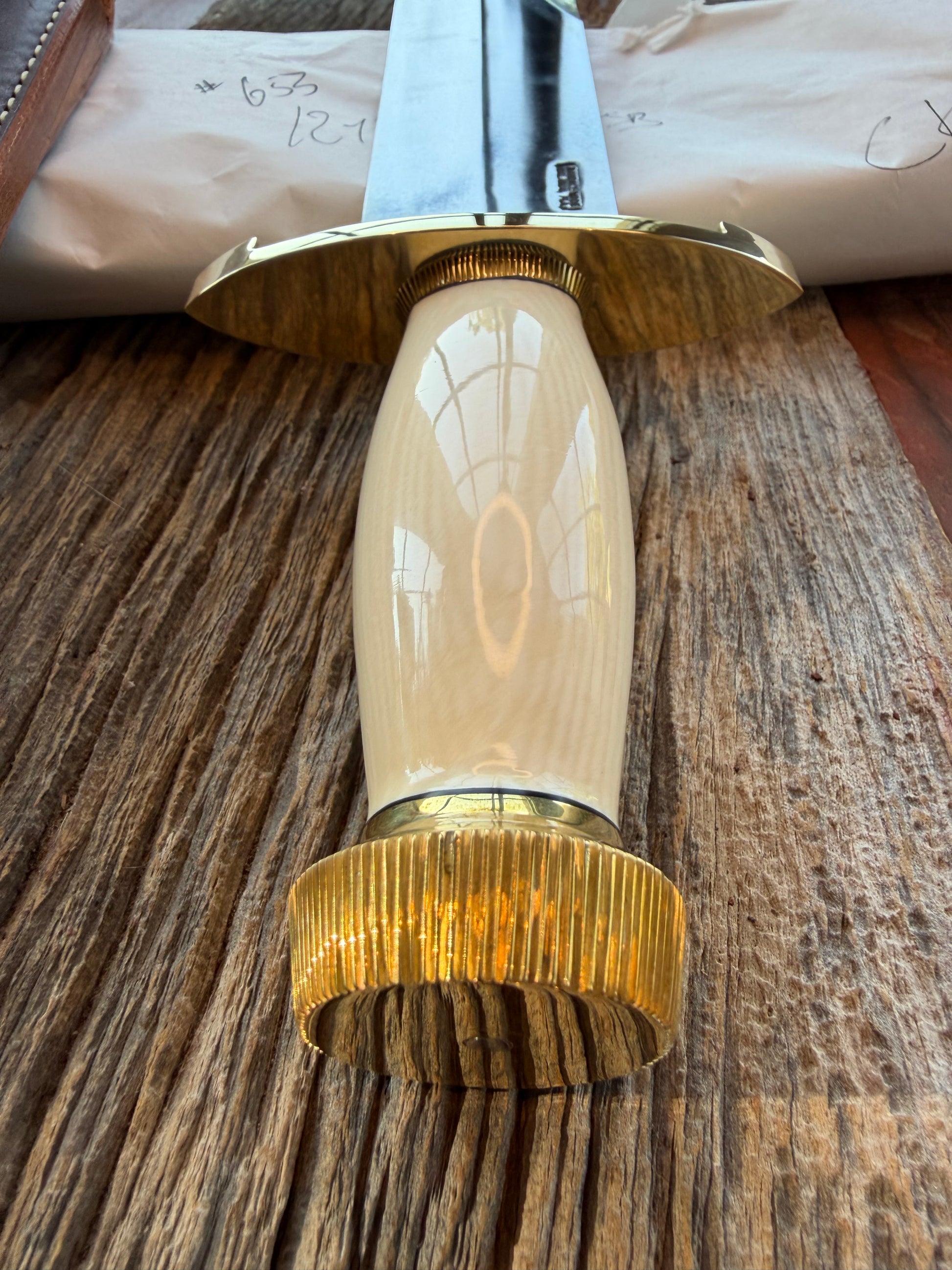 New in Paper Model 12-11 Smithsonian “ Smitty” Beautiful Dave Warthers Resin with a Brass Lugged hilt and Scalloped brass collar and scalloped coolie butt cap.