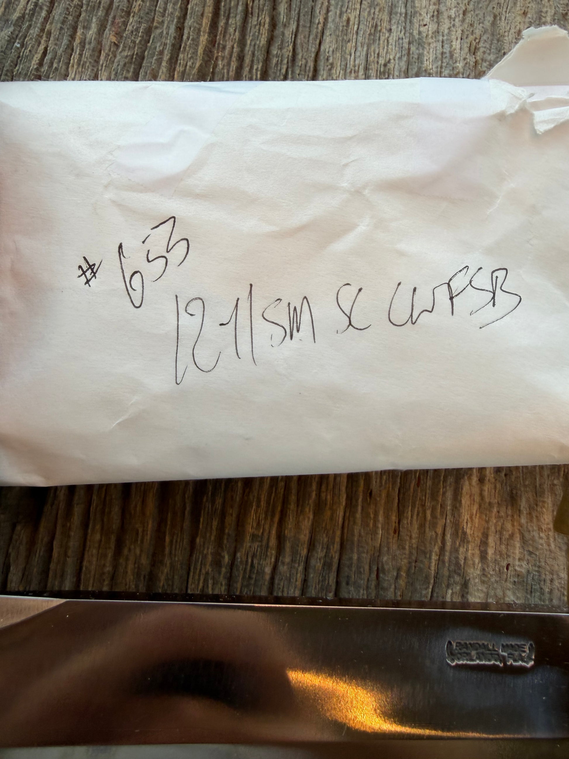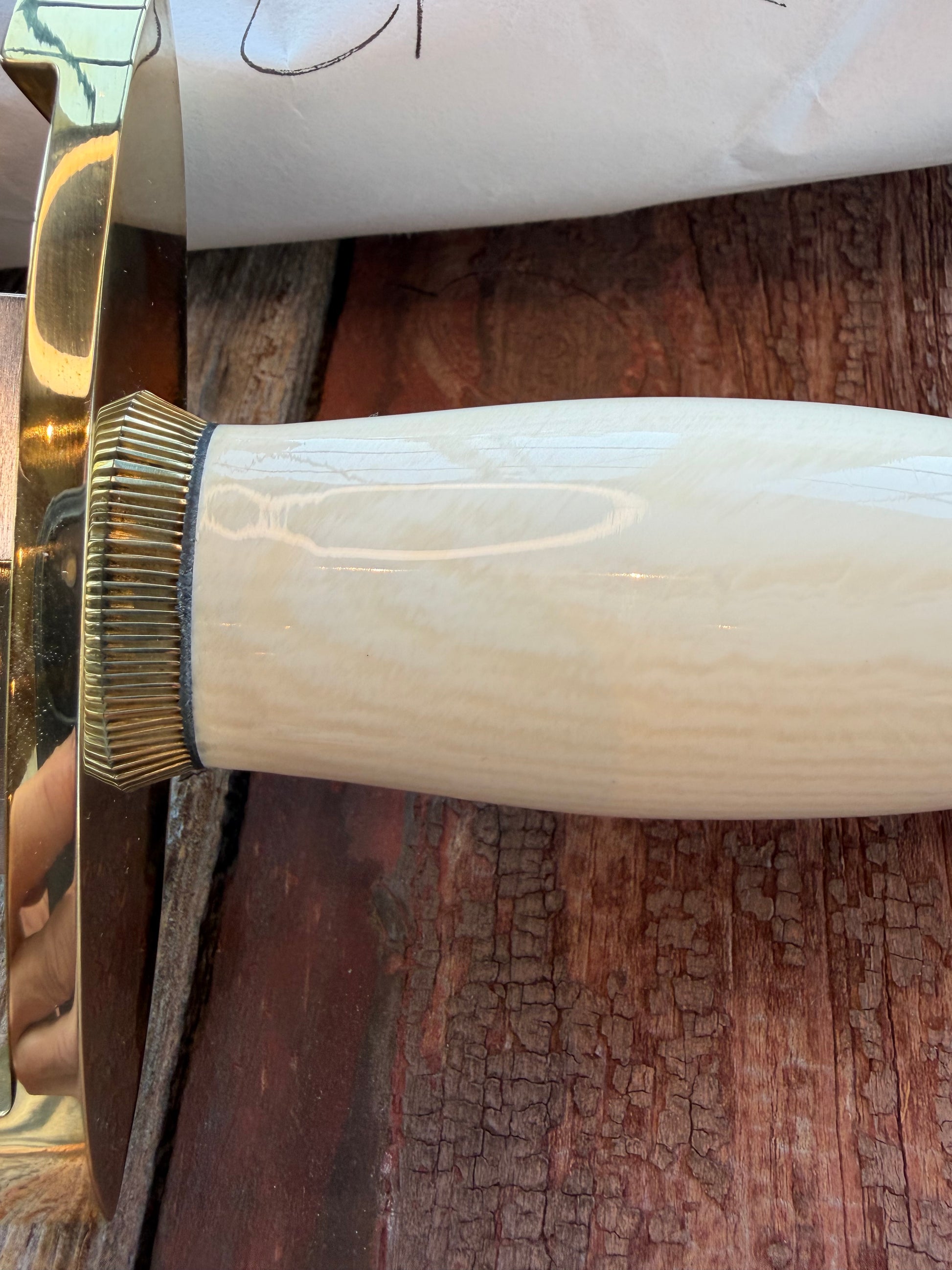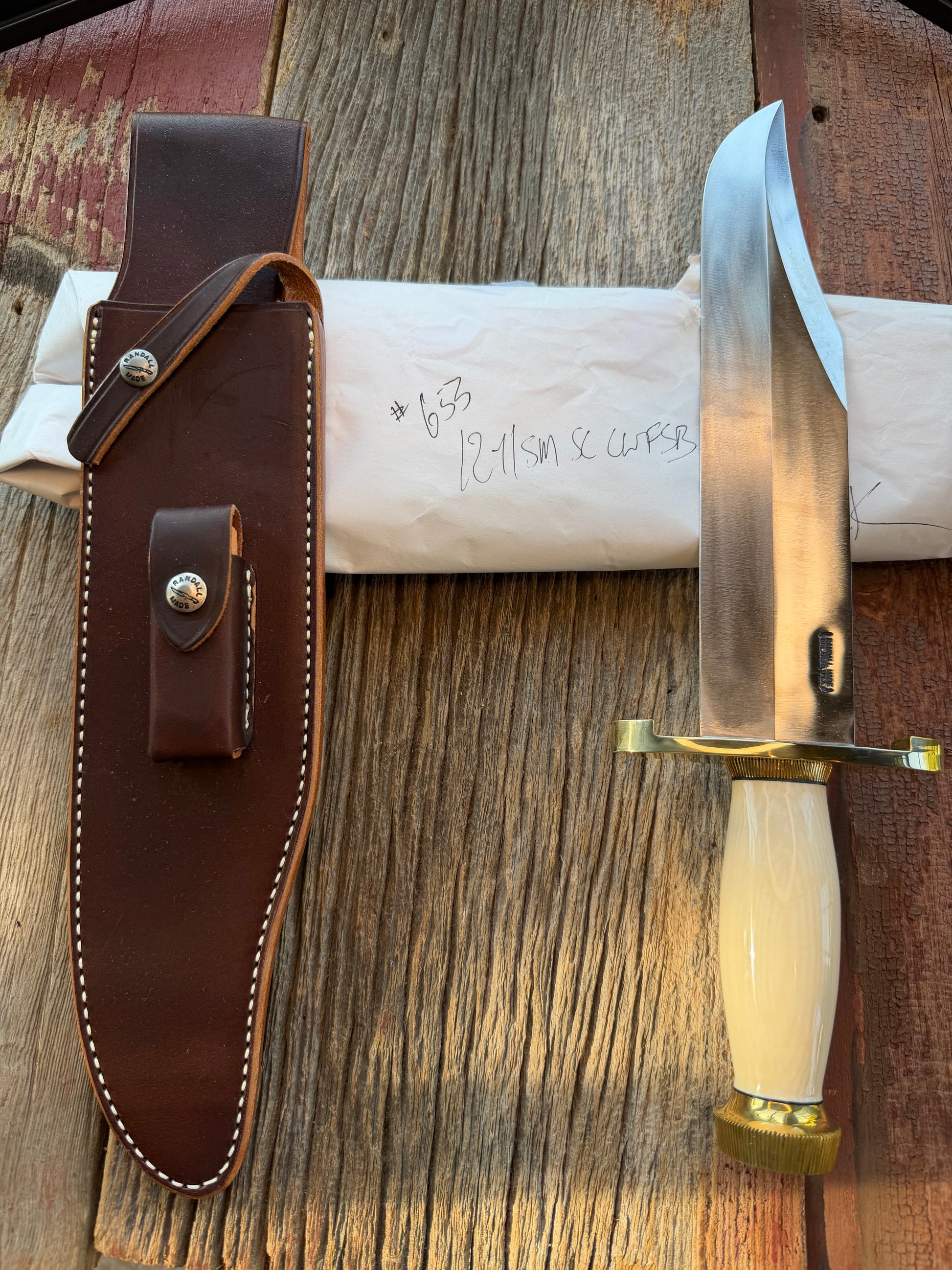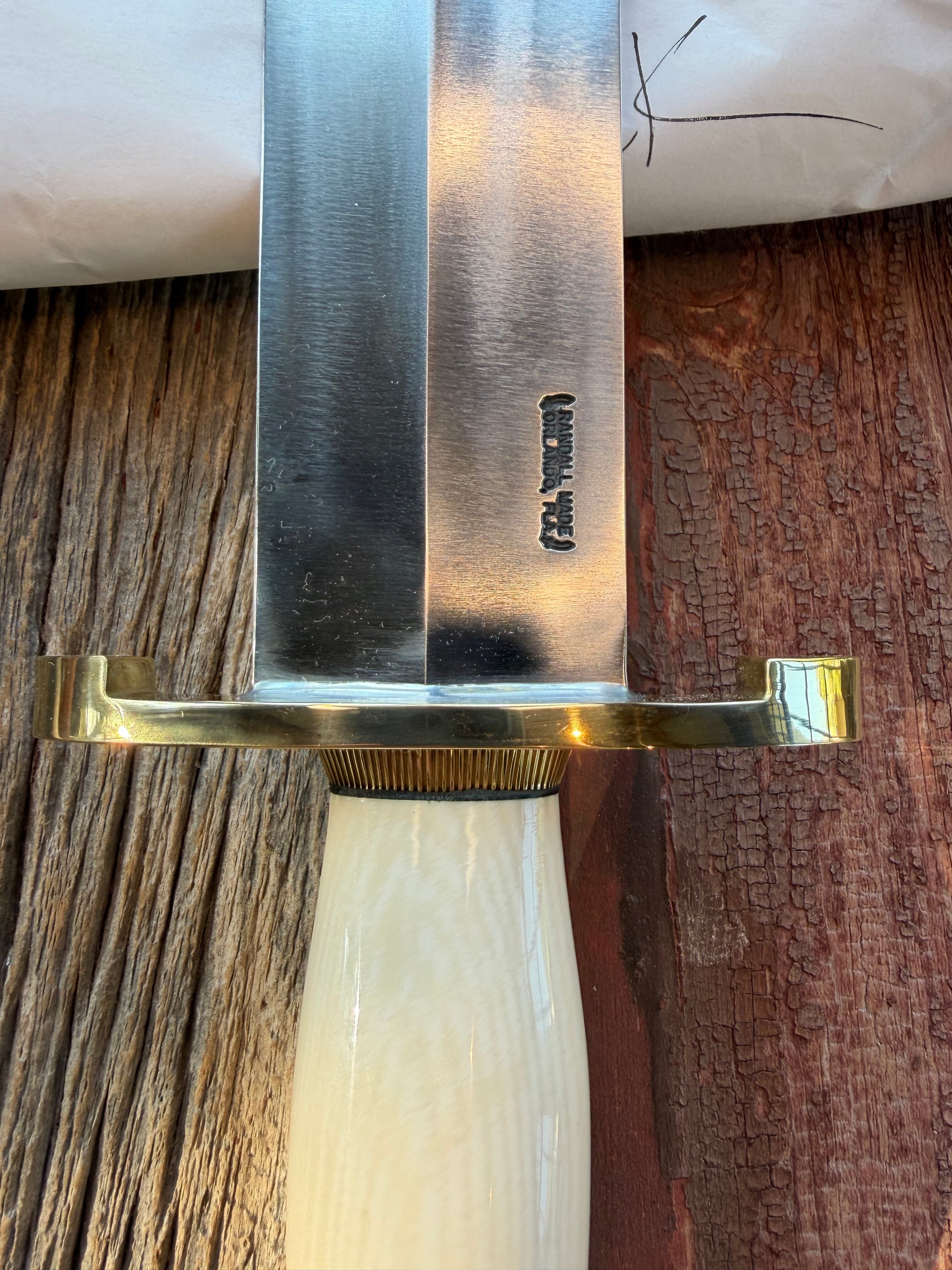 New in paper Randall Model 12-11 Smithsonian in a nice piece of customer supplied Dave Warthers Resin. Tactile feel and closely resembles E. Ivory. Comes with a Randall Leather sheath. There is currently a 5-6 year wait on Randall’s but good luck finding this one. This is a stunning knife !!