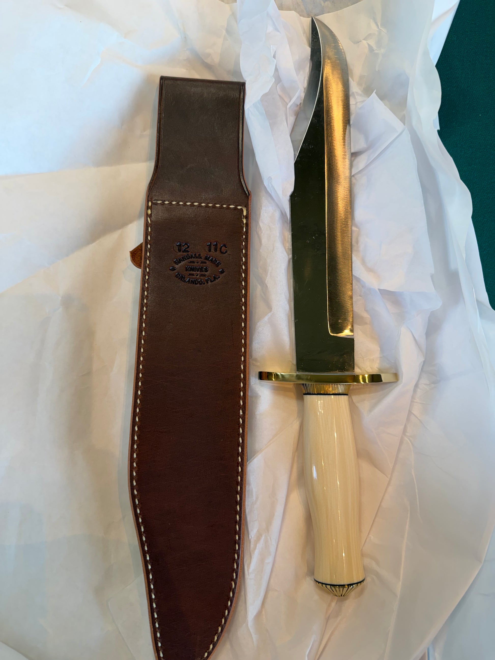 New in paper Randall Model 12-11 Confederate in a piece of customer supplied Dave Warthers Resin. Tactile feel and closely resembles E. Ivory. Comes with a Randall Leather sheath. There is currently a 5-6 year wait on Randall’s but good luck finding this one. This is a stunning knife !!