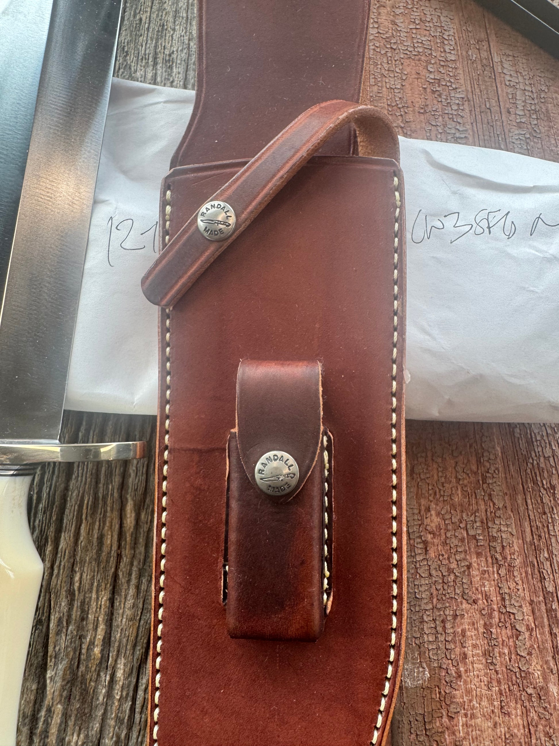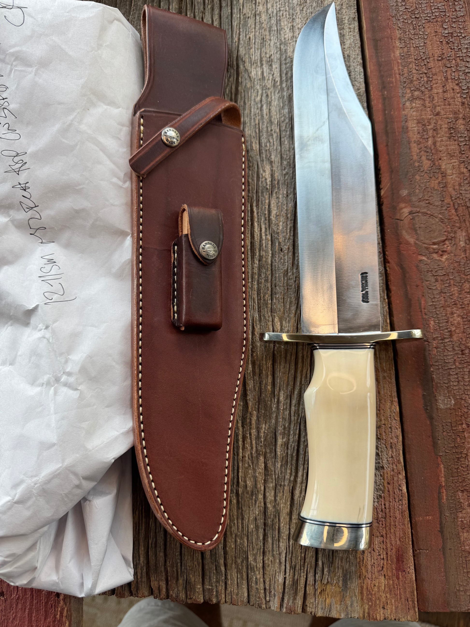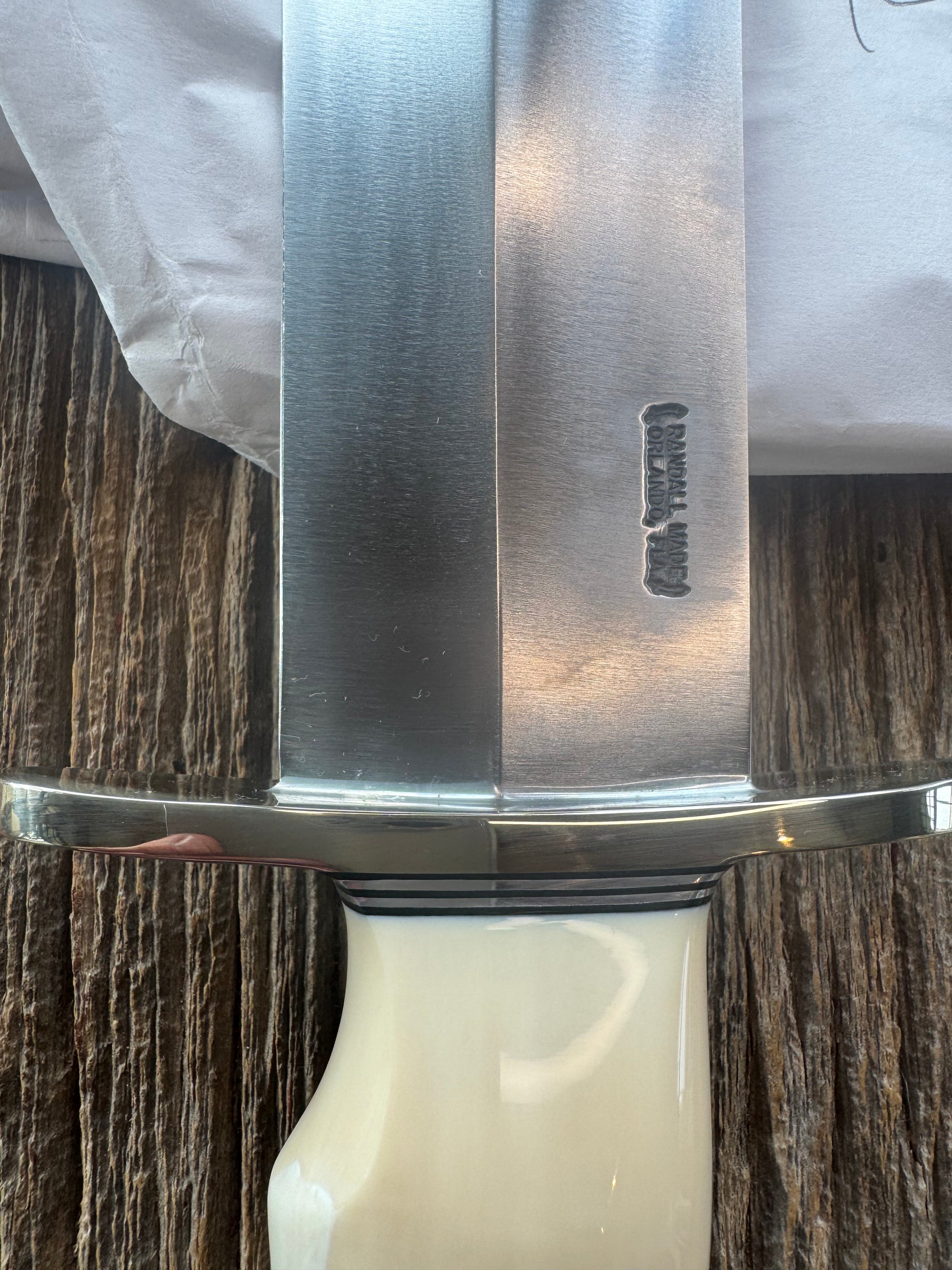 New in paper Randall Model 12-11 Smithsonian in a giant piece of customer supplied virgin Fossil Walrus roll. Comes with a Randall Leather sheath. There is currently a 5-6 year wait on Randall’s but good luck finding this one. This is a stunning knife !!