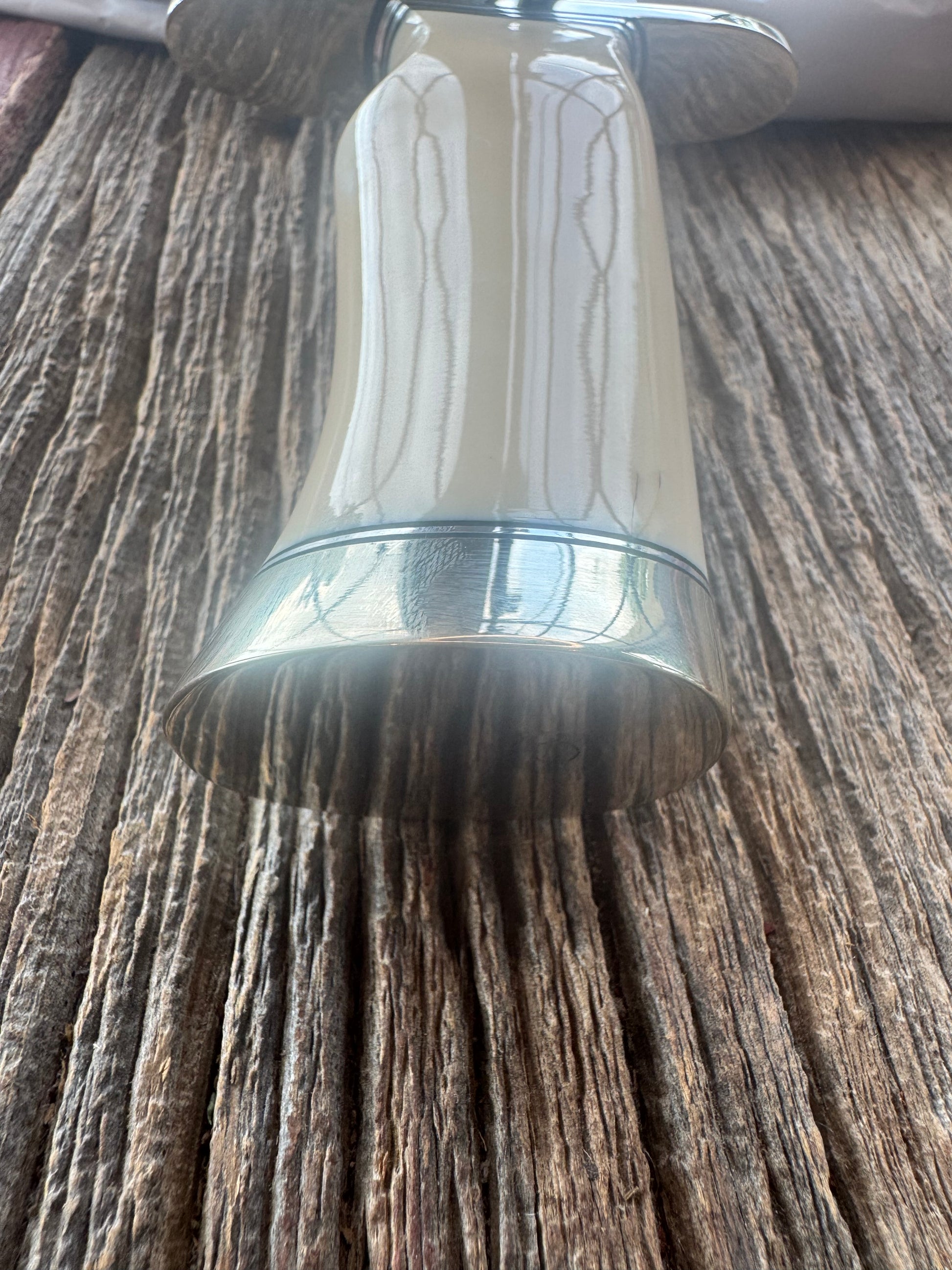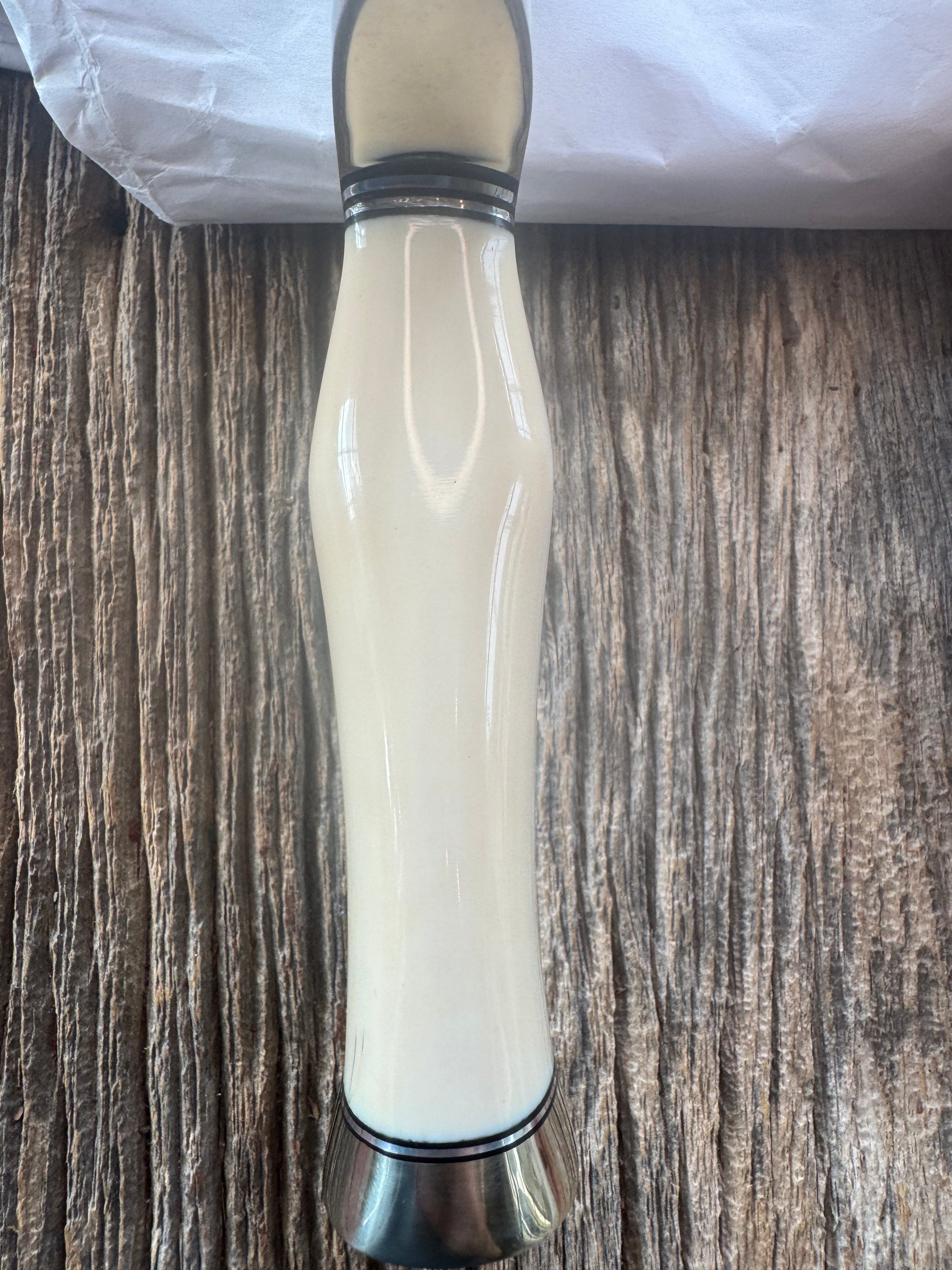 New in Paper Model 12-11 Smithsonian “Smitty” Bowie. Beautiful creamy Fossil Walrus Ivory with a single finger grip and a Nickel Silver forward curved hilt and butt cap. Unreal Scrim opportunity!! Blank Canvas..