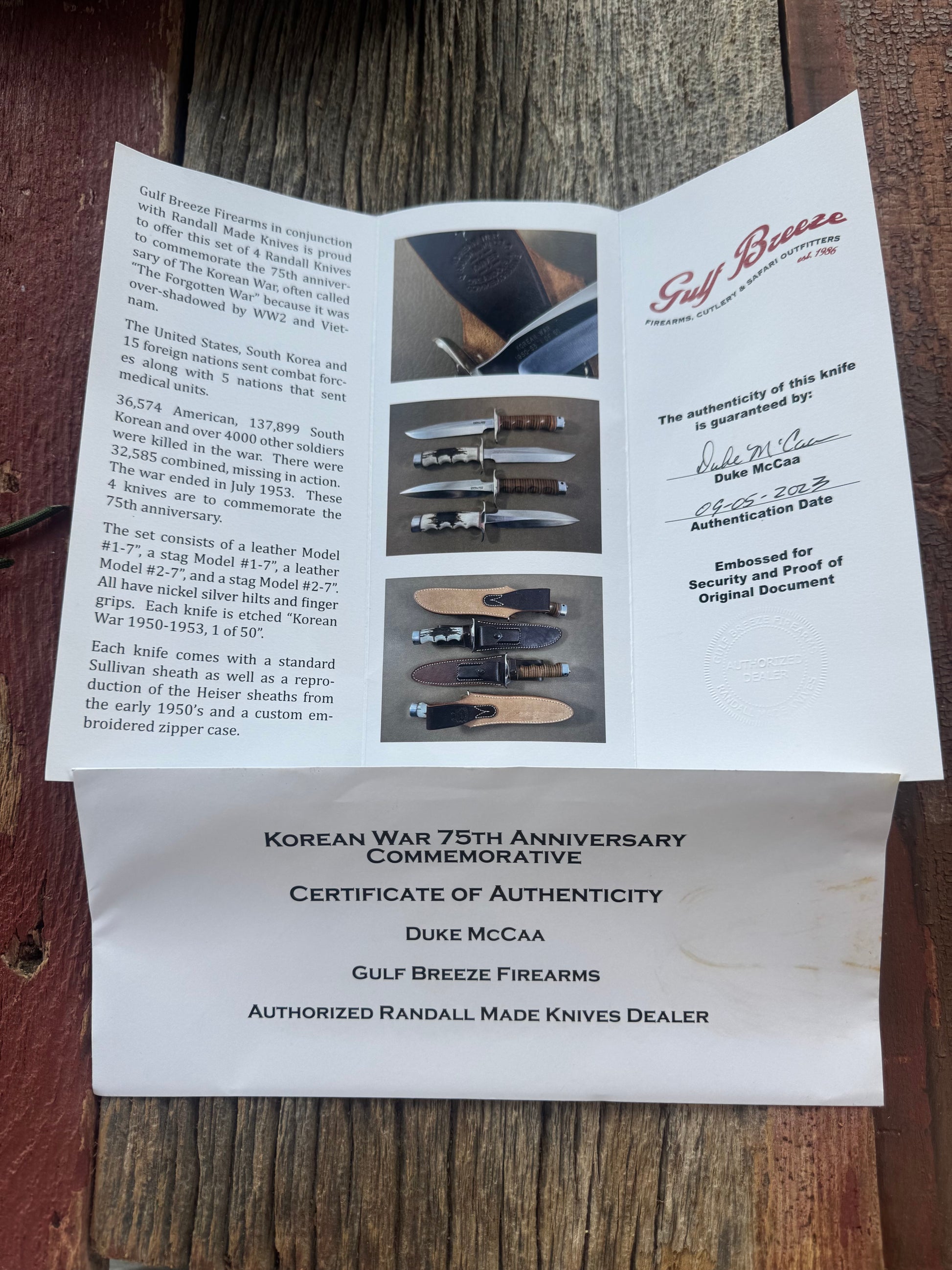 New in paper 75th Randall Model 1-7 75th Anniversary Korean War Commemorative. This is a special set made by Randall with only 50 four knife sets made. I am breaking up the set so as to provide interest in specific models.