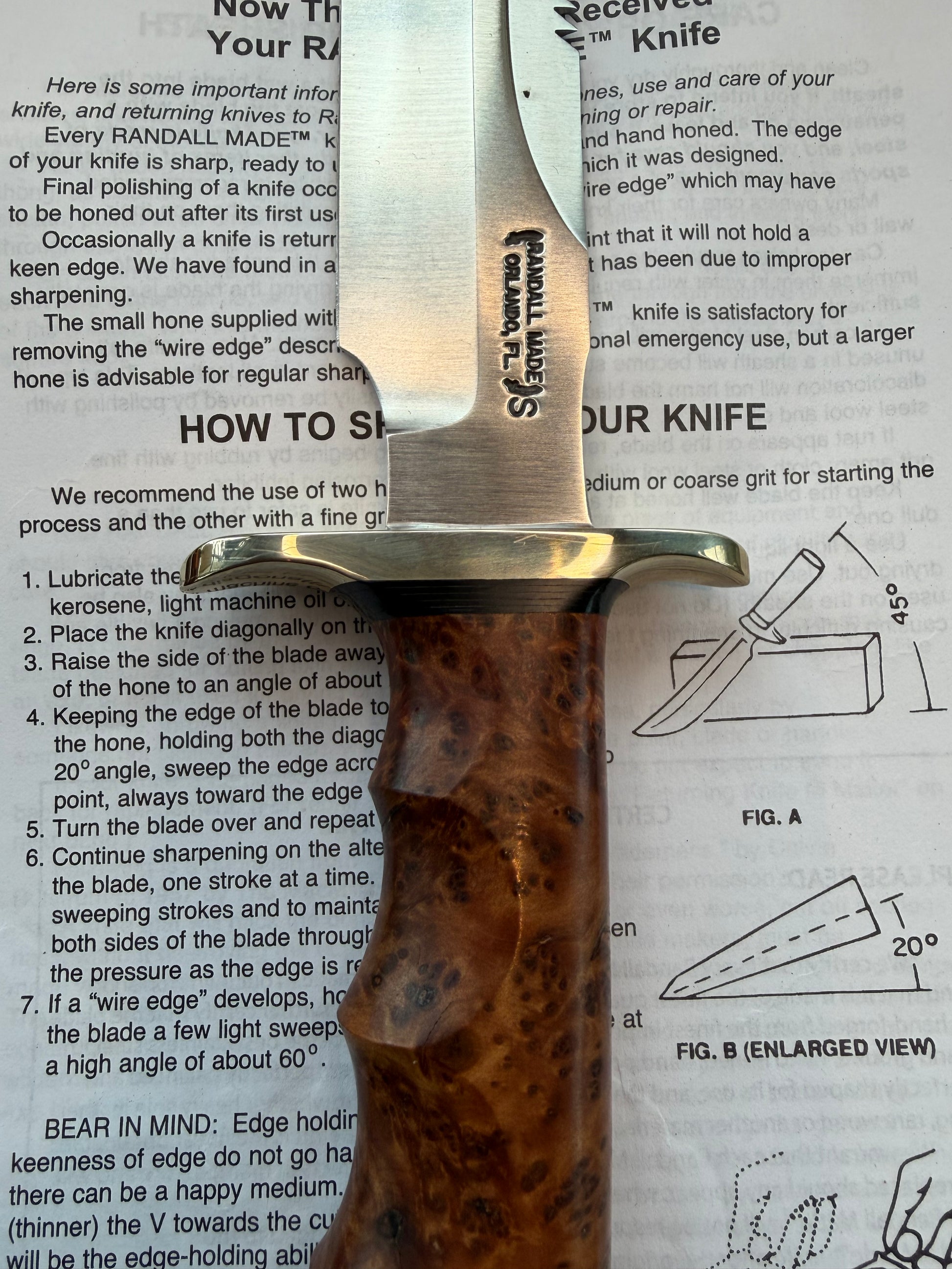 This is a Randall Made Knife from Orlando, FL. It is a Model 1-8 Knife. Randall is experiencing a 6-7 year wait on orders .