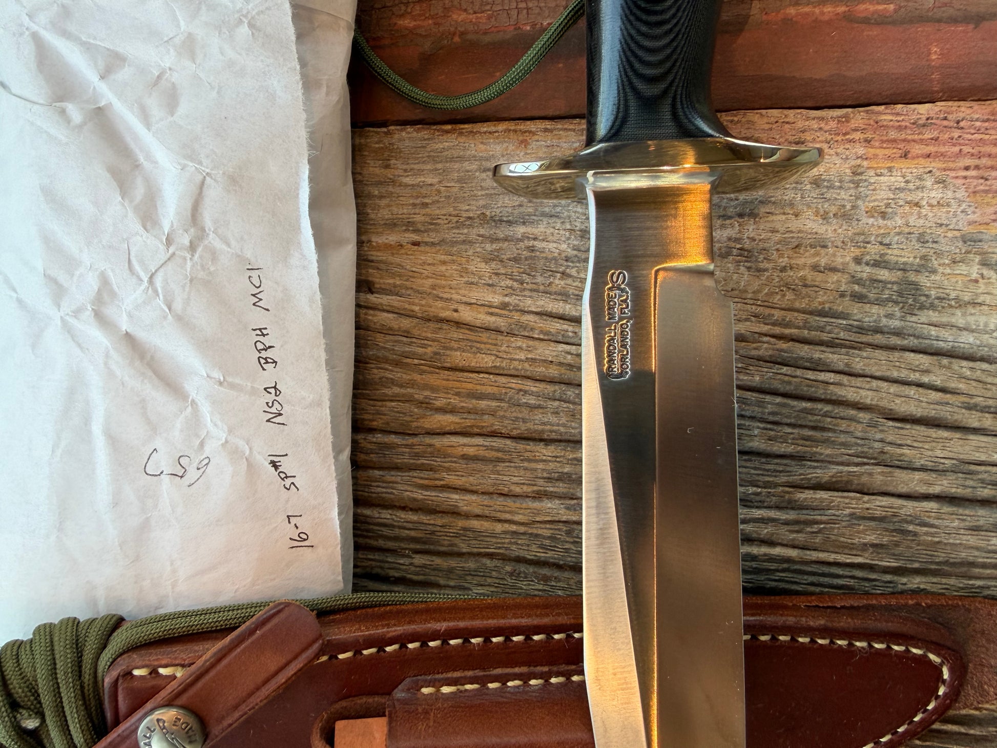 New in Paper Randall Model 16 SP#1 Special fighter with a Black Micarta handle. SS blade, Nickel silver Straight hilt. Lanyard. Brown leather sheath.