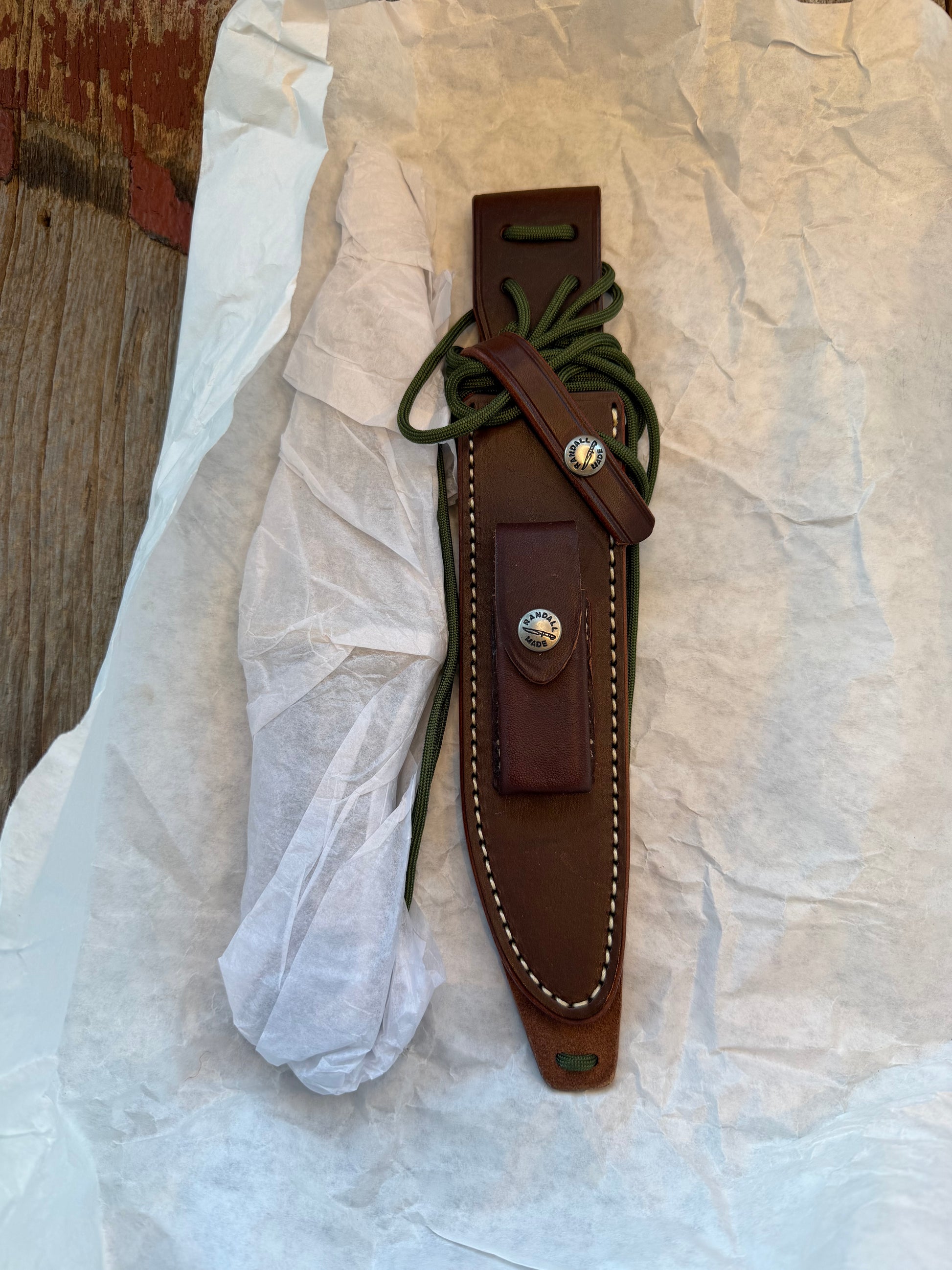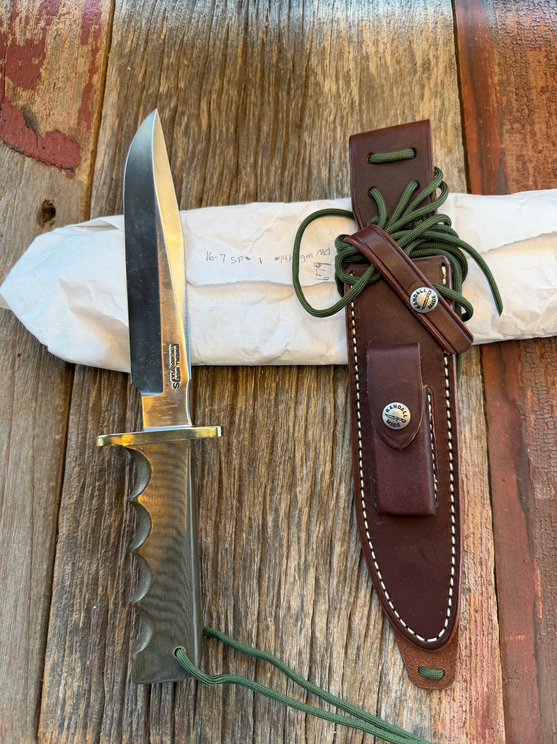 New in Paper Randall Model 16 SP#1 Special fighter with a Green Micarta handle. SS blade, Nickel silver hilt. Lanyard. Brown leather sheath.