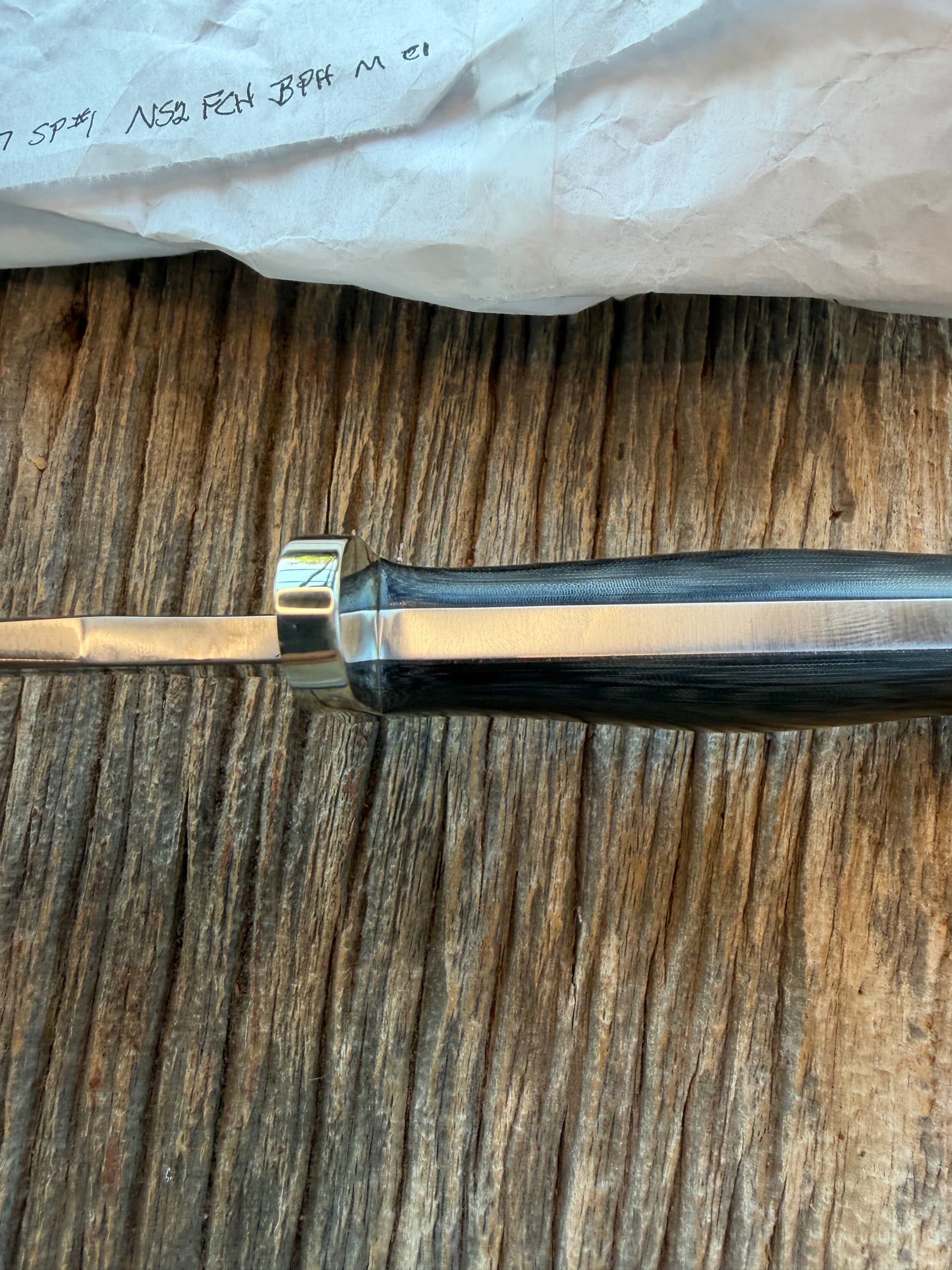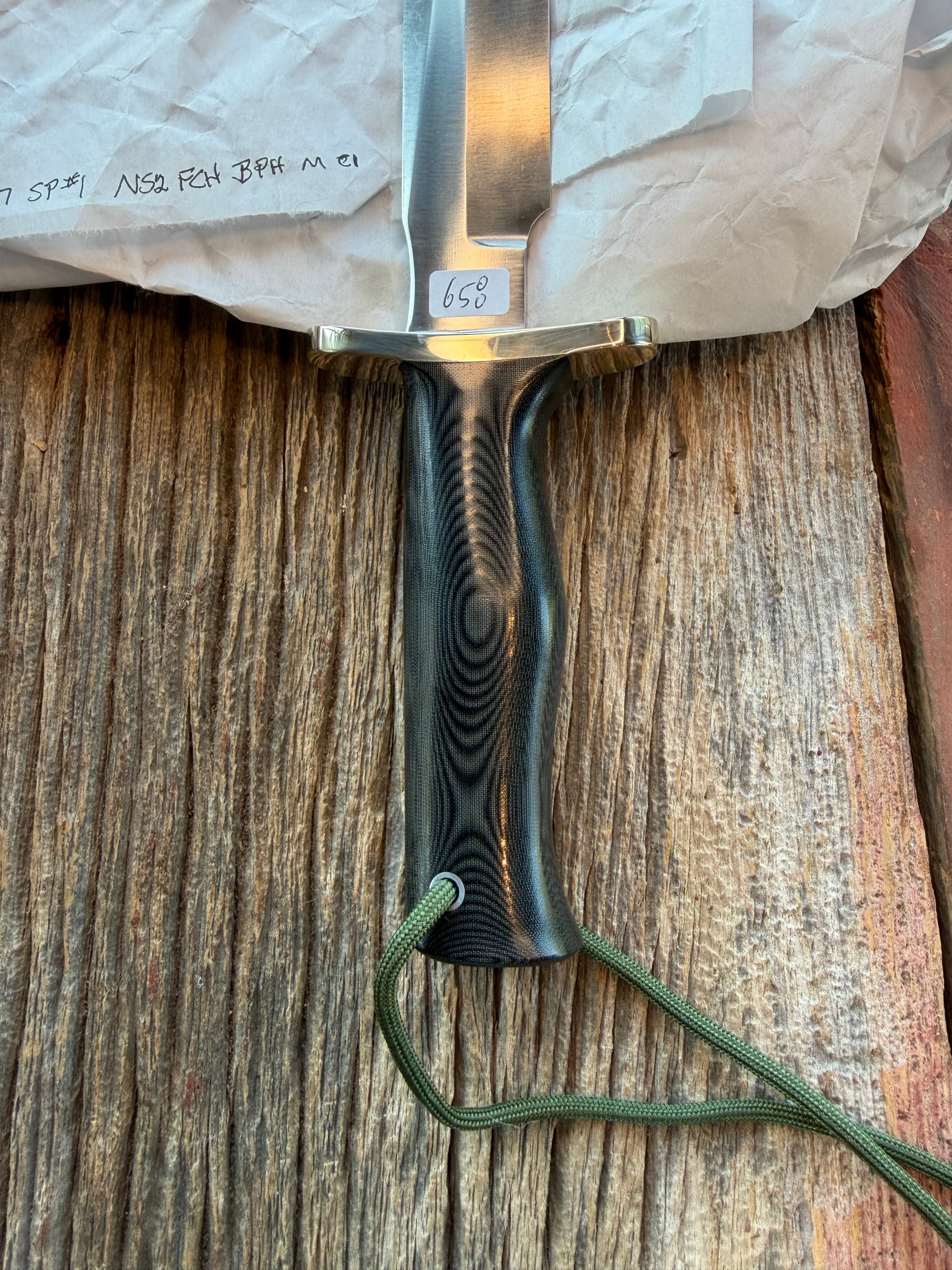 New in Paper Randall Model 16 SP#1 Special fighter with a Black Micarta handle. SS blade, Nickel silver Forward Curved hilt. Lanyard. Brown leather sheath.