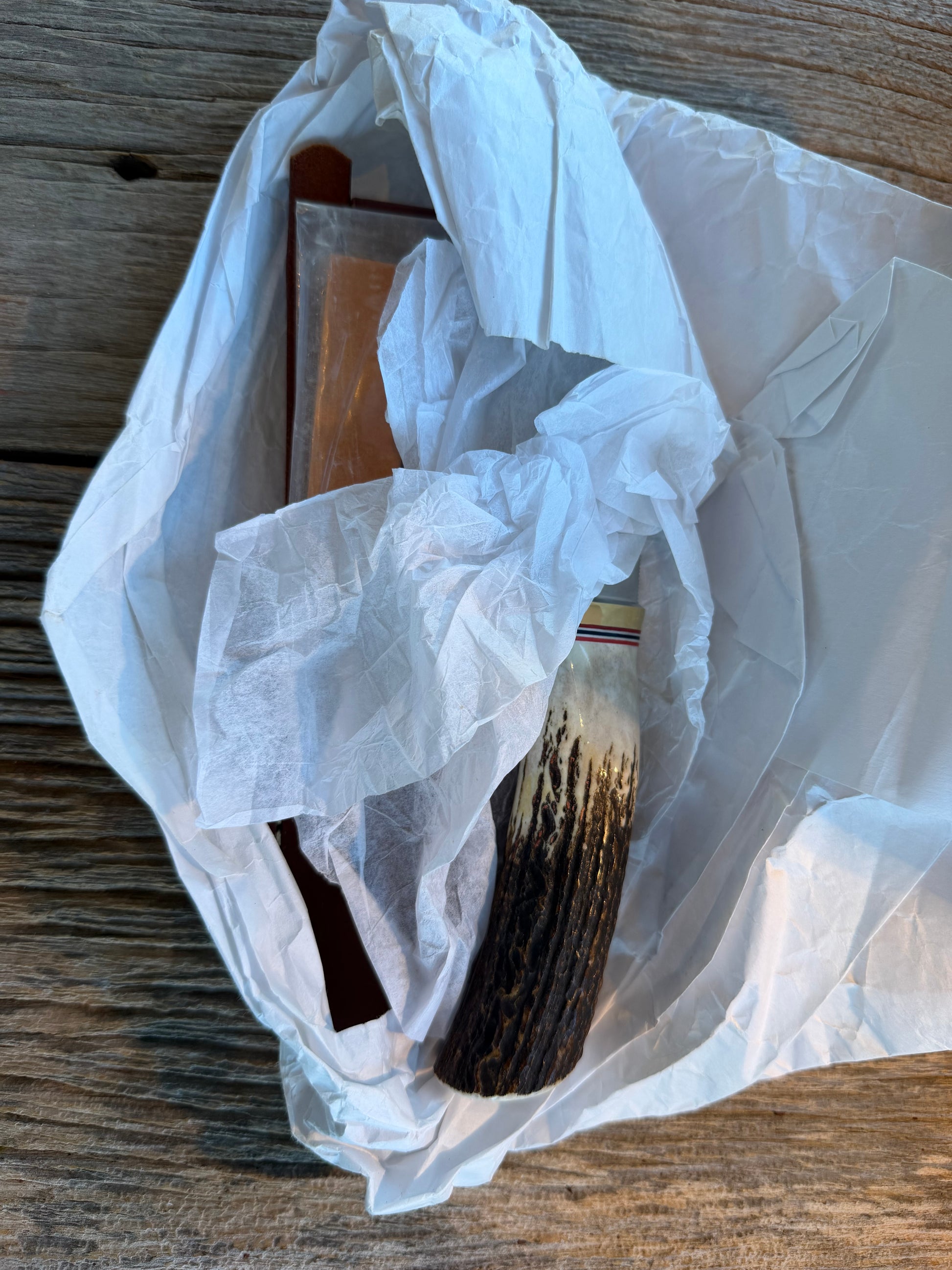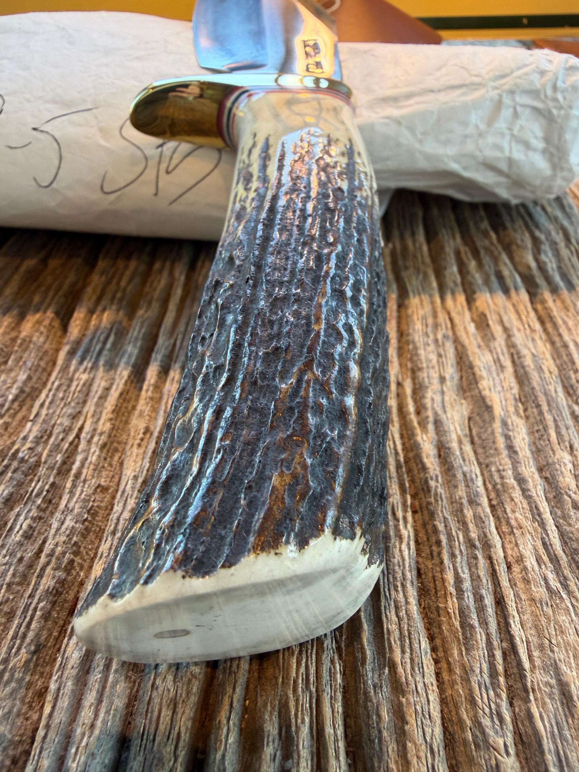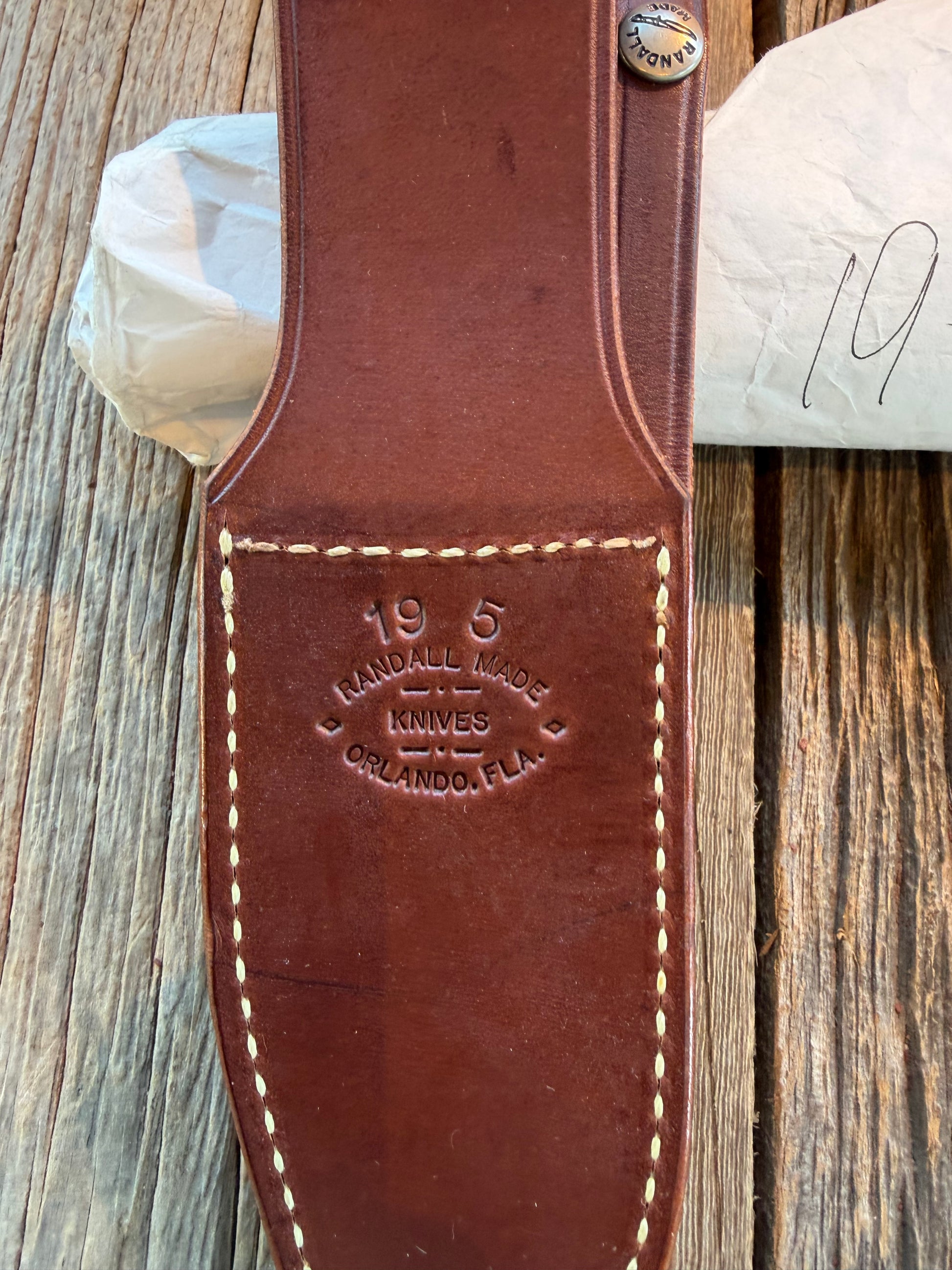 New in Paper Randall Model 19-5 Bushmaster with a Stag handle. Carbon blade, Nickel silver single hilt. Brown leather sheath.
