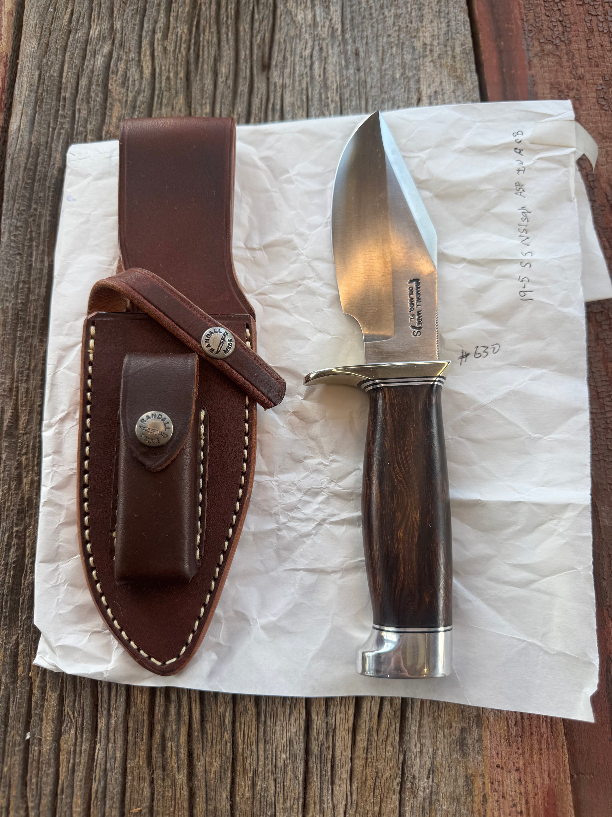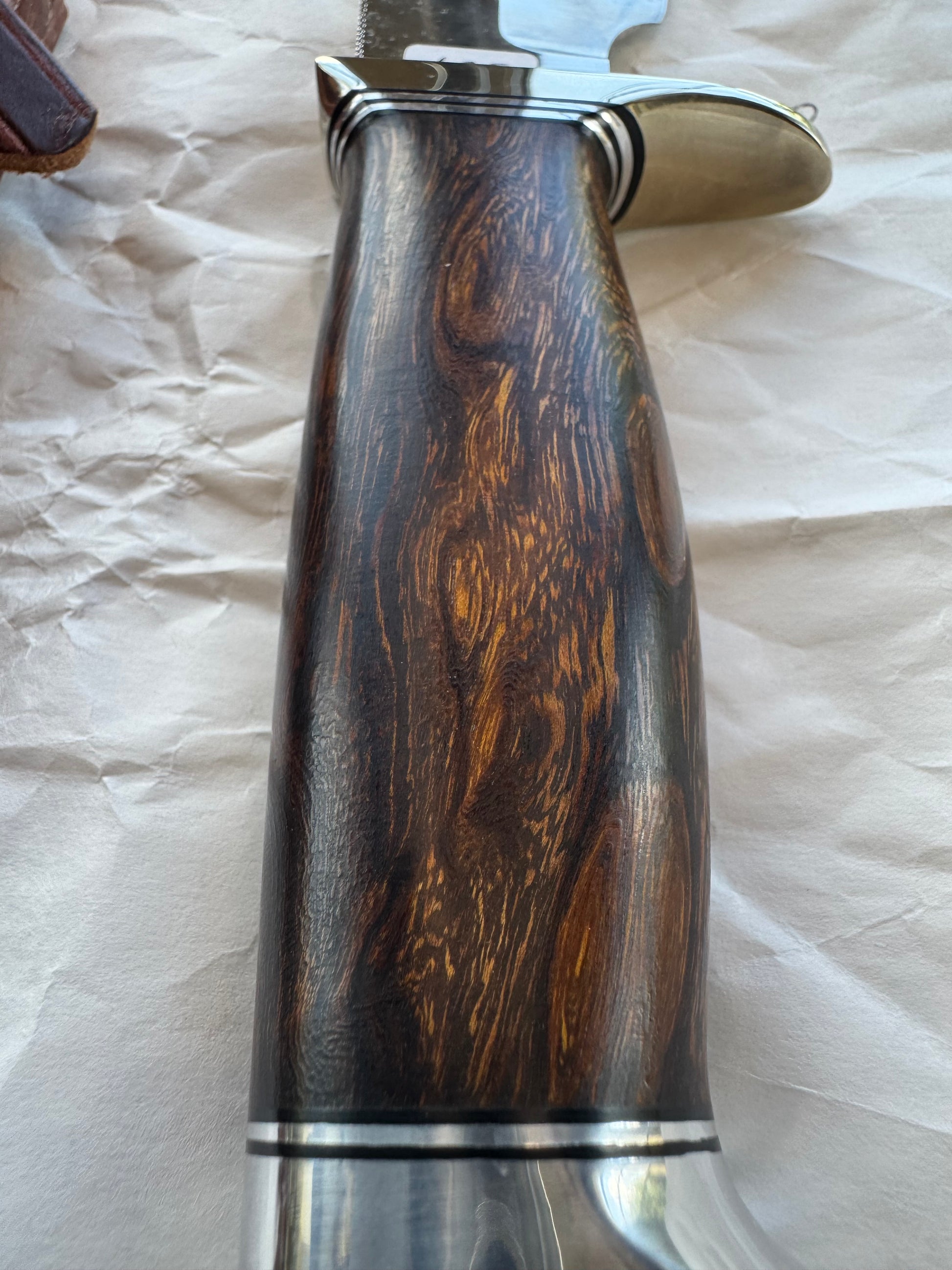 New in Paper Randall Model 19-5 Bushmaster with an Ironwood handle. SS blade, Nickel silver single hilt. Brown leather sheath.