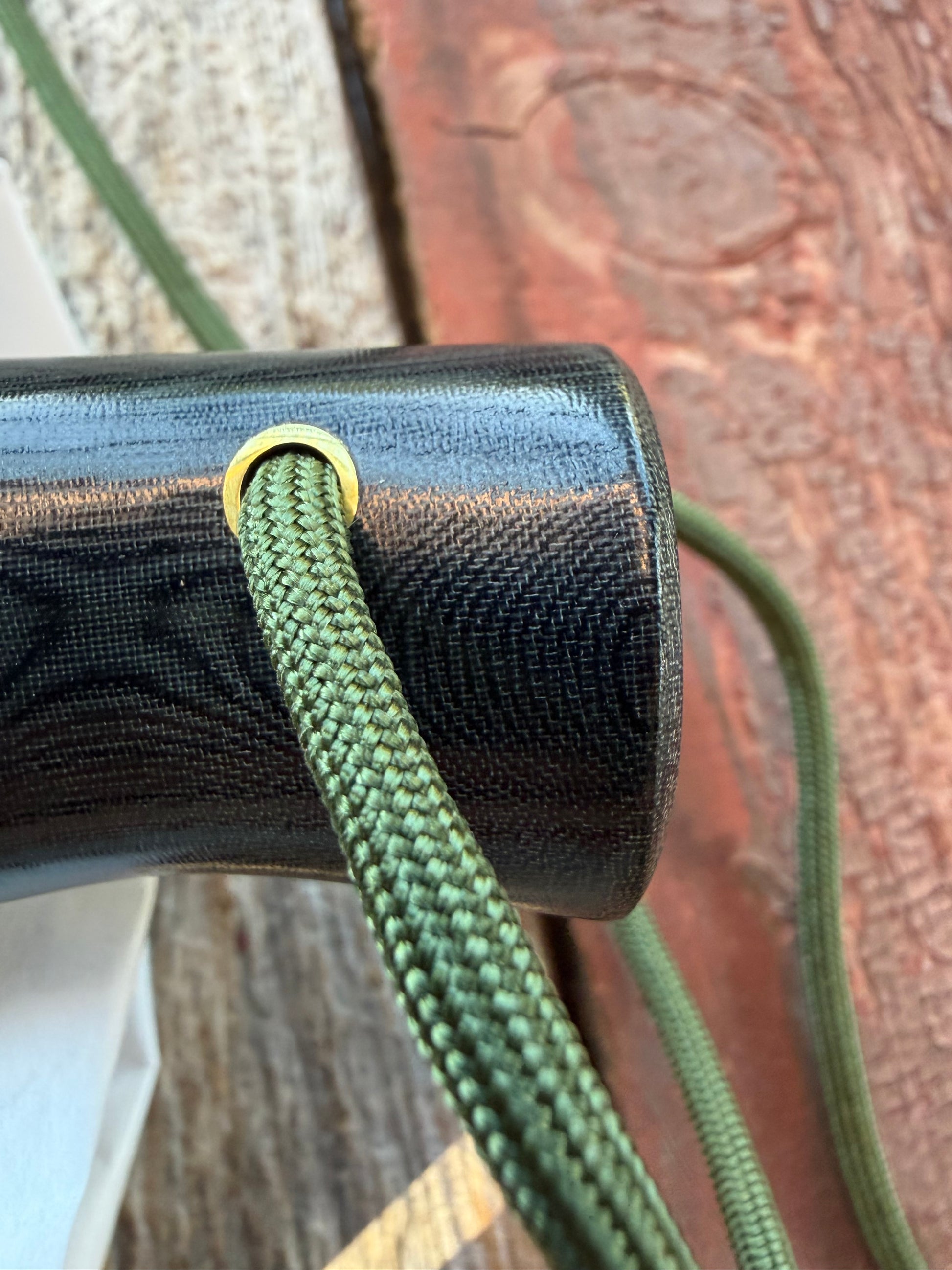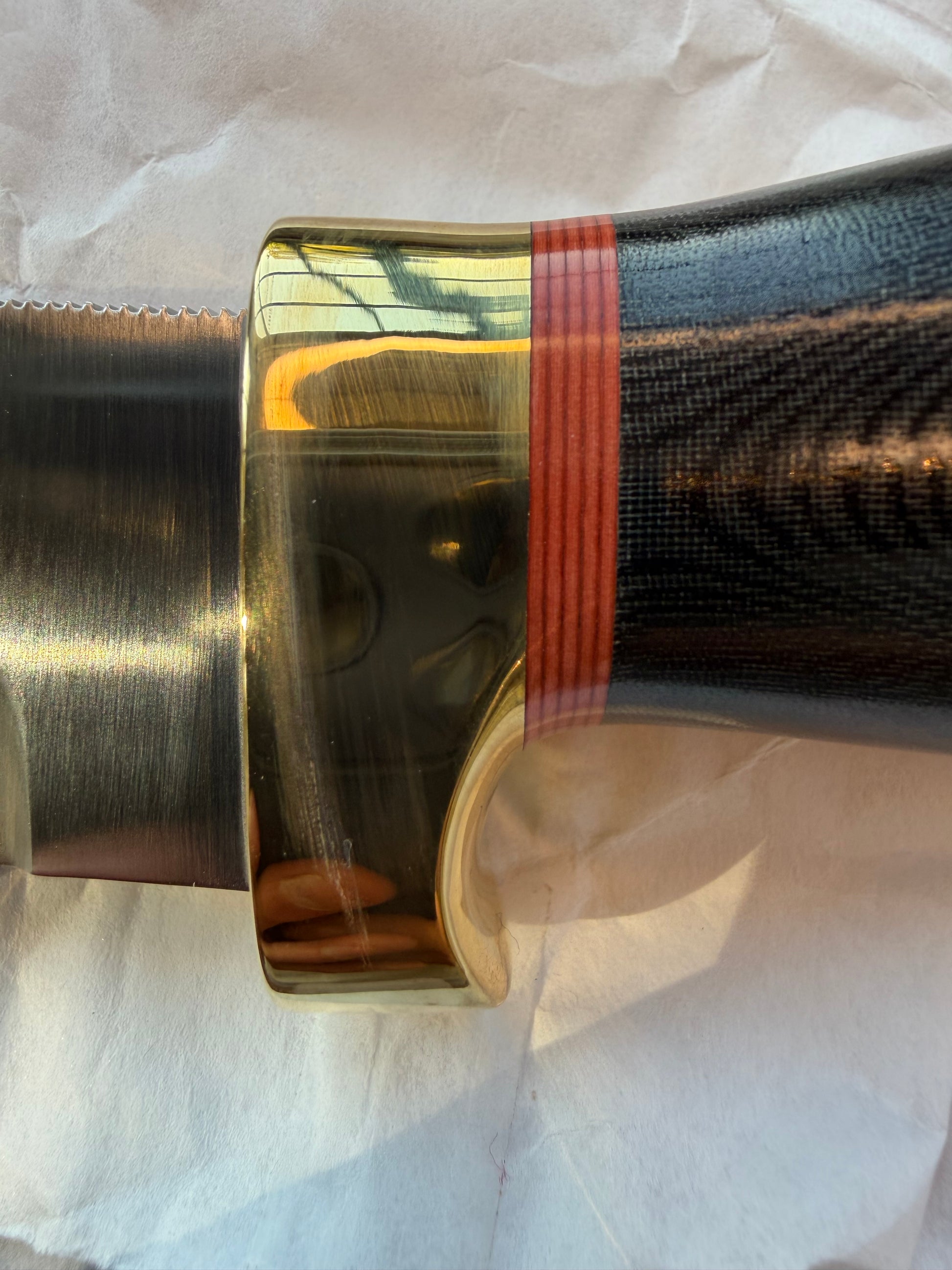 New in Paper Randall Chef’s Knife. Black Micarta in Brass with red spacers. Natural end, stainless steel blade and a lanyard.