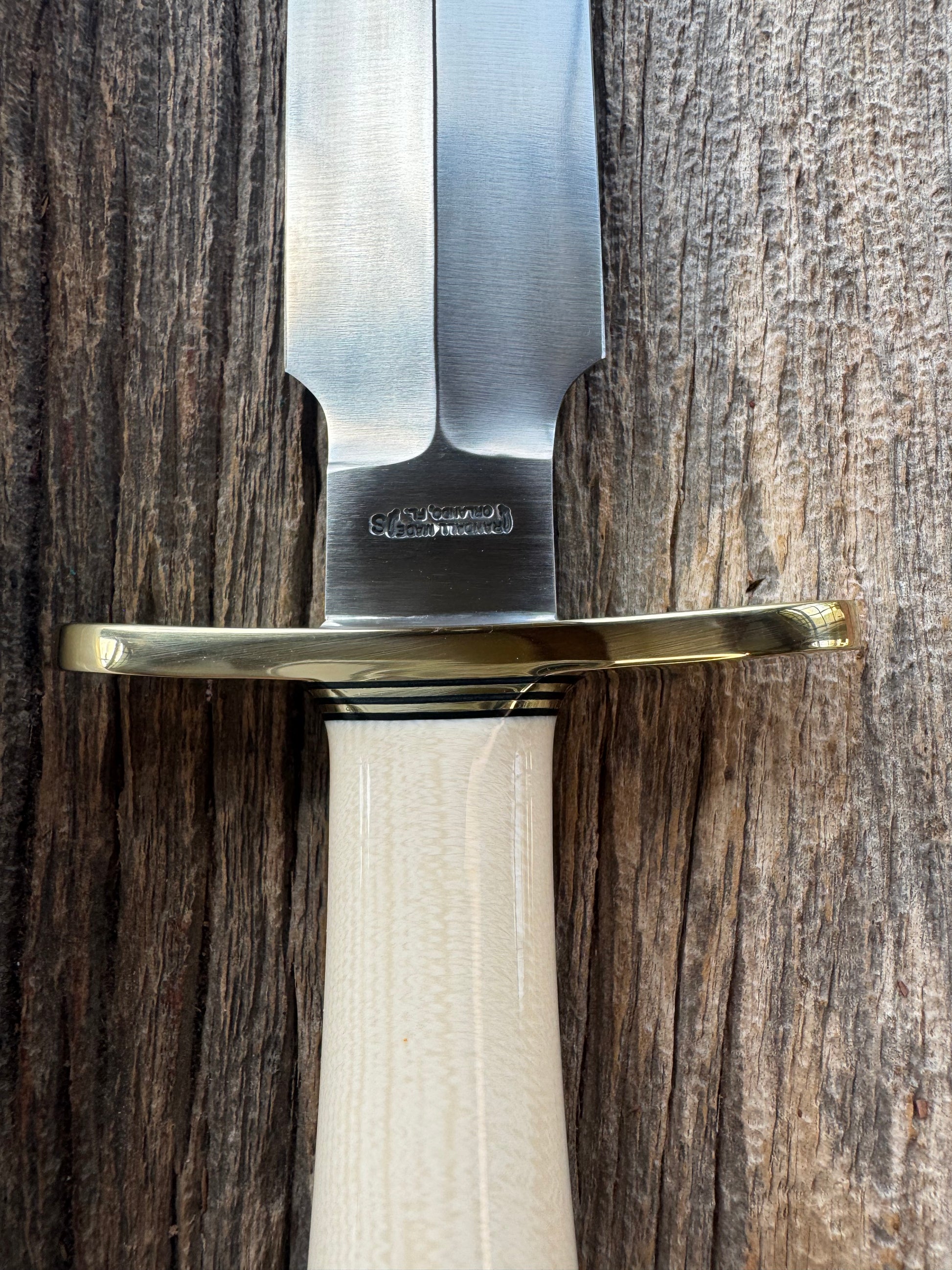 New in paper Randall Clinton Special with a nice piece of customer supplied Warthers Resin with concave grip, Stainless Steel, Brass Hilt and brass coolie cap.