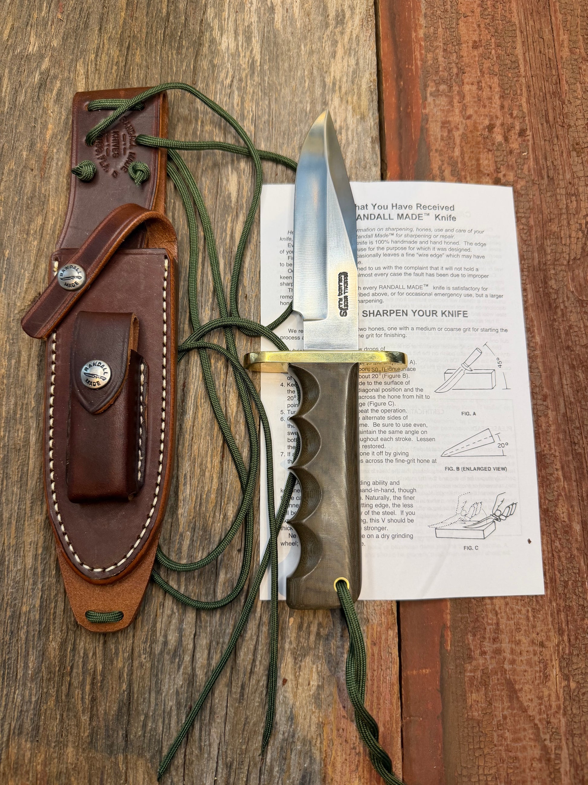 New Randall Knife Model 15 Airman Stainless Steel, Green Micarta, finger grooves.