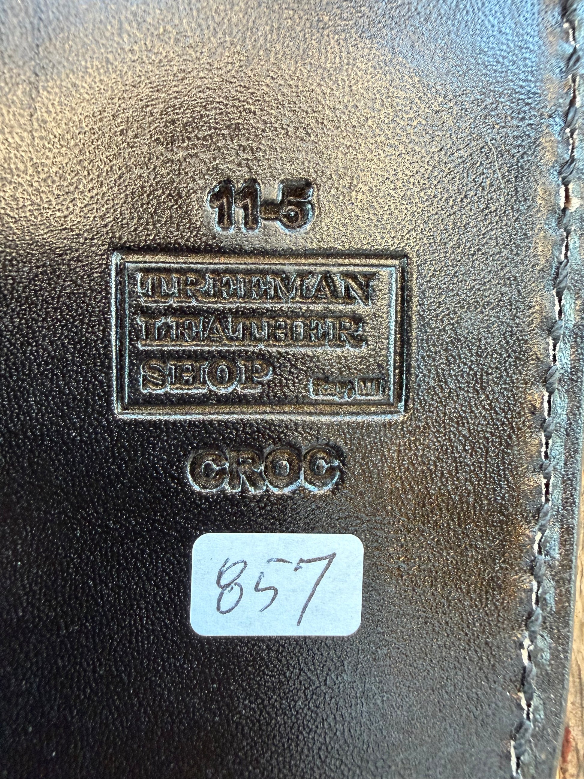 This is a nice Treeman sheath in Black Crocodile for a model 11-5. It has a unique texture color and pattern. The latest from Rocco with brass stamping on the back and Treeman logo inside a square providing a clean organized look.