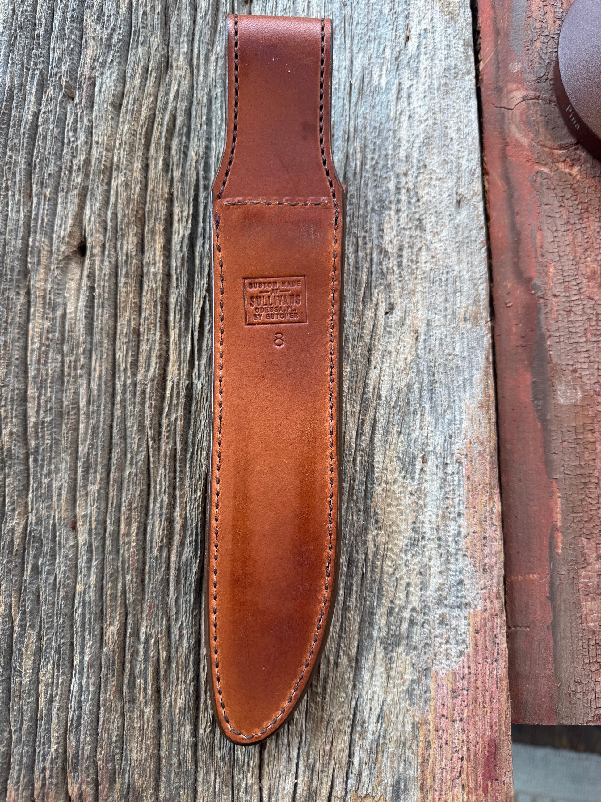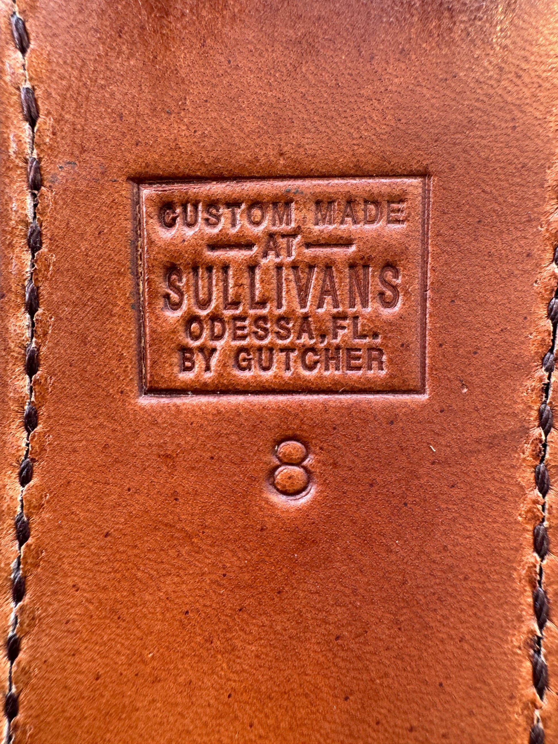 Here is a nice Gutcher Black and white Croc skin sheath with great colors and smooth perfect scales. Sullivans by Gutcher stamped on the back. Brown snap on the front.