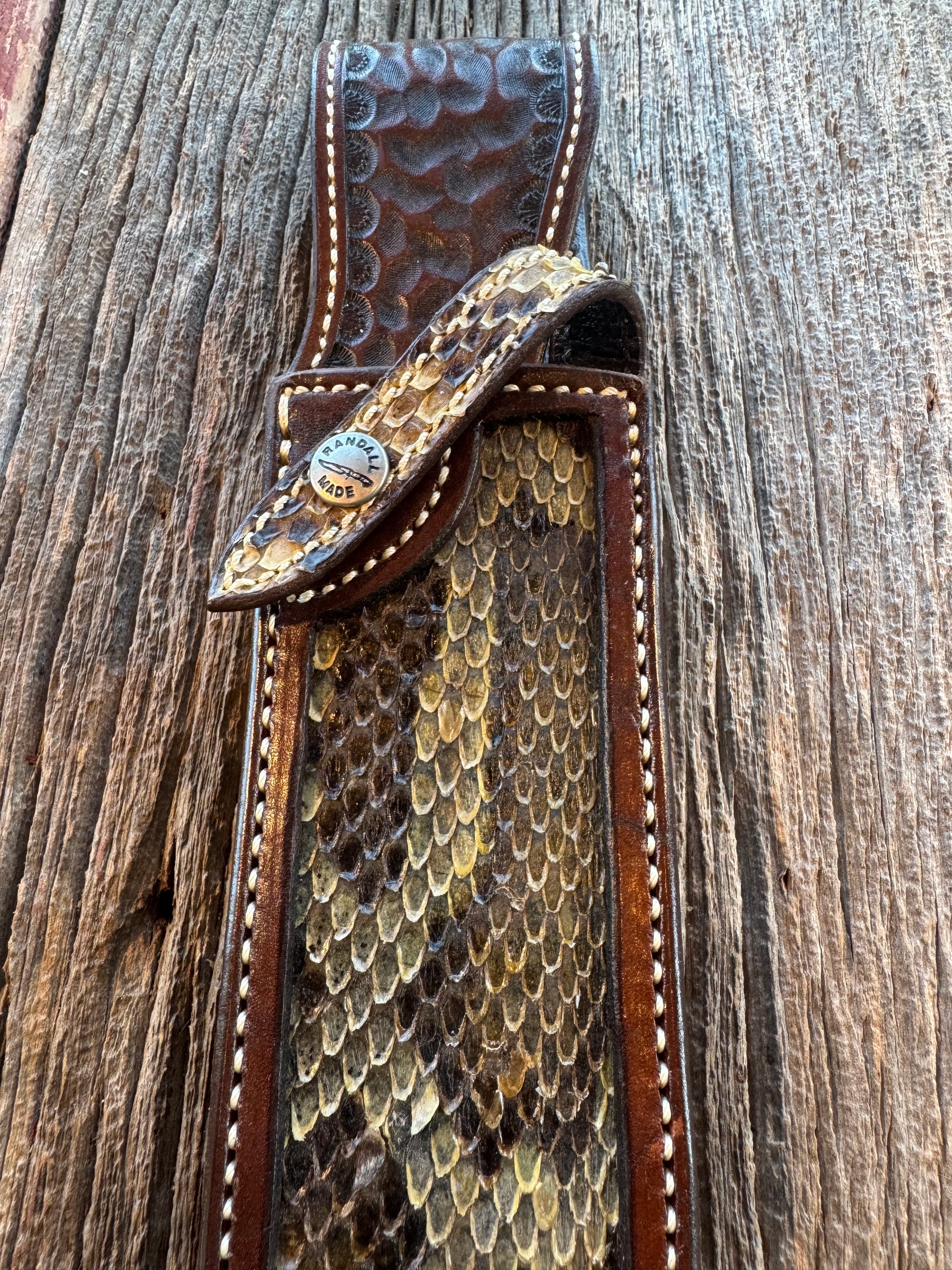 Here is a nice and rare Python Inlay skin sheath with great colors and smooth perfect scales. All the proper stamping on the back, Randall snap on the front and great Randall logo on the back.