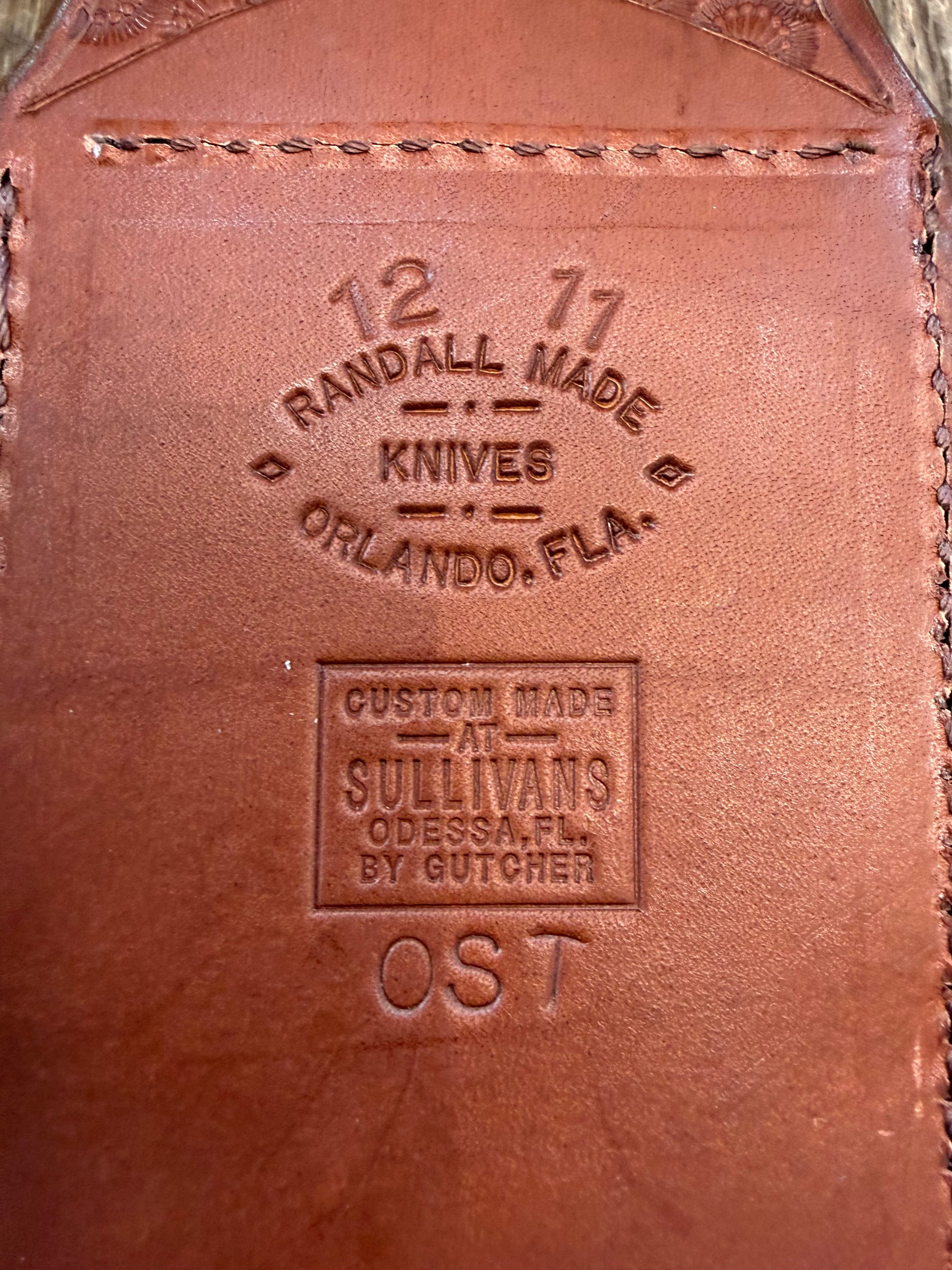 New Randall Model 12-11 Smithsonian “Smitty” Sheath in Exotic cream colored Ostrich Leg ( very rare) Custom Made at Sullivan’s by Gutcher.