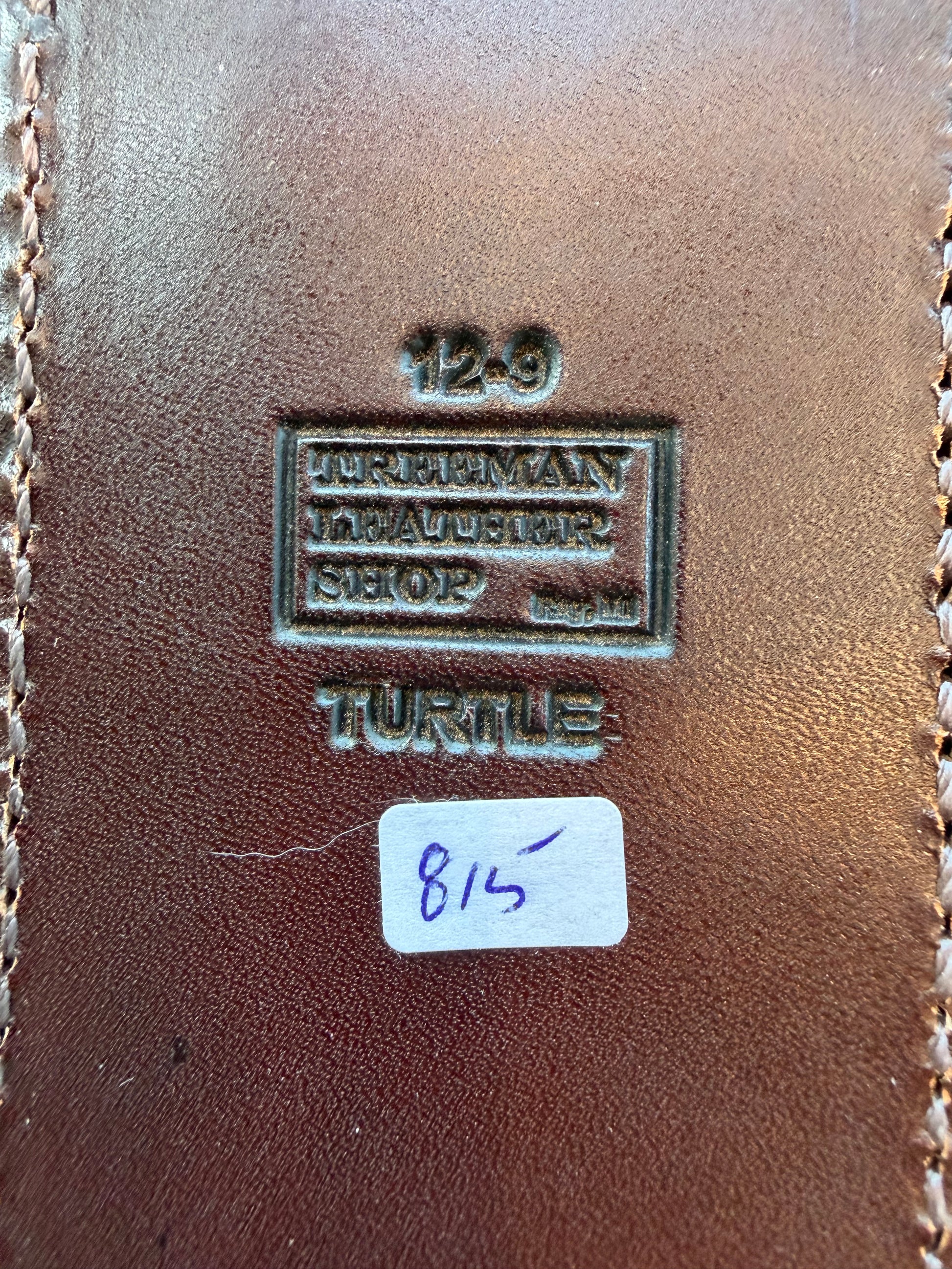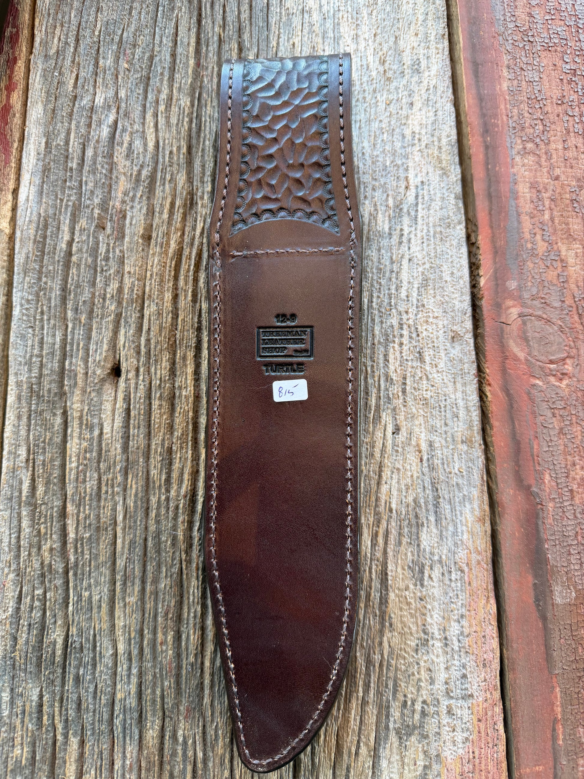 Brian’s most recent batch of Snapping Turtle sheaths turned out exceptional. All brass stamping on the back with a Treeman logo inside the square giving it a clean organized look. Hand tooled belt loops front and back.