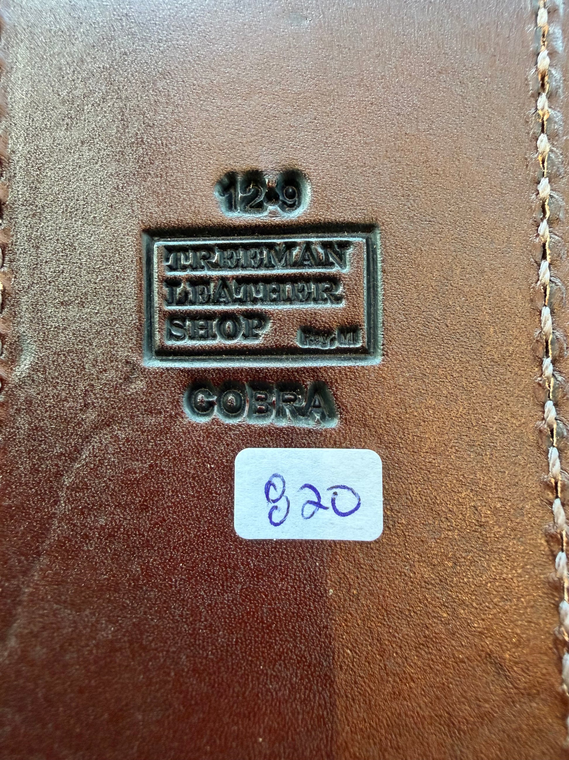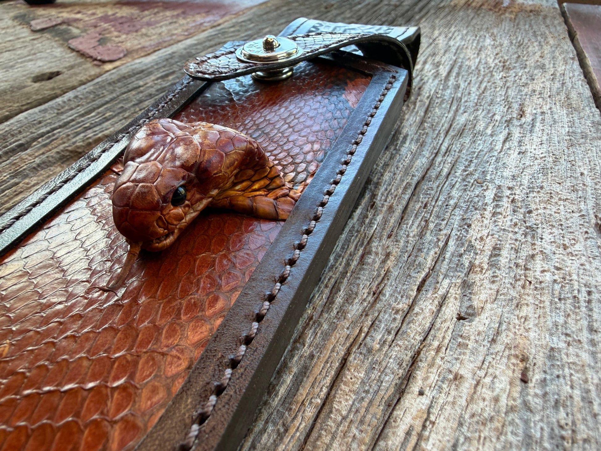 One of Brian’s coolest sheaths. Actual Cobra head all original not cut and sewn on. It turned out exceptional.  All brass stamping on the back with a Treeman logo inside the square giving it a clean organized look. Hand tooled belt loops front and back.