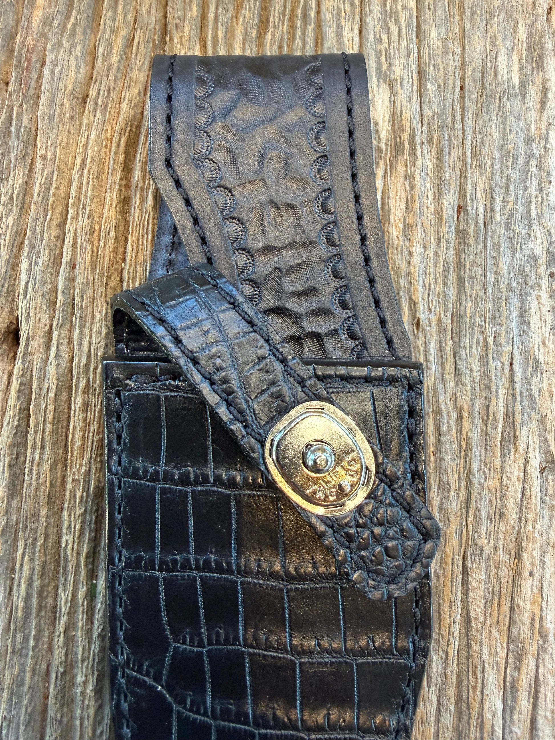 This is a nice Treeman sheath in Black Crocodile for a model 19-5. It has a unique texture color and pattern. The latest from Rocco with brass stamping on the back and Treeman logo inside a square providing a clean organized look.