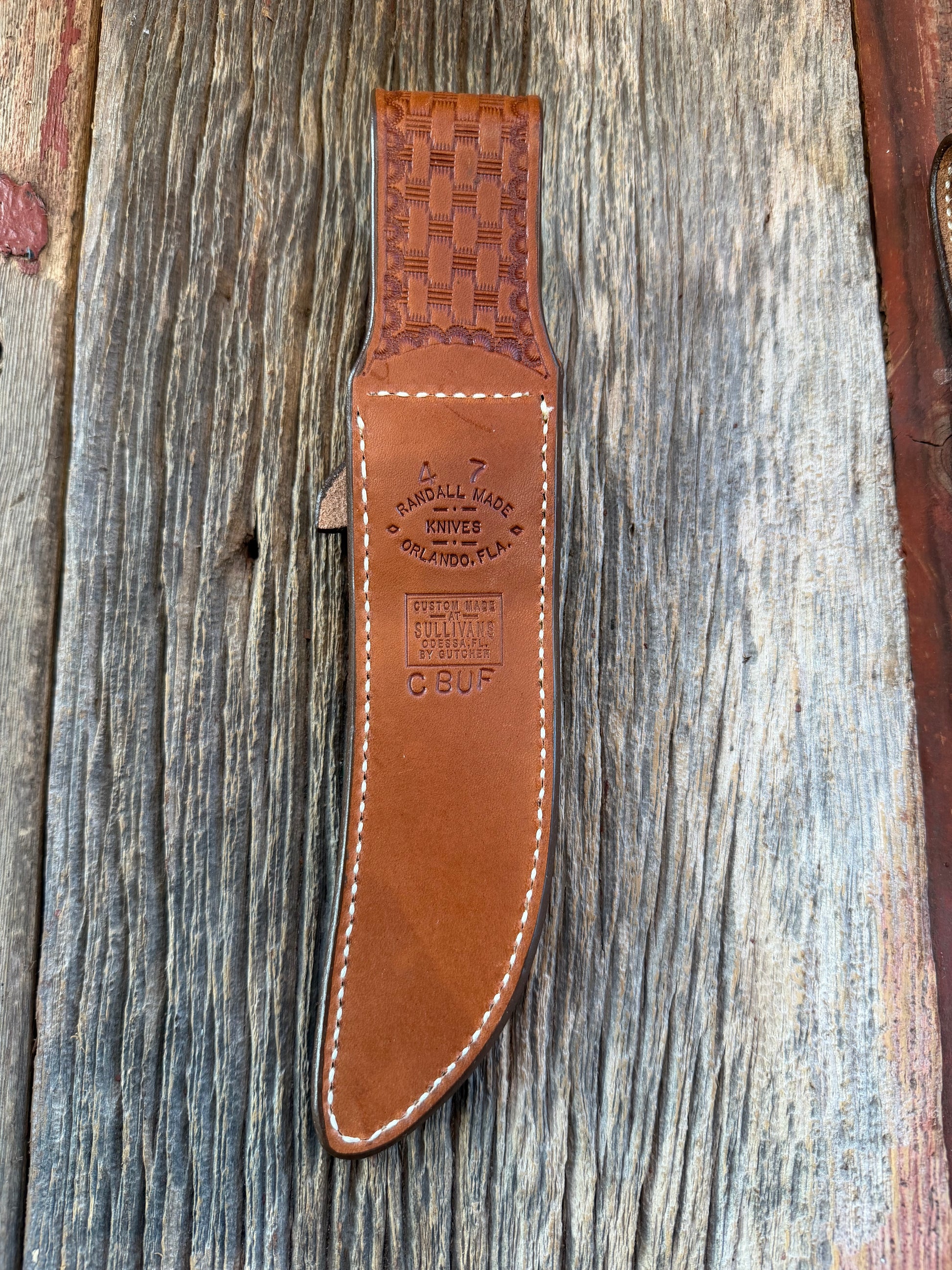 New Randall Model 4-7 Sheath in Exotic Brown Cape Buffalo with full leather hand tooled belt loop. Randall snap and stamp on the back. Custom Made at Sullivan’s by Gutcher