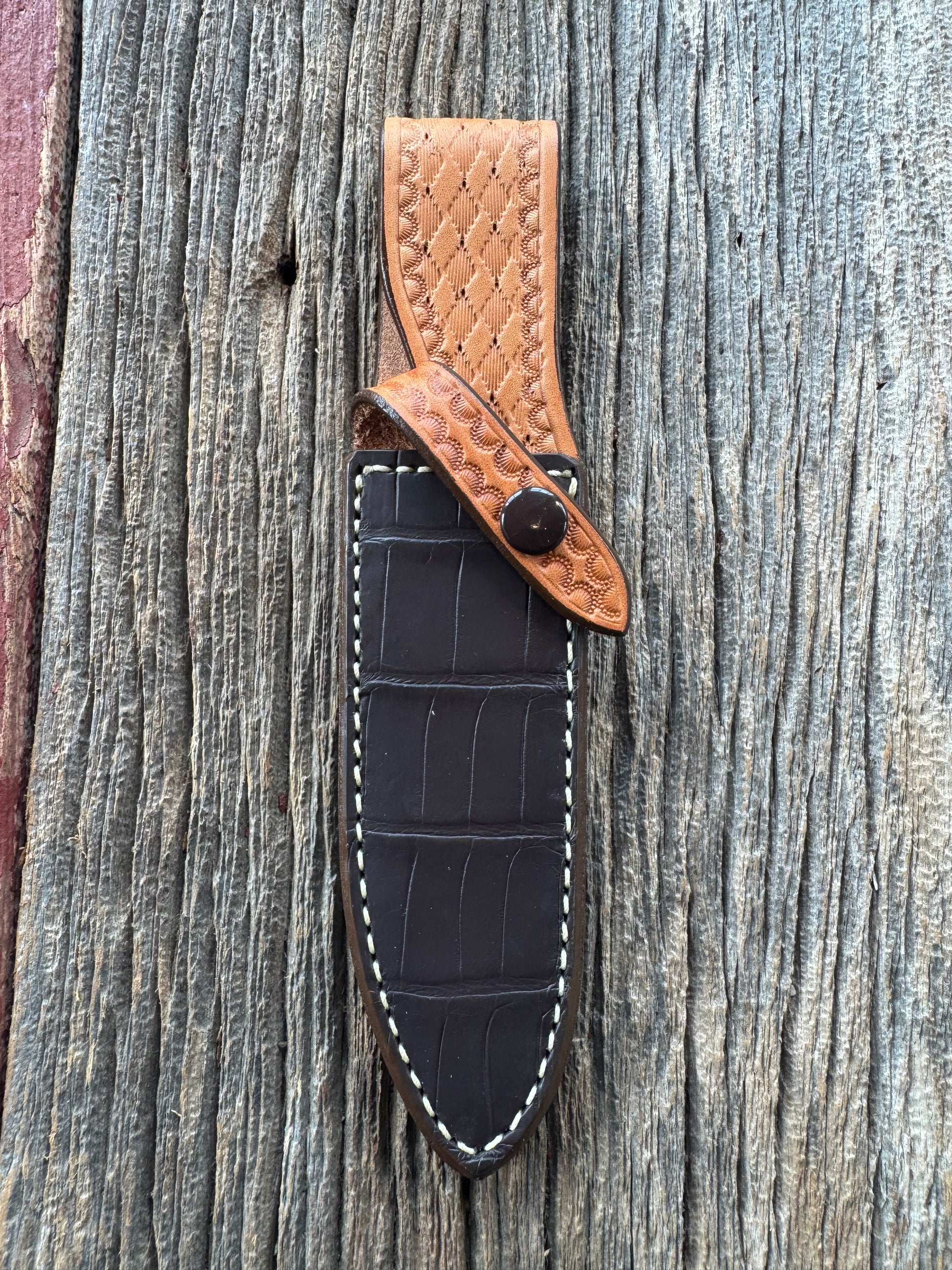 New Randall Model Combat Companion Sheath in Exotic Brown Natural Croc with full leather hand tooled belt loop. Custom Made at Sullivan’s by Gutcher.