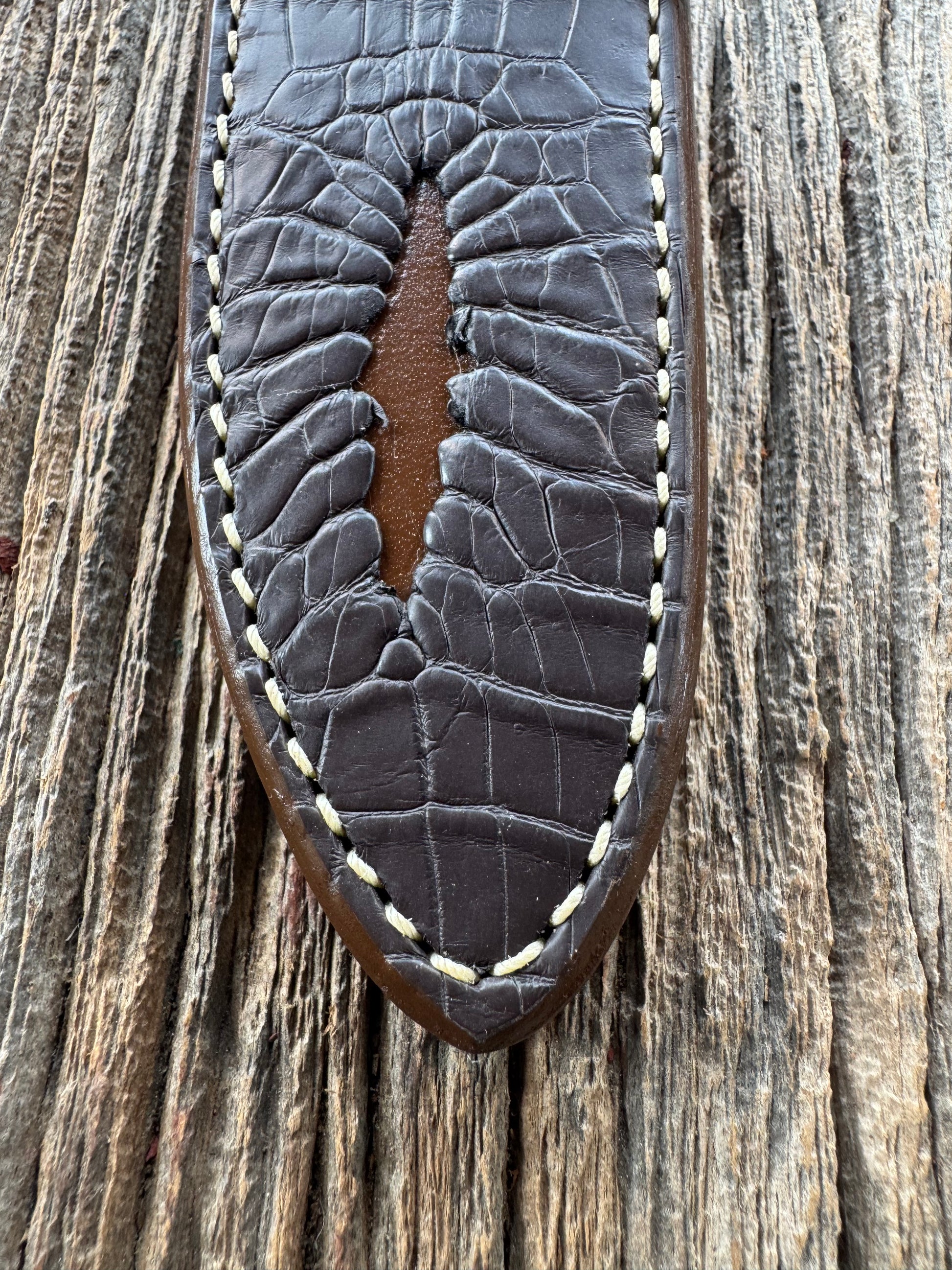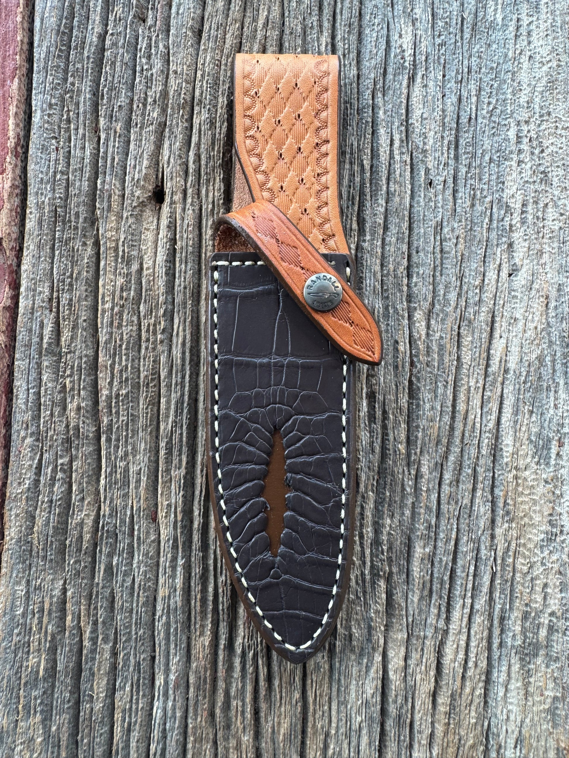 New Randall Model Combat Companion Sheath in Exotic Brown Natural Croc with full leather hand tooled belt loop. Randall snap and stamp on the back. Custom Made at Sullivan’s by Gutcher