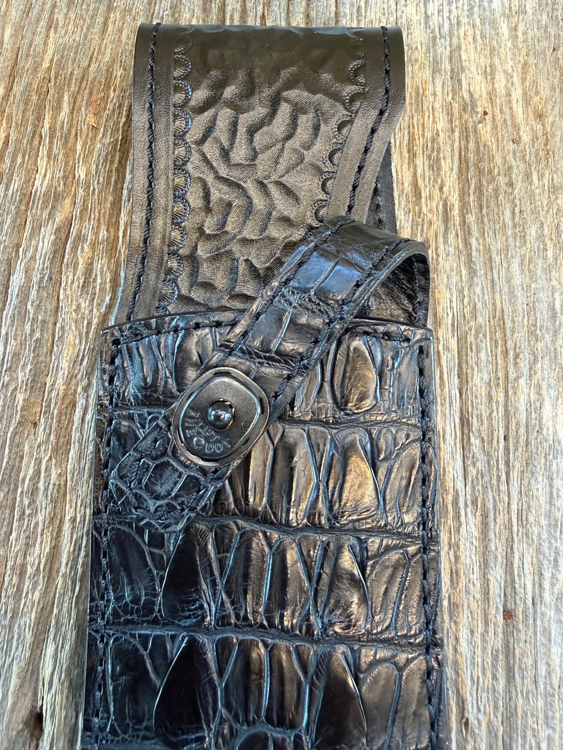 New Randall Model 12-11 Smitty Sheath in Exotic Black Crocodile tail from Treeman. Black canteen Snap .. Johnny Cash Style … All Black.