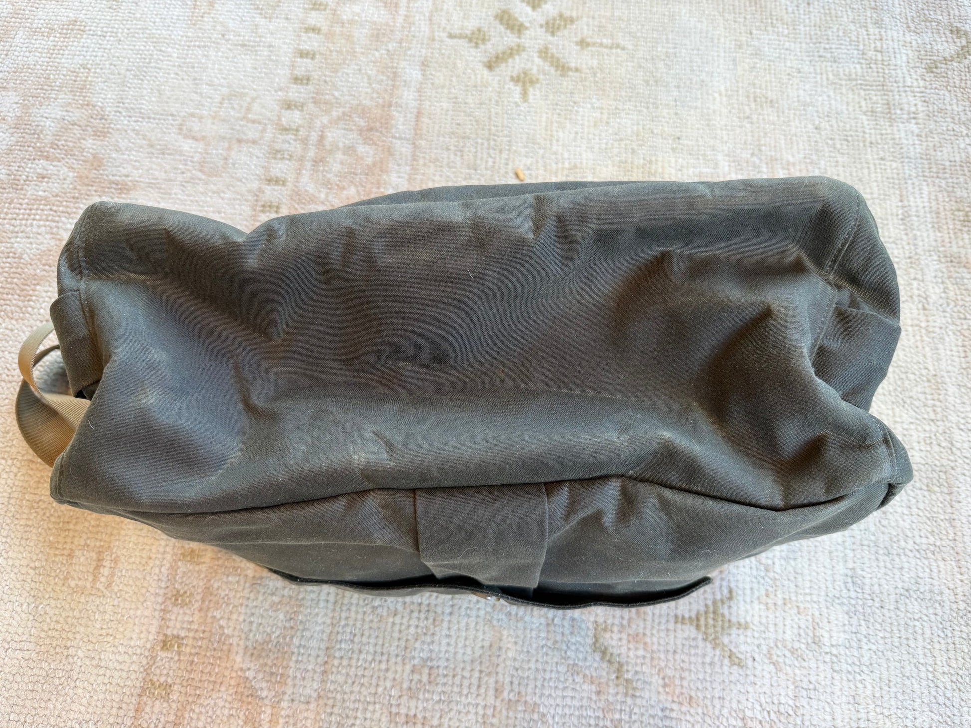 The panel opening zipper opens the top panel on three sides, allowing full visibility easy access to the bag’s contents. Inside the main compartment are two snap-detachable dividers to keep gear organized. The exterior features flap-protected, water resistant Tin Cloth pockets on three sides and stow pockets on the fourth. The removeable webbing shoulder strap is strong enough to carry all the bag will hold, yet flexible enough to conform comfortable to the shape of your shoulder.