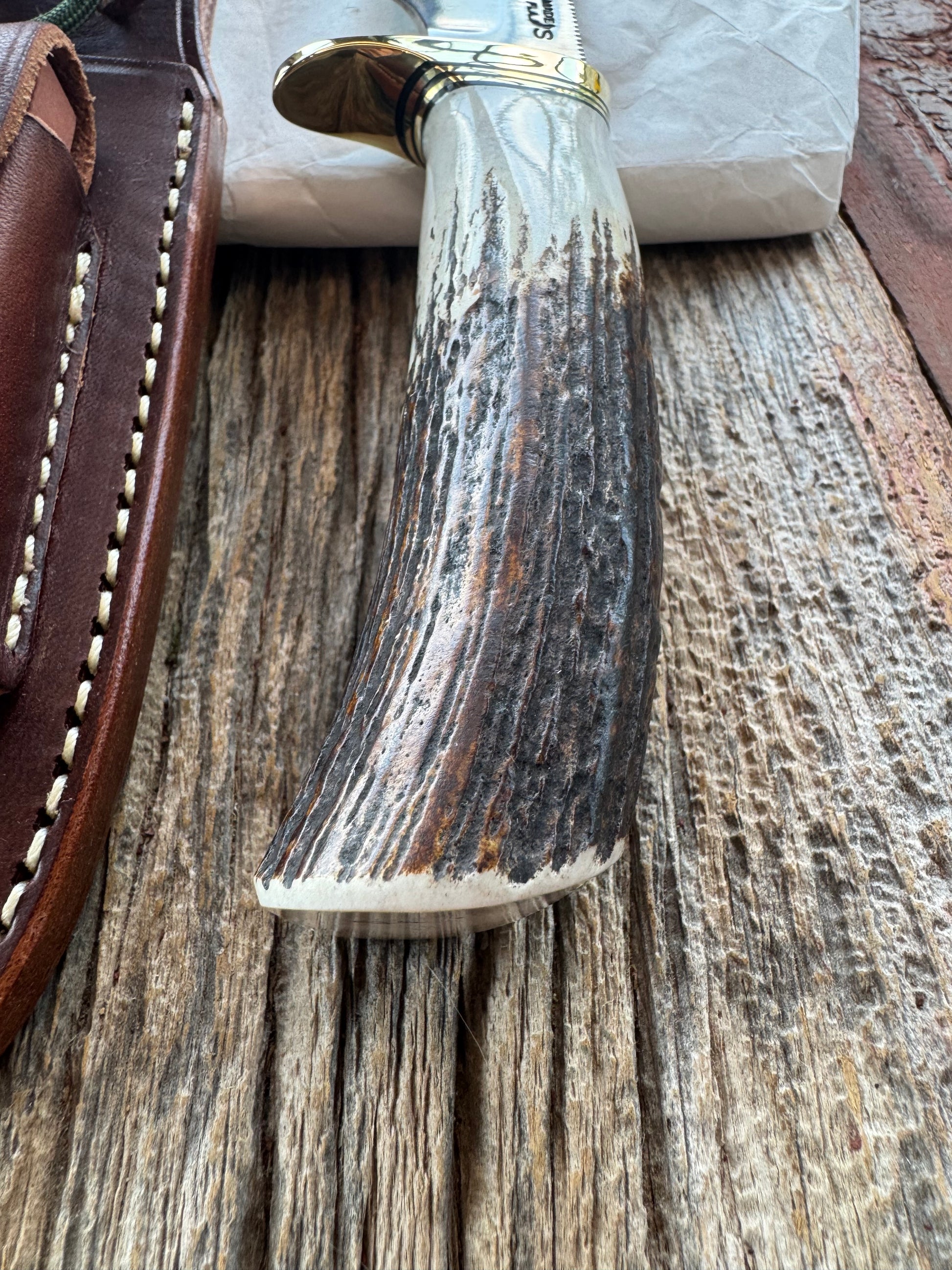 New in paper Randall Model 23 Game Master in Stag with a natural end. Stainless steel blade, Brass Single hilt and Brown leather sheath.