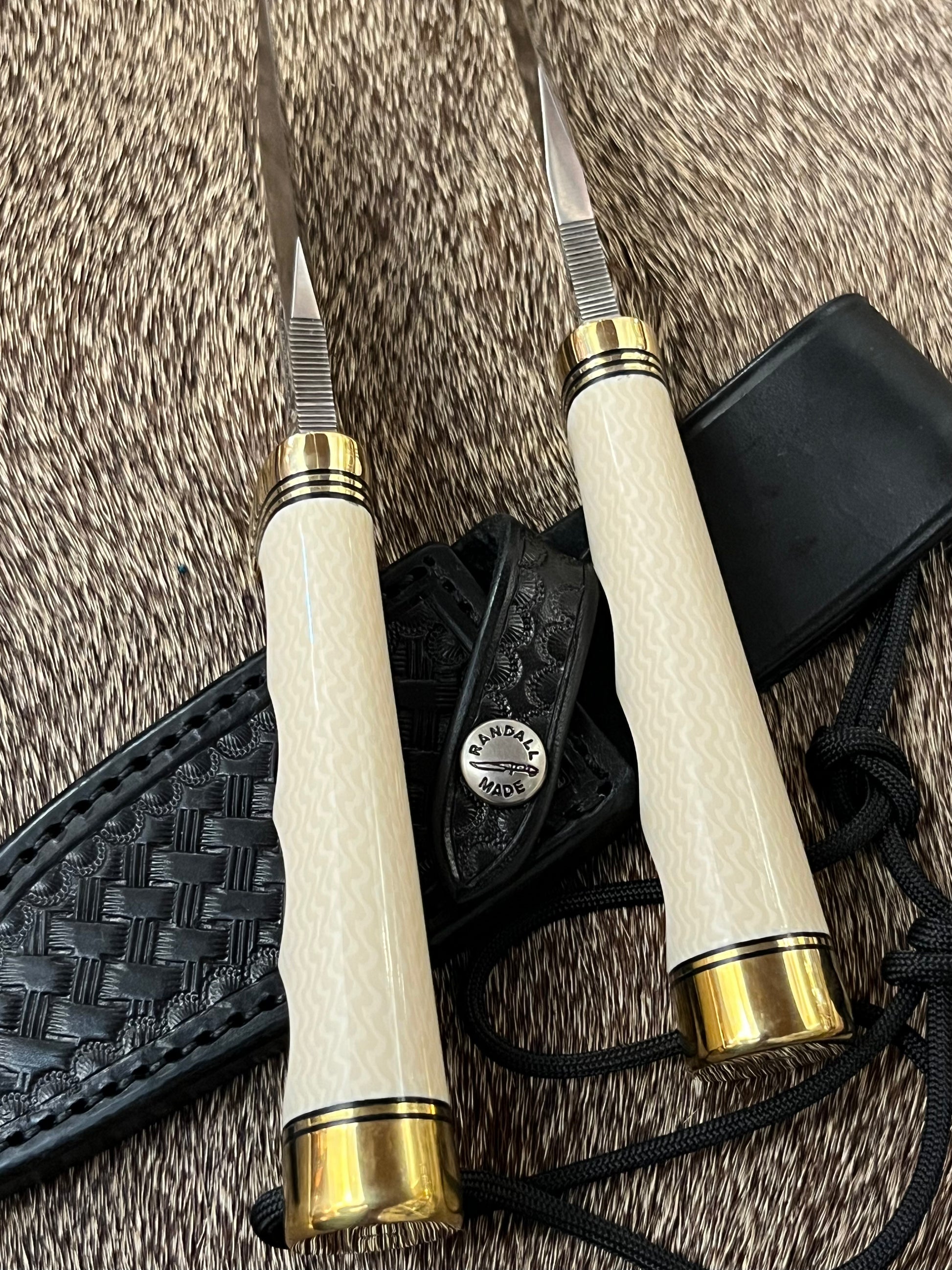 Handles are Finger Grip with David Warthers Resin Ivory R Grade, I choose the R Grade for the Beautiful Grain it Creates, the S is popular for it looks a lot like Ivory, both Beautiful creamy Ivory color