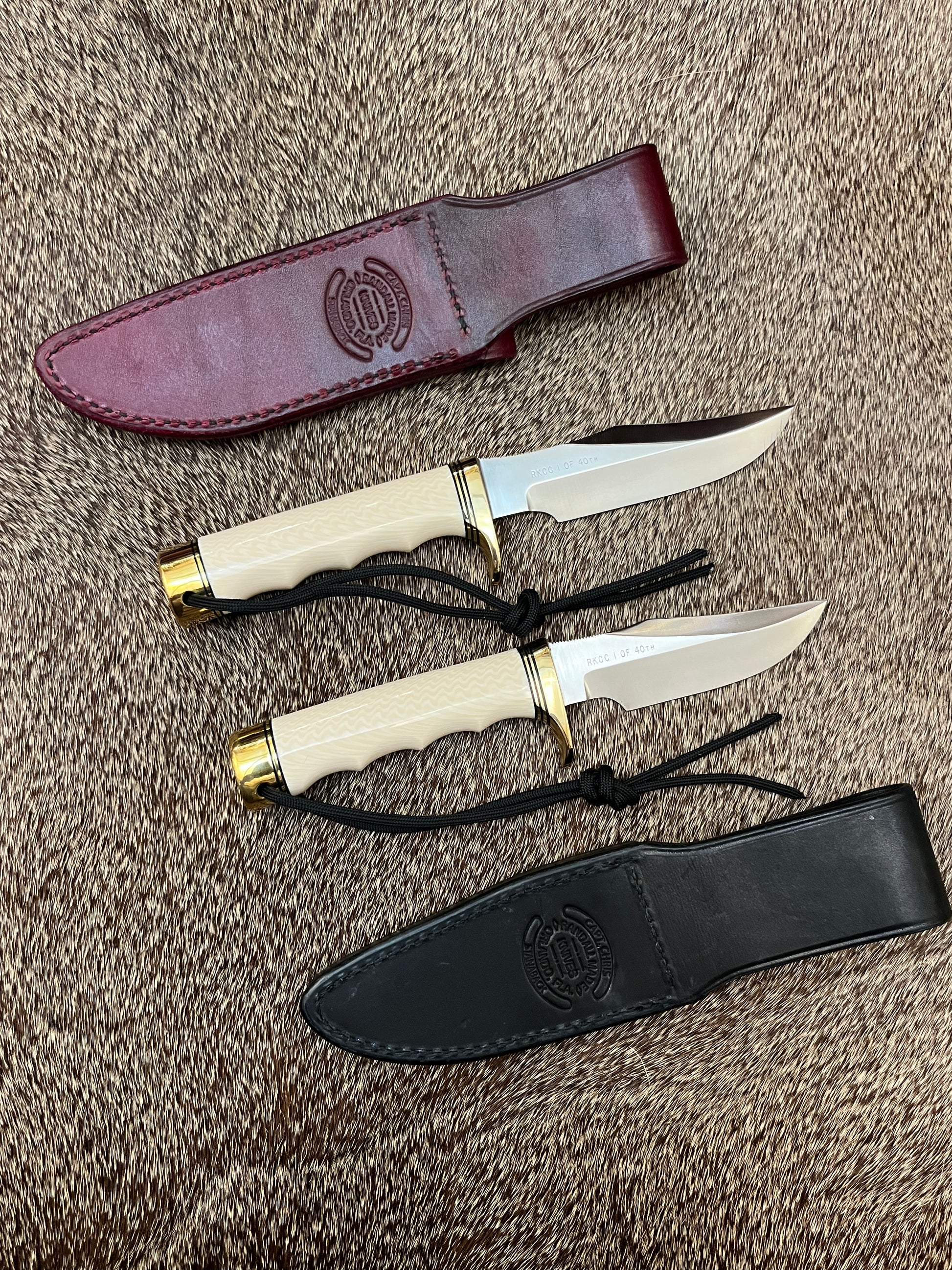 Large knife has a Ox Blood sheath with a E-Z lap Sharper, Small knife has a Black Basket Weave Sheath with a Salmon Sharpening Stone, both are original from Sullivan’s Custom Leather Shop