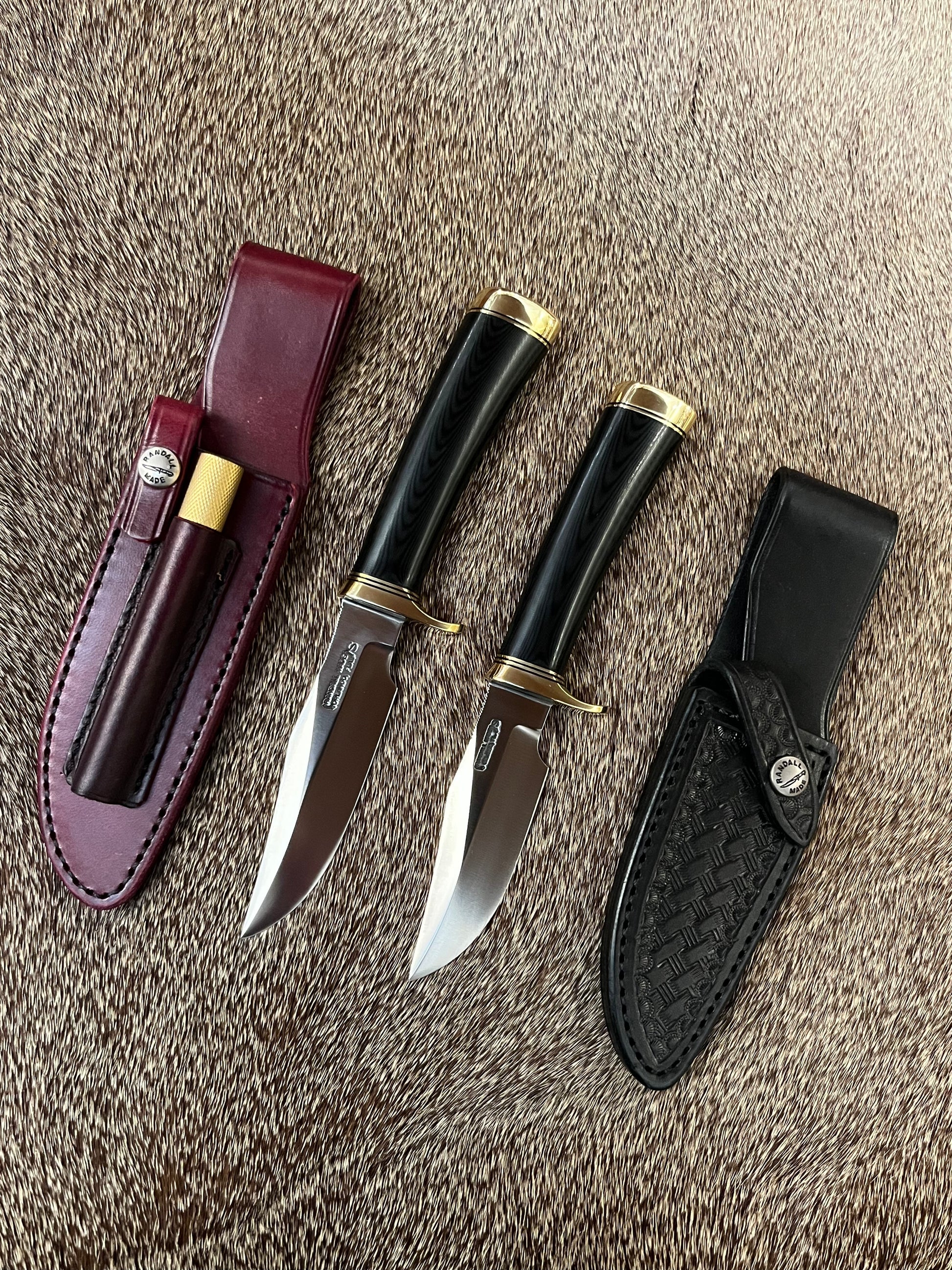Large knife has a Blood Ox sheath with a E-Z lap Sharpener, Small knife comes with a Black Basket Weave sheath, and a Salmon Sharpening Stone, both sheaths are Original and Custom from Sullivan’s Custom Leather Shop
