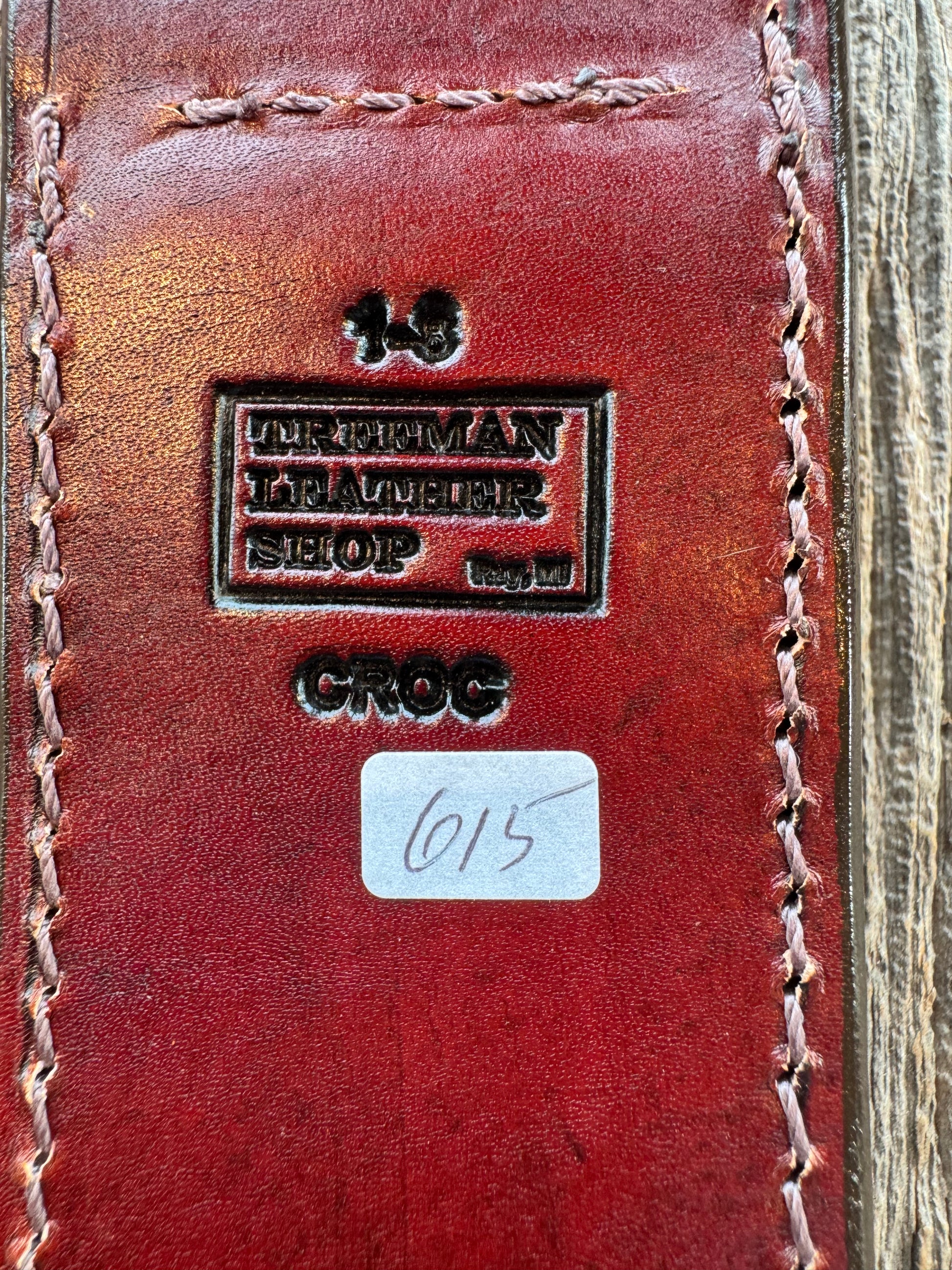 This is a nice Treeman sheath in brown Hornback Crocodile for a model 1-8. It has a unique texture color and pattern. The latest from Rocco with brass stamping on the back and Treeman logo inside a square providing a clean organized look.