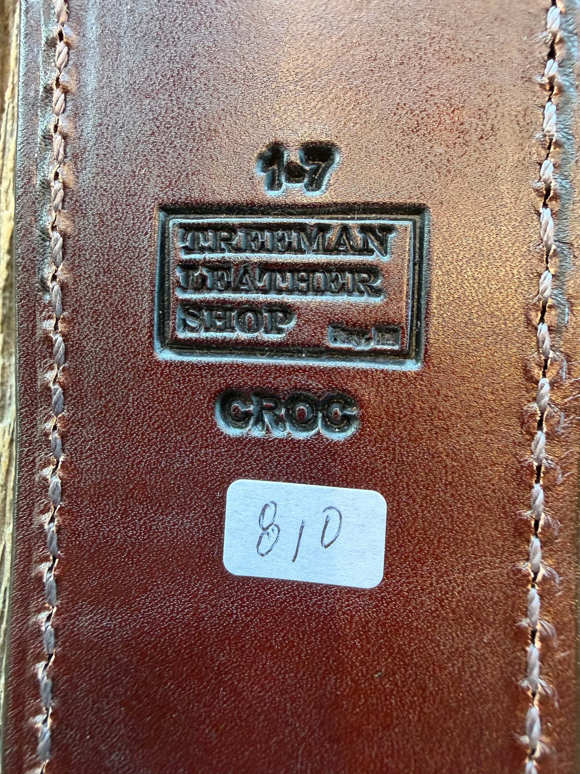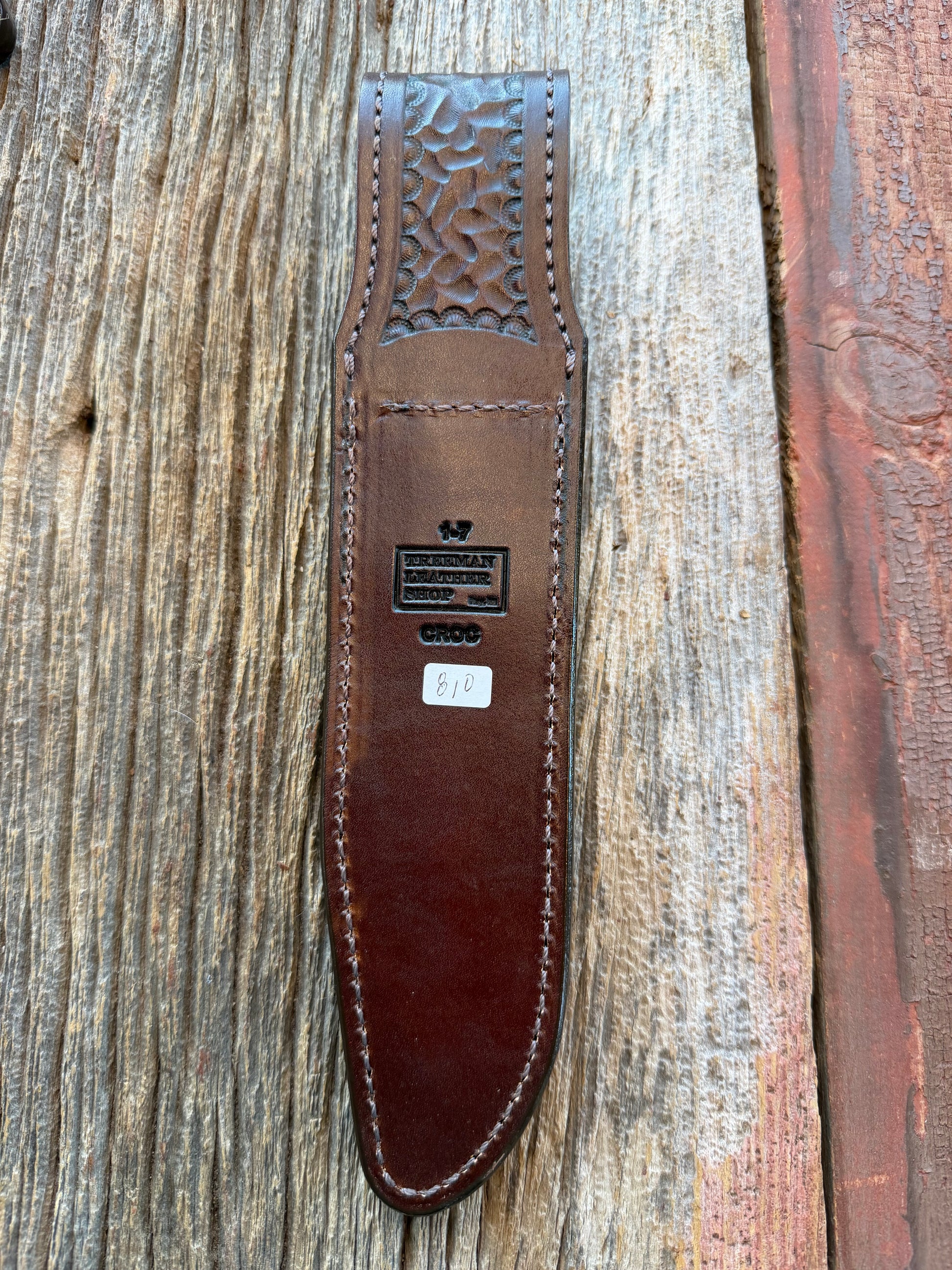 This is a nice Treeman sheath in Army Green Crocodile for a model 1-7. It has a unique texture color and pattern. The latest from Rocco with brass stamping on the back and Treeman logo inside a square providing a clean organized look.