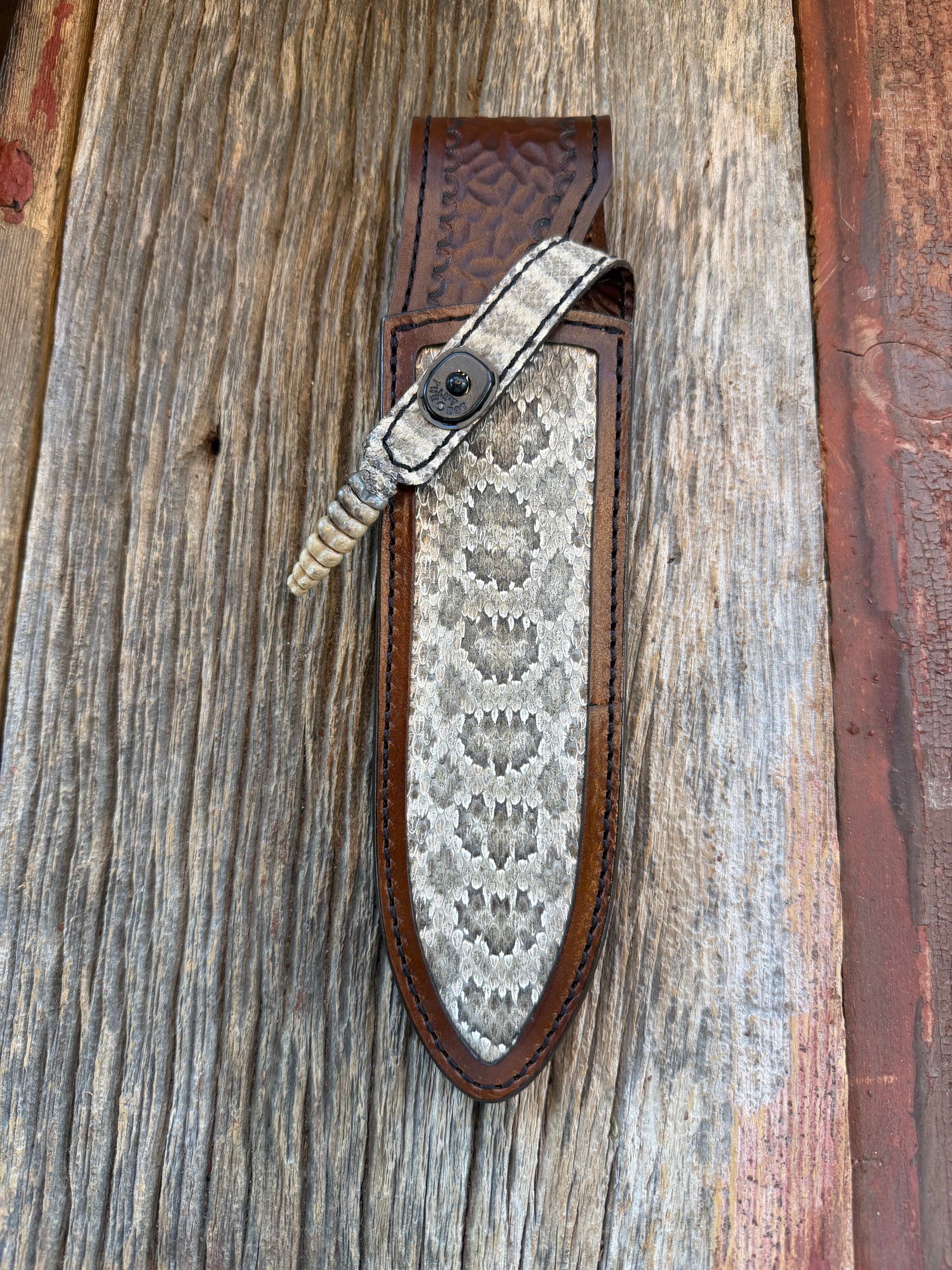 This is a small batch of Prairie Rattlesnake sheaths. It is a very distinctive and vibrant pattern. This one fits a Randall model TC Special knife. It has a unique texture color and pattern. Snake skins that are tanned properly and not paper thin and delicate are not easy to come. Very clean sheath with a border around the edges.
