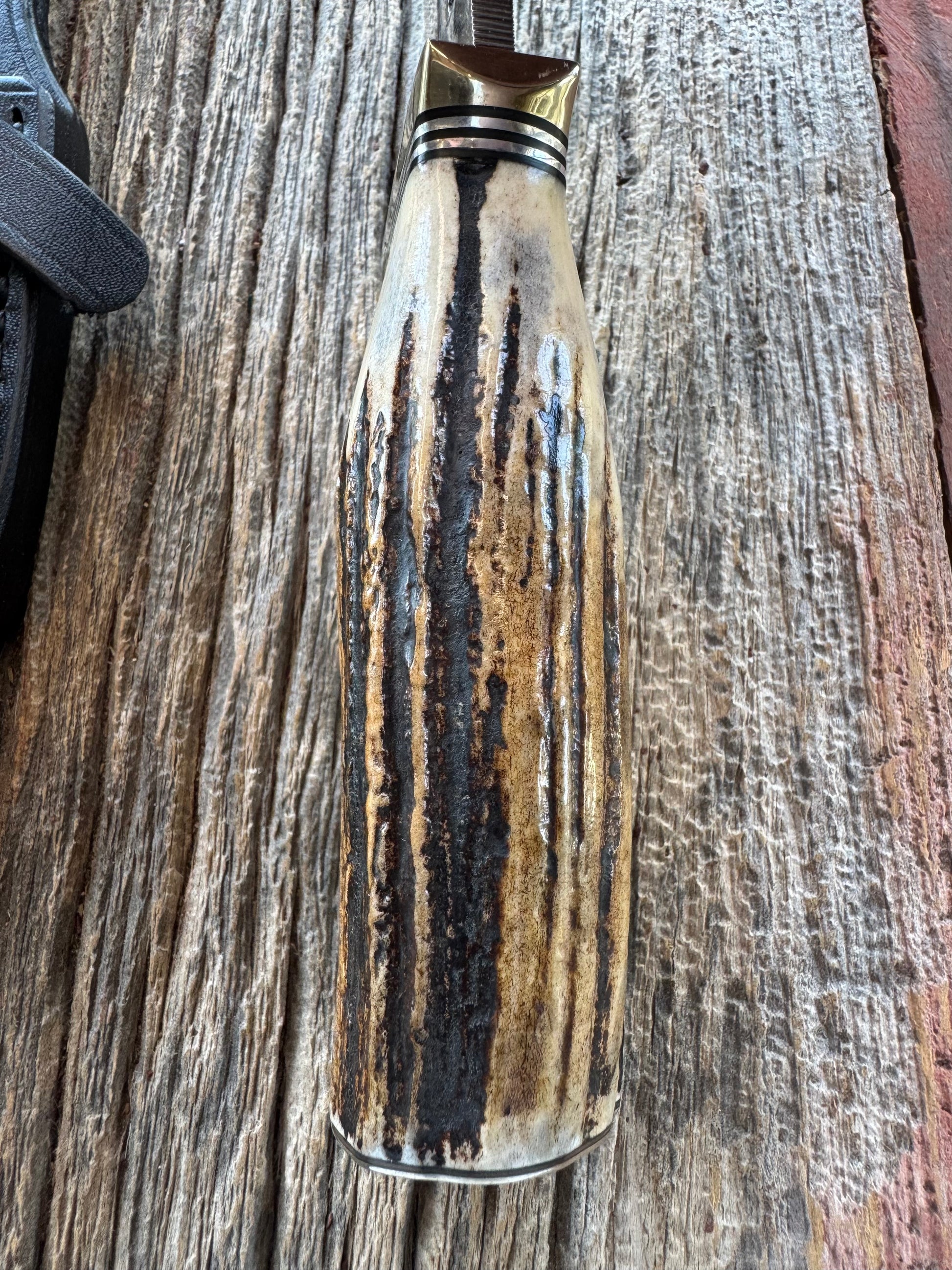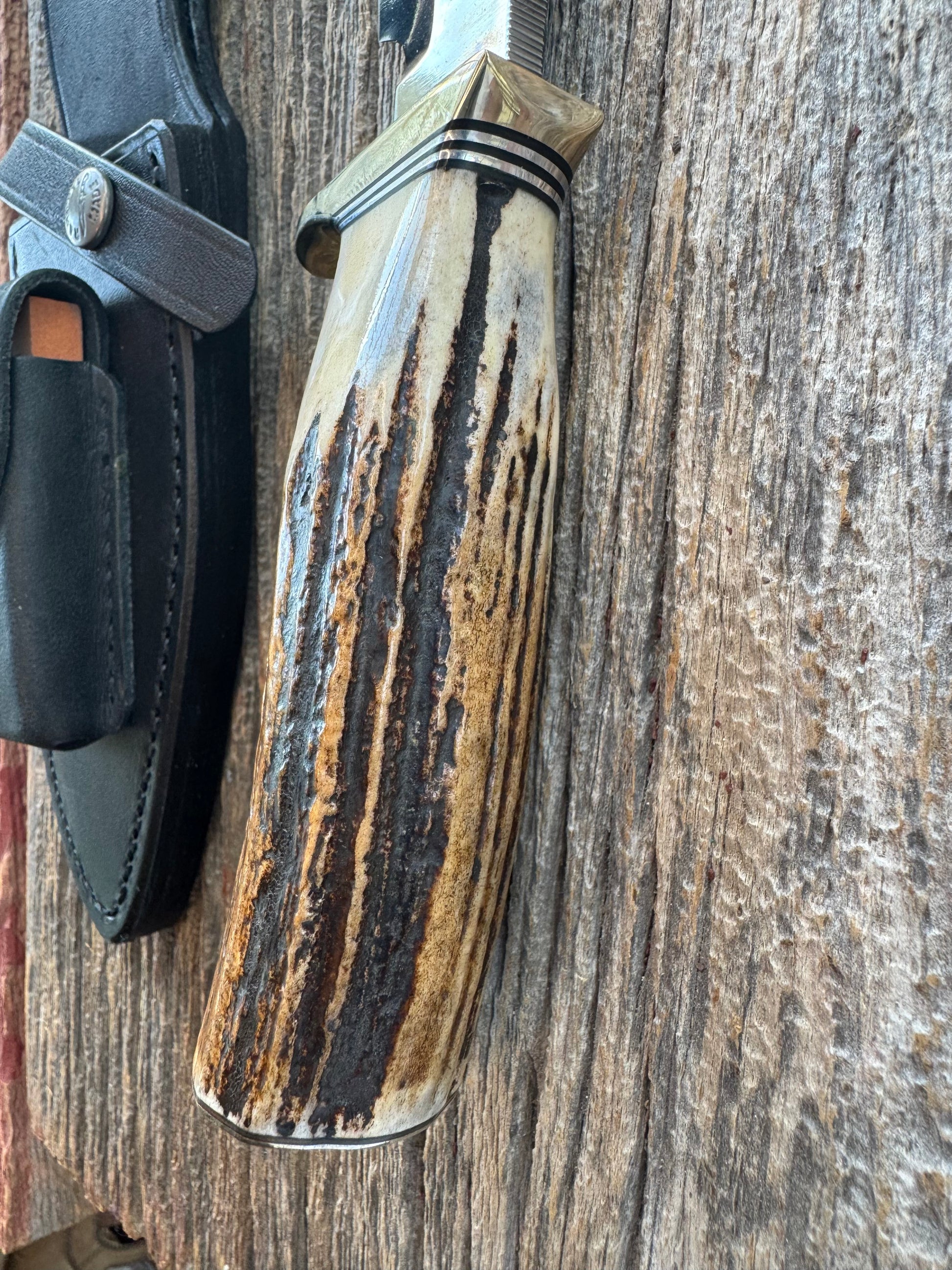 Randall Model 19-5 with a ruff and rustic piece of Stag. Nickel silver Single Hilt and Butt plate.