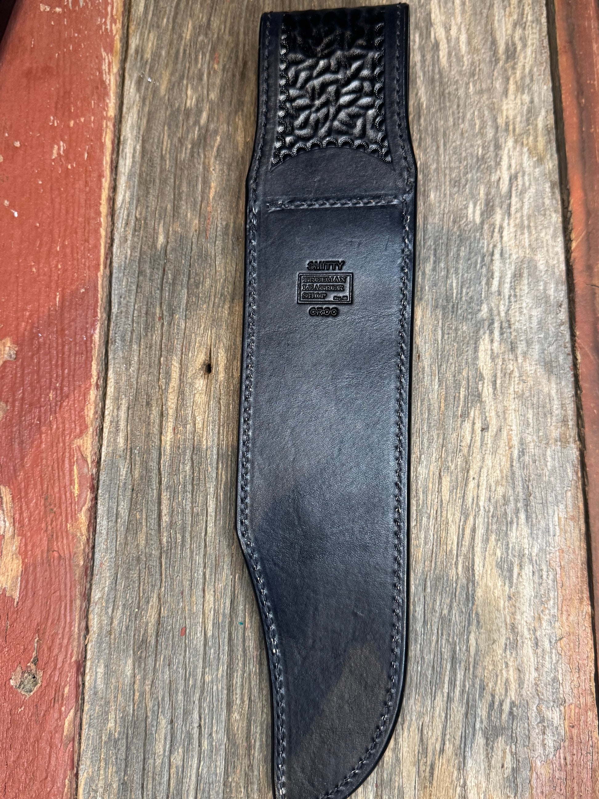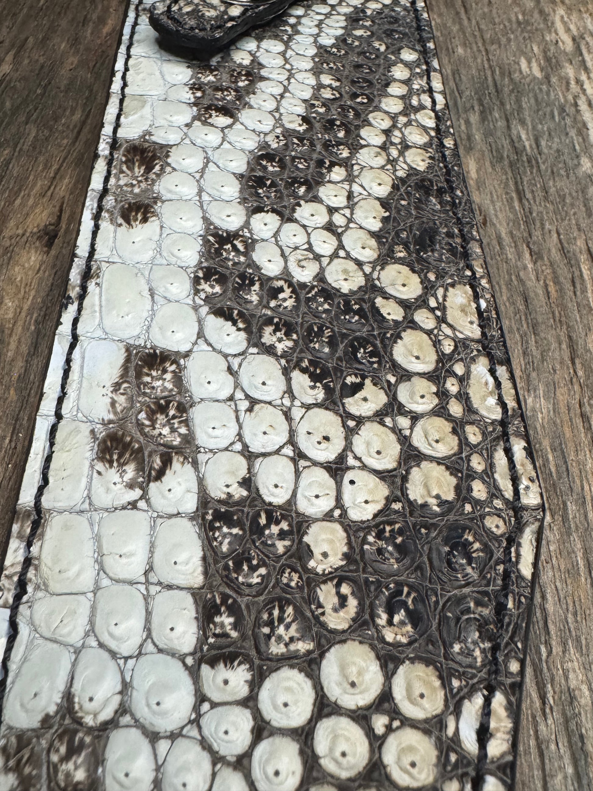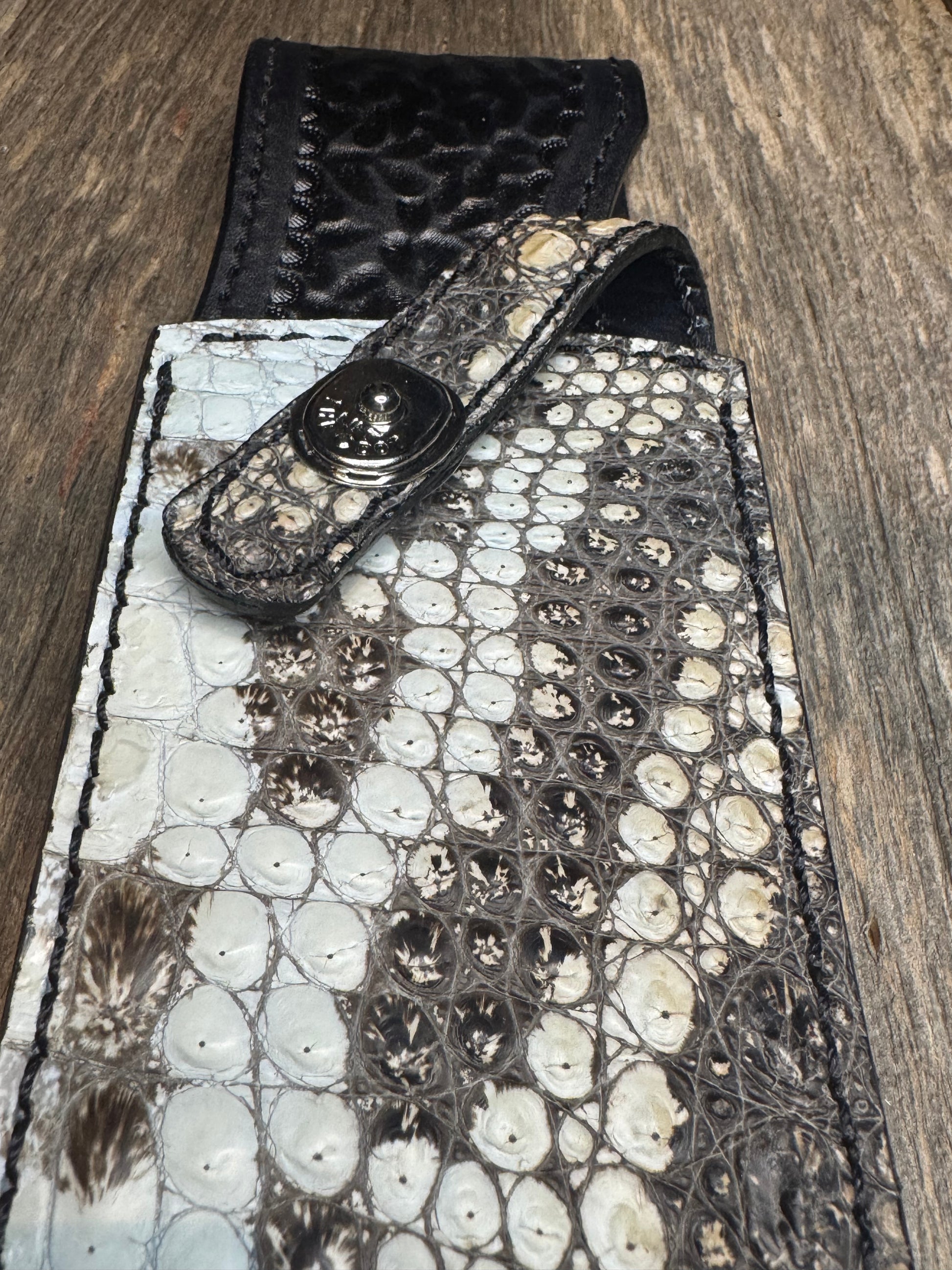 This is a nice Treeman sheath in black and white crocodile skin for a model 12-11 Smithsonian. It has a unique texture color and pattern. The latest from Rocco with brass stamping on the back and Treeman logo inside a square providing a clean organized look.