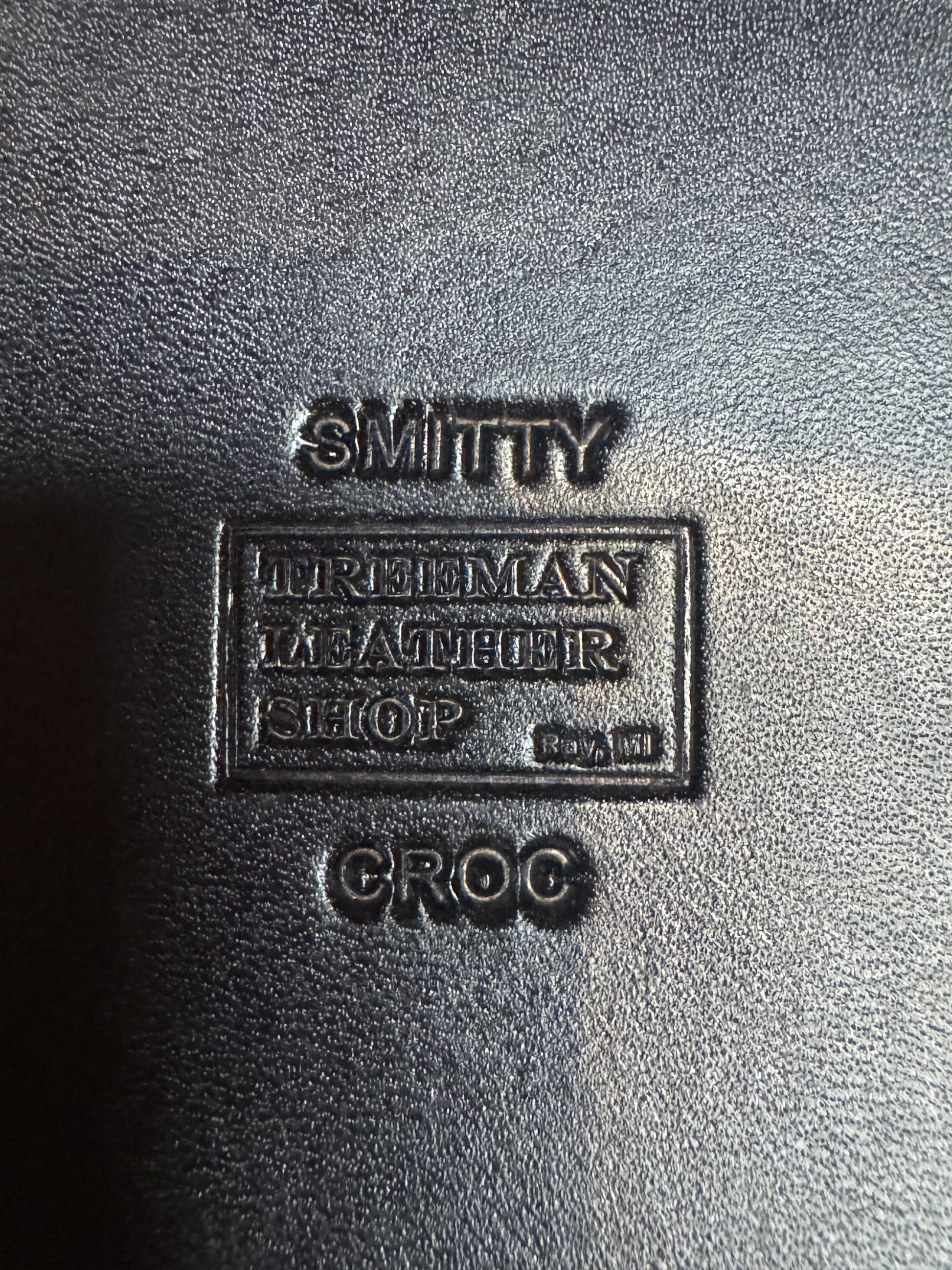 This is a nice Treeman sheath in black and white crocodile skin for a model 12-11 Smithsonian. It has a unique texture color and pattern. The latest from Rocco with brass stamping on the back and Treeman logo inside a square providing a clean organized look.