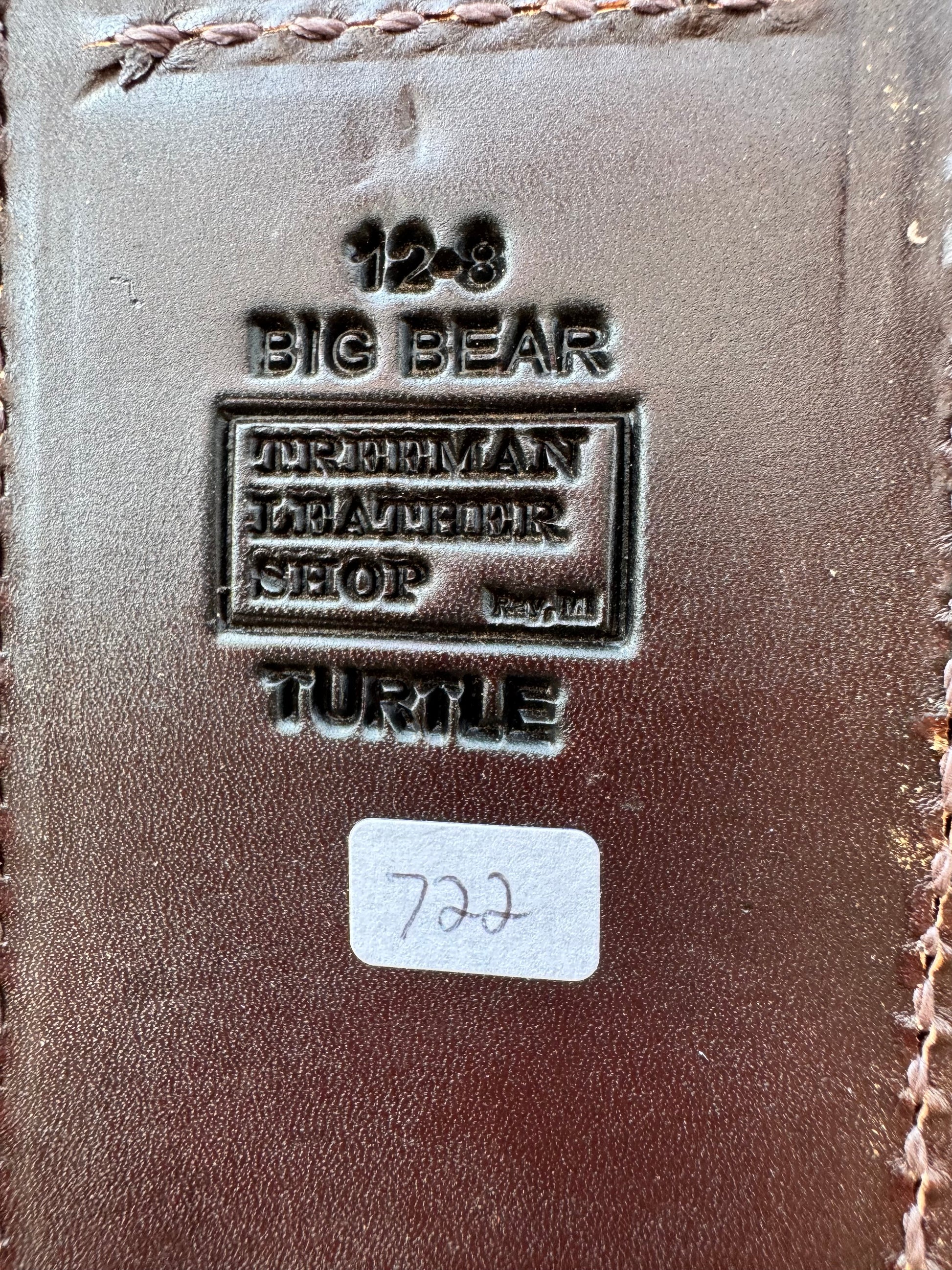 Brian’s most recent batch of Snapping Turtle sheaths turned out exceptional. All brass stamping on the back with a Treeman logo inside the square giving it a clean organized look. Hand tooled belt loops front and back.