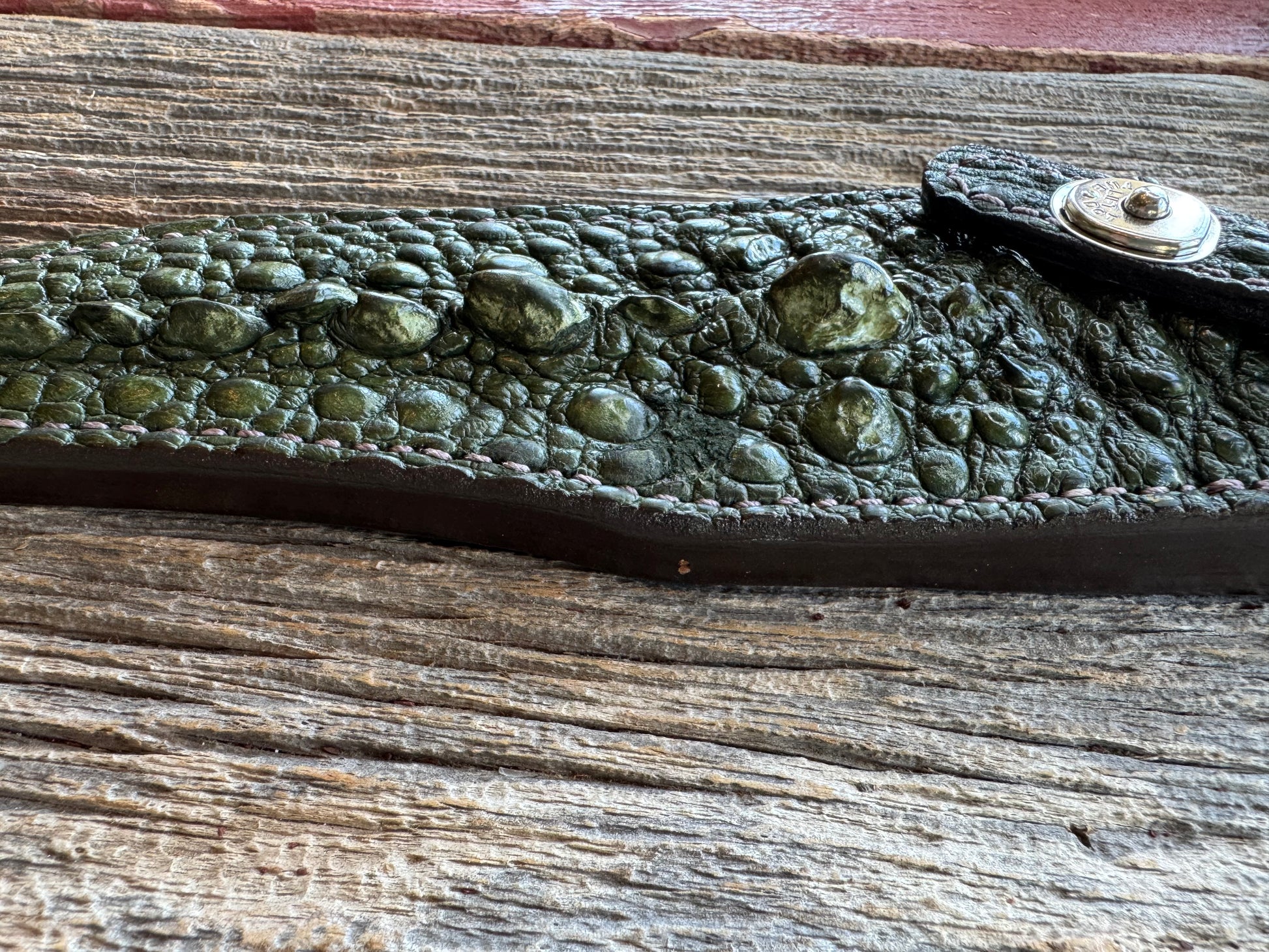 Randall Model 12-8 “Big Bear” Sheath in Exotic Army Green Snapping Turtle by Treeman. Spiked Dragon tail portion of the turtle.