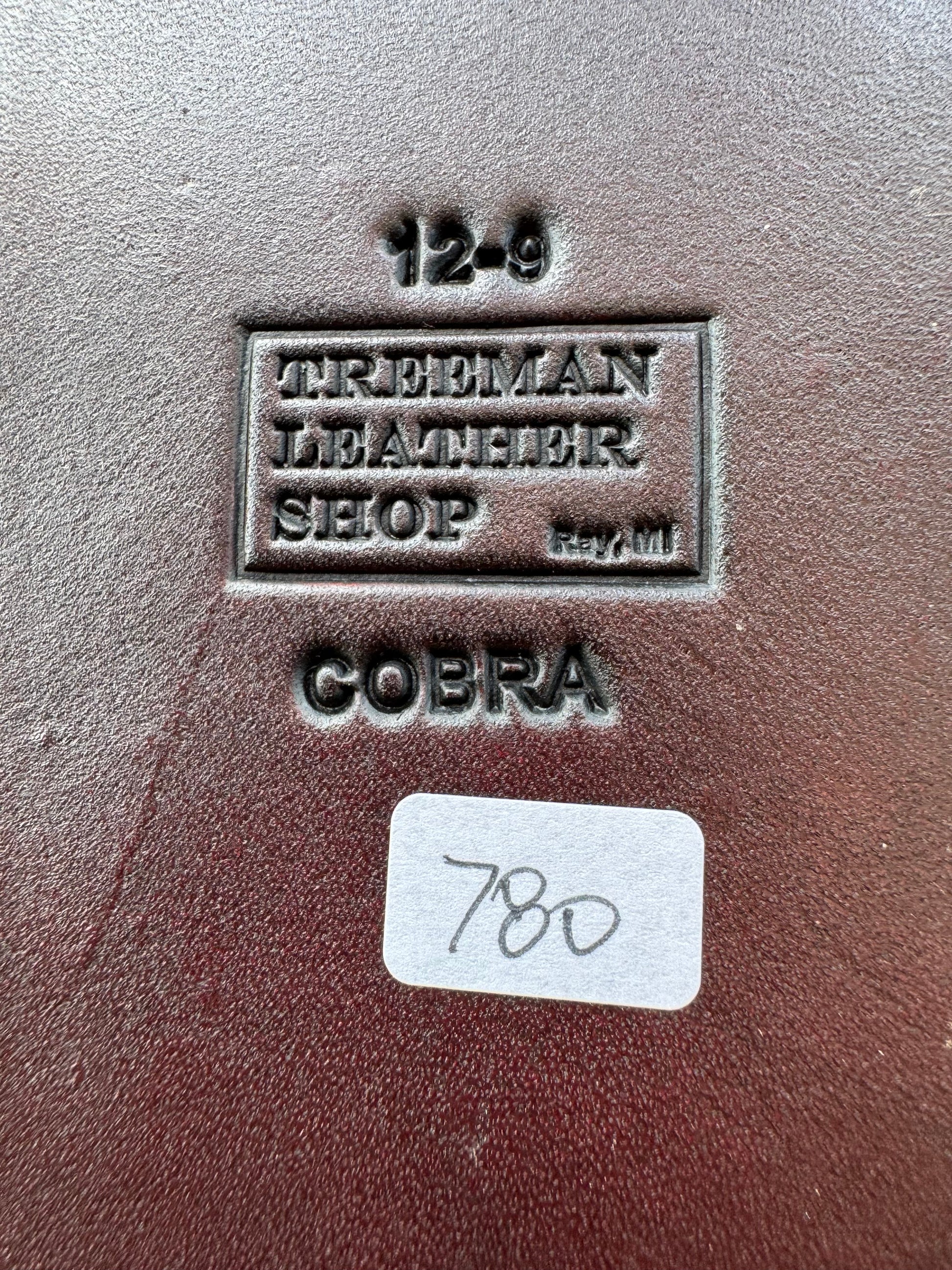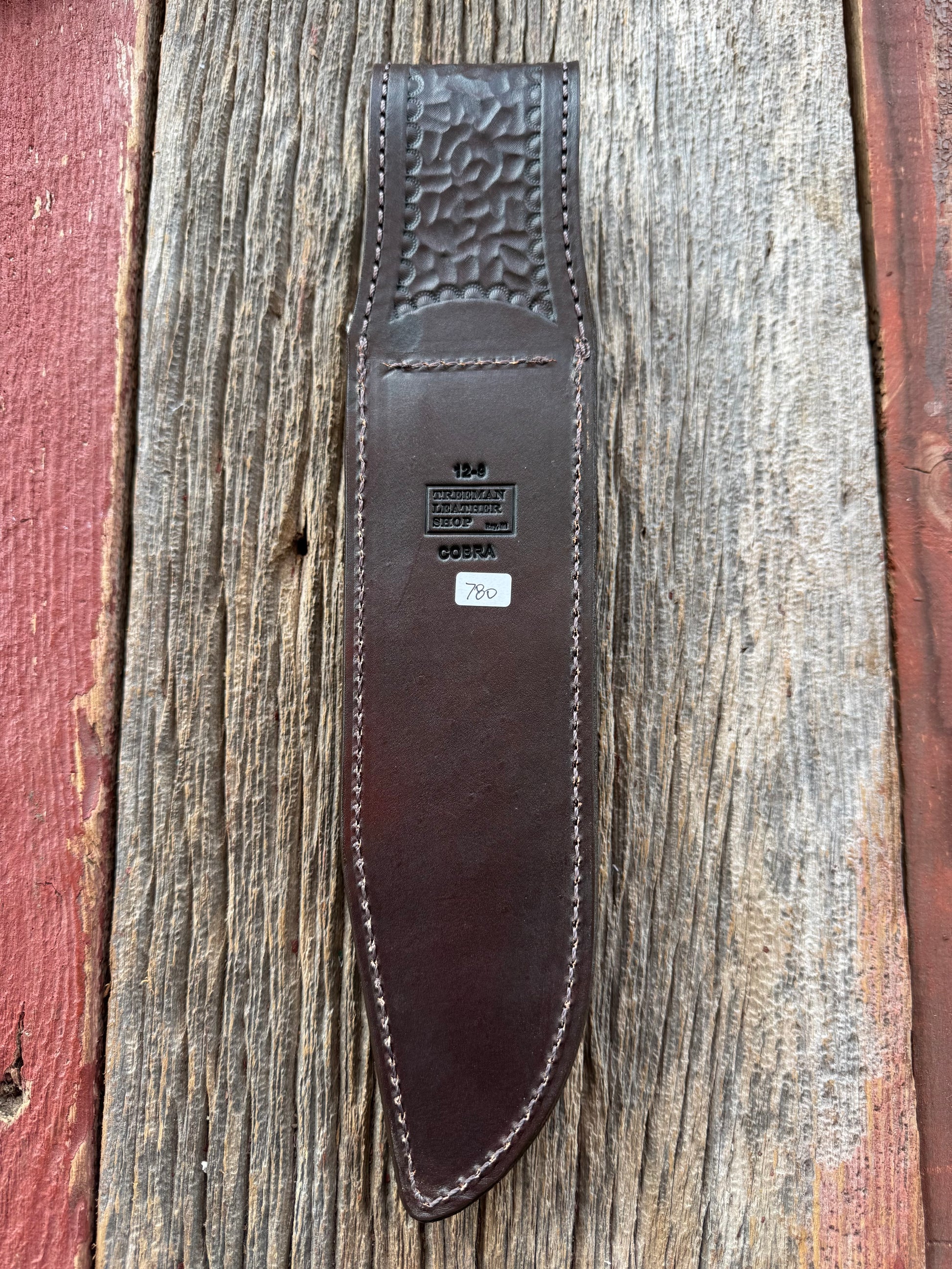One of Brian’s coolest sheaths. Actual Cobra head all original not cut and sewn on. It turned out exceptional. All brass stamping on the back with a Treeman logo inside the square giving it a clean organized look. Hand tooled belt loops front and back.