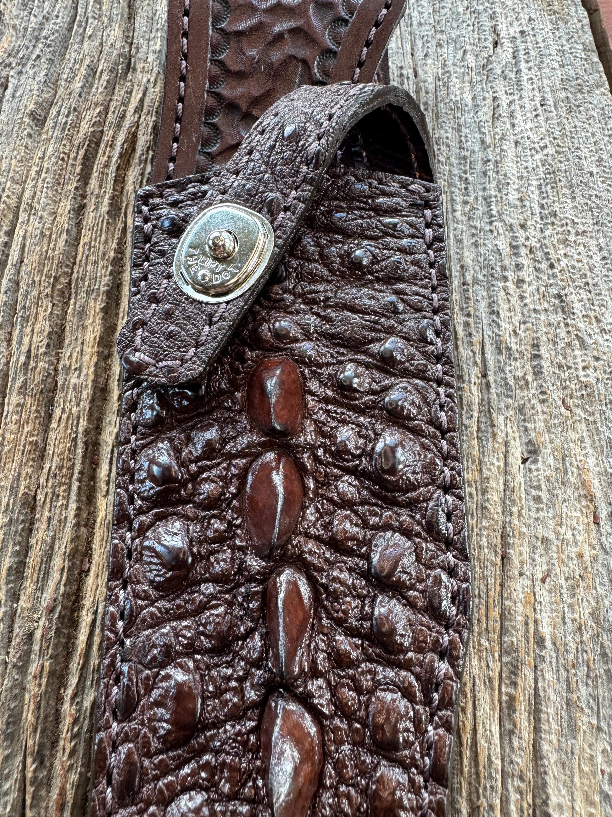Brian’s most recent batch of Snapping Turtle sheaths turned out exceptional. All brass stamping on the back with a Treeman logo inside the square giving it a clean organized look. Hand tooled belt loops front and back.